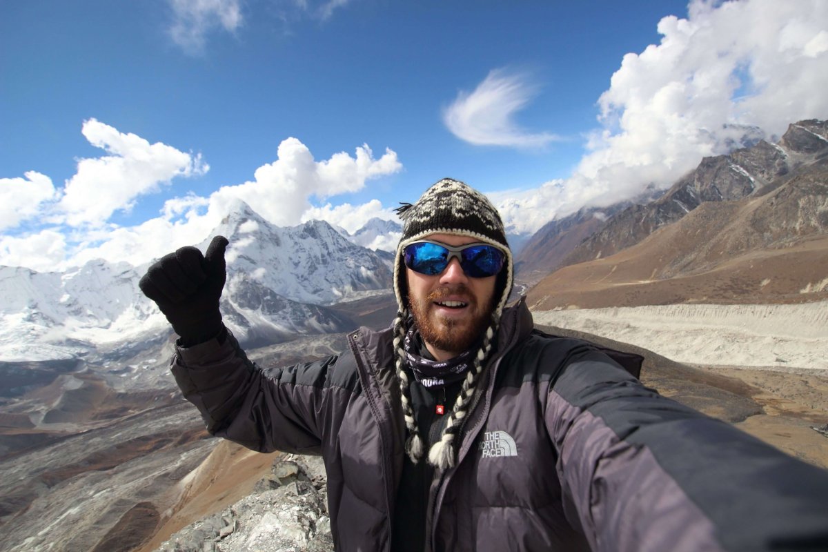 "Kreslím pre istotu do vzduchu veľké X, aby som sa uistil, že Marek chce na dnes skutočne skončiť. Zahreším, lebo rozdelenie sa v horách je mimo scenár, ale tichá dohoda, že sa nikomu nič nestane, musí takto na diaľku stačiť. Navyše som moc lenivý, aby som zišiel tých pár metrov pre druhý objektív, ktorý má v ruksaku. Uisťujem sa ešte, že si pre zostup vyberie „klasickú trasu“, preväzujem topánky a vyrážam do sedla. Nikde ani noha. V sedle ma čaká snáď stovka kamenných mužíkov a nádherný výhľad do údolia na ľadovec Nuptse. Až z tohto miesta sa na severe črtá skutočný vrchol Chhukung Ri a ja zisťujem, že to, o čom som si doteraz myslel, že je vrchol, je len jeden z kamenistých vrcholov masívu. Dopĺňam tekutiny a radšej hneď upalujem hore, kým drží počasie. Od sedla sa terén stáva stále viac exponovaný, kamenné suťoviská striedajú veľké balvany a ja sa začínam tešiť, kedy zapojím ruky. Zastavujem každých 10 krokov a lapám po dychu. Táto výška je bez predchádzajúcej aklimatizácie skutočne cítiť. Mám pocit, že sa posúvam slimačím tempom a začínam mať problém sústrediť sa na výstupovú trasu. Zhruba 50 výškových metrov pod vrcholom vedie cesta cez suťovisko zo šmykľavých kamenných dosiek, preto volím radšej cestu krížom po strmom hrebeni. Posledné metre sú po viac ako 800 metroch prevýšenia pekelné, ale nakoniec som o cca 10:30 na vrchole vo výške 5 550 m.n.m. Chvíľku sa dávam dokopy, fotím panorámy a prvú selfie v živote, potom len tak sedím a sledujem tú nádheru okolo. Cestou dolu sa ešte zdravím s mladíkom, ktorý bude druhý a dnes asi aj posledný na vrchole. Síce moc neverím, že mu vydrží počasie kým sa dostane hore, ale vtipkujeme a vzájomne si prajeme veľa šťastia. Zostup si užívam, rozmýšľam aké jedlo si v lodgii objednám a s klesajúcou nadmorskou výškou si začínam vychutnávať eufóriu z výstupu na svoj prvý himalájsky štít".