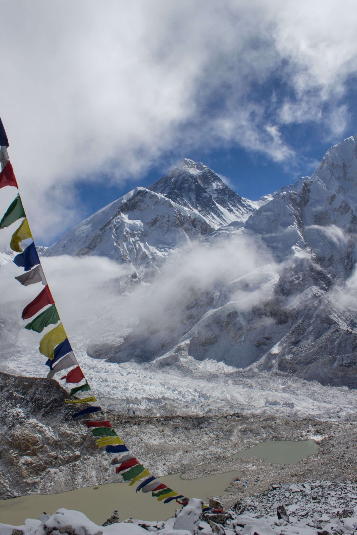 Samotný Everest však nevidíme, a neuvidíme ho ani z Goraku. Zakrýva ho stena Nuptse so svojou výraznou špičkou vo výške 7 846 m n.m. V tibetčine Nuptse znamená „Západný štít“ a hora je vlastne pokračovaním masívu Lhotse, štvrtej najvyššej hory sveta. Lhotse, 8 516 m nm., má mohutnú tritisíc metrovú južnú stenu, ktorá roky odolávala najskúsenejším horolezcom sveta. Podarilo sa to až v roku 1984. Osem kilometrov západne od Everestu sa týči do výšky 7 161 m n.m. majestátna pyramída Pumori a podobne ako Everest, vyznačuje hranicu medzi Nepálom a Tibetom. Názov tejto hory znamená v jazyku šerpov „Nevydatá dcéra“. Kúsok od Pumori sa nachádza, oproti okolitým velikánom malý kopček, Kala Patthar. V mapách väčšinou označovaný s výškou 5 545 m n.m. Talianski vedci a moje hodinky však potvrdzujú výšku 5 640 m n.m, a tým sa tento vrch stáva aj najvyšším bodom na našom treku. Ide vlastne o vrchol južného hrebeňa Pumori a vďaka svojim výhľadom na vyššie spomínané vrchy je obľúbeným vyhliadkovým vrcholom pre všetkých trekerov. Nemôžeme ho preto vynechať ani my.