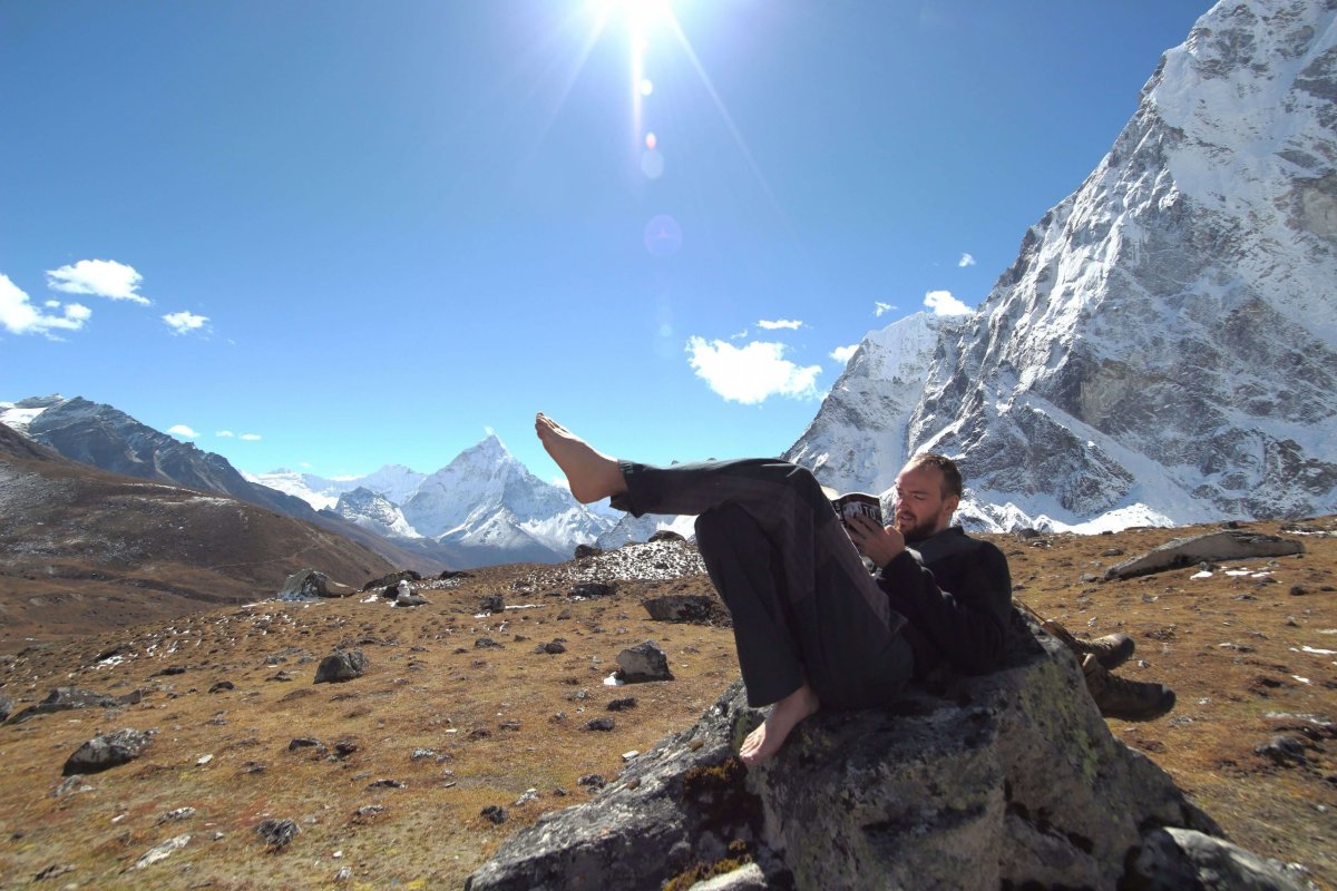 Dzongla leží v úzkom studenom údolí, kde sa nachádzajú asi tri lodžie, nad ktorými sa týči výrazná šesťtisícovka Cholatse. Je to naša posledná zastávka pred priesmykom Cho La, a tak si tu doprajeme jeden odpočinkový deň. Počasie je od rána krásne a v diaľke vidíme aj majestátny Pokhalde, ktorý akoby kraľoval nad celým okolím. Dnes naozaj nič nerobíme. Vyhrievame sa na slniečku a čítame knihy. Michal si vybral knižnú predlohu len nedávno natočeného filmu Everest, Into Thin Air, o dovtedy najhoršom nešťastí v roku 1996, kedy kvôli náhlej zmene počasia zahynulo pri výstupe na Everest osem horolezcov. Naozaj motivačná literatúra. Film som videl v predpremiére len týždeň pred odchodom do Nepálu, a tak mám niektoré scény stále v čerstvej pamäti. Ja si vyberám trochu príjemnejšiu tému. Knihu od známeho dobrodruha Beara Gryllsa o jeho úspešnom pokuse o zdolaní Everestu.