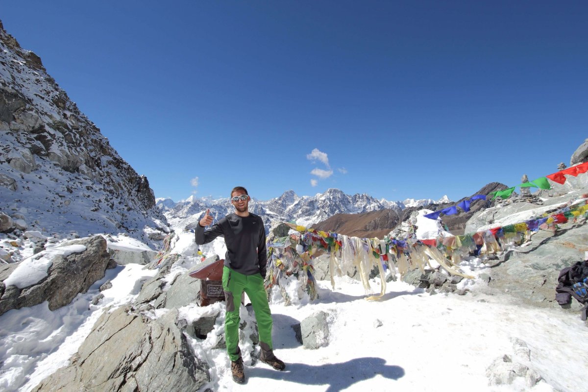 O siedmej hodine sme už na treku a opúšťame Dzonglu. Asi pol hodinu pred nami vyrazila rovnakým smerom aj izraelská skupinka. Tú po chvíli vidíme v diaľke a svojim pohybom nám vytyčuje trasu. Netrvá dlho a prekračujeme hranicu 5000 m. Tu sa už začína objavovať čoraz viac snehu a ľadu. Ten je skrytý pod snehom, a preto si treba dávať pozor. K správnej trase výstupu nám dopomáhajú aj kamenní mužíčkovia, ktorí sú postavení popri treku na veľkých balvanoch. V tejto časti trasy je stúpanie prudké a náročné. Po ceste si vychutnávame rozhľady na himalájskych velikánov. Dorazili sme do sedla. Prechádzame cez snehové polia a okolo malého ľadovcového jazera. Snehu je občas aj dobrých 20 cm, preto sa snažíme chodiť po vyšliapanom chodníku. Ten je často veľmi úzky, pokrytý ľadom, situovaný na kraji priepasti. Také mačky by tu určite neboli na zahodenie, no vystačujeme si aj s trekkingovými paličkami. Bez nich by sme niekedy len ťažko zabránili pošmyknutiu. Po takmer troch hodinách náročného, ale dobrodružného putovania. sme na vrchole priesmyku vo výške 5 420 m n.m. Otvárajú sa nám výhľady na zapadnú stranu - do údolia Gokyo. Už na prvý pohľad je táto časť Himalájí oveľa suchšia, s takmer žiadnym snehom a kopcami pripomínajúcimi sopky.