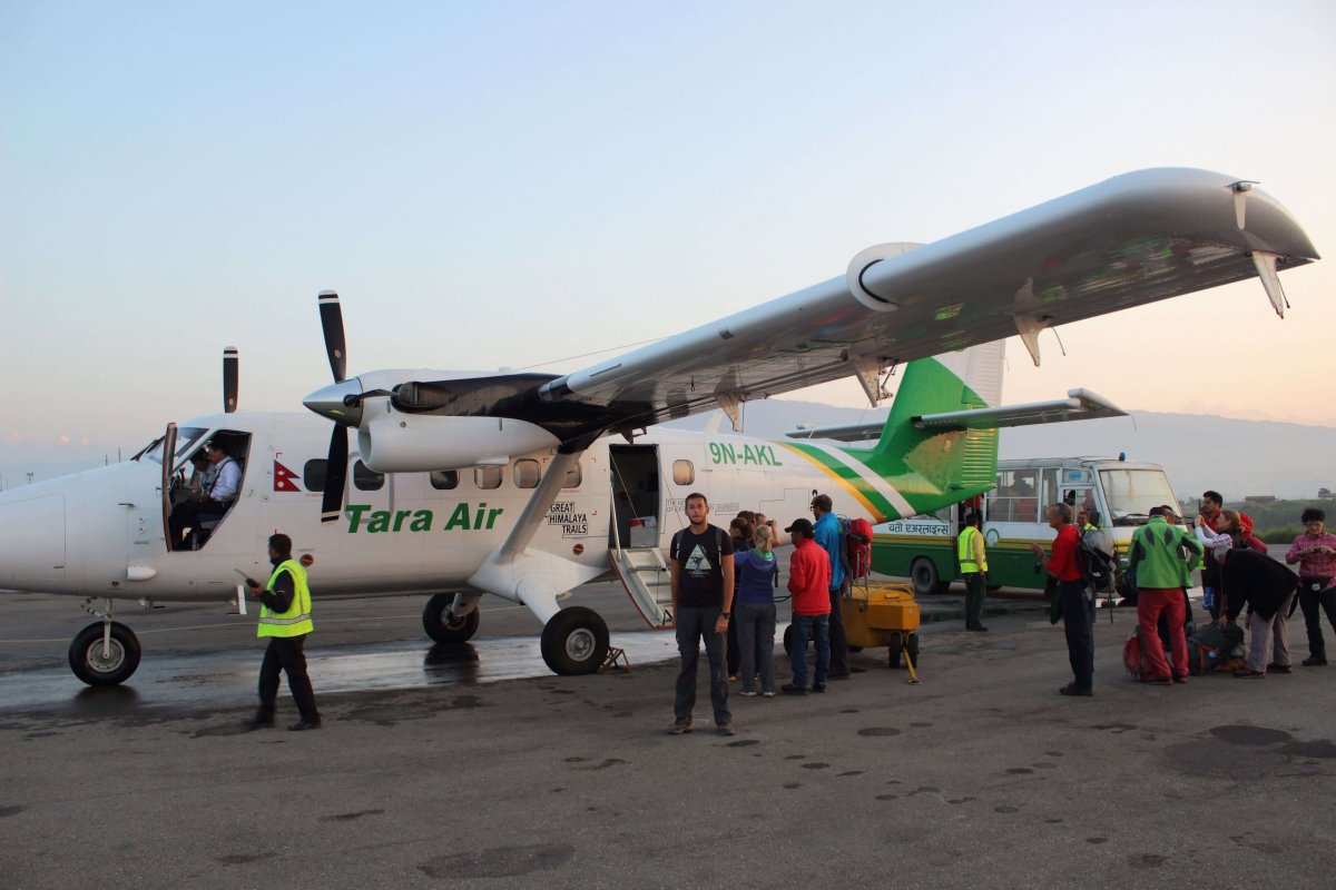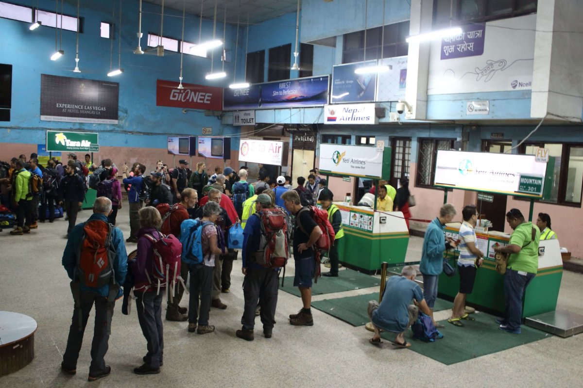 O štvrť na šesť prichádzame na terminál pre vnútroštátne lety. Letieť máme prvým letom o 6:15 h. Keďže tu letový poriadok nemá príliš veľkú váhu, je otázne, kedy naozaj odletíme. Zjednávame cenu za taxík na polovicu a demontujeme batožiny zo strechy. Odbavovanie je trochu chaotické, ale bez väčších problémov ho zvládame. Vážime batohy, aj príručnú batožinu, prejdeme cez policajnú kontrolu, ktorú riadia vojaci a už stojíme v odletovej hale. Sme tu našťastie v predstihu, v ruke máme palubné vstupenky, z ktorých ale aj tak nepoznáme, ktorým lietadlom to vlastne letíme. Na obrazovke beží zoznam letov, každý deň pustia asi rovnakú Powerpointovú prezentáciu. Časom odletov sa nedá moc veriť. Koniec koncov, ani leteckej spoločnosti. Letenky sú písane na Yeti Airlines, no nakoniec budeme letieť Tara Air.