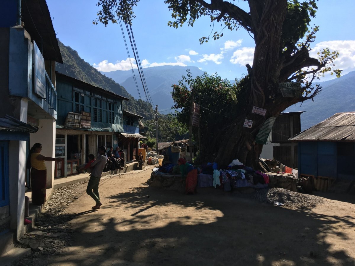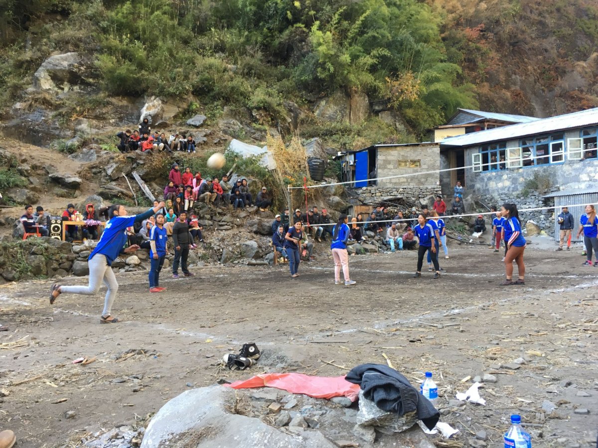 Po příchodu do Dharapani jsme svědky probíhajícího volejbalového zápasu dívek. Odkládáme batohy a přidáváme se k fandění společně s celou vesnicí, pro kterou jde o sportovní utkání týdne.