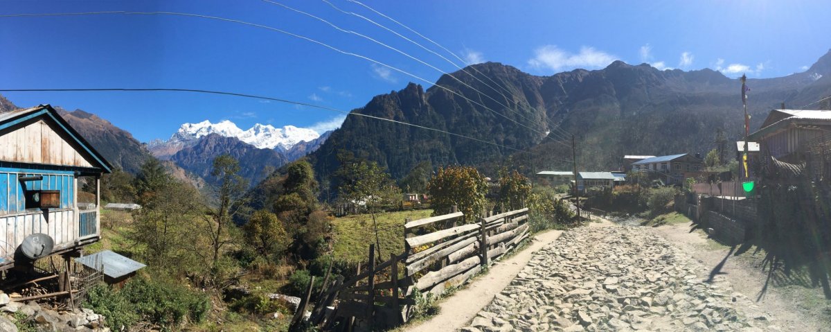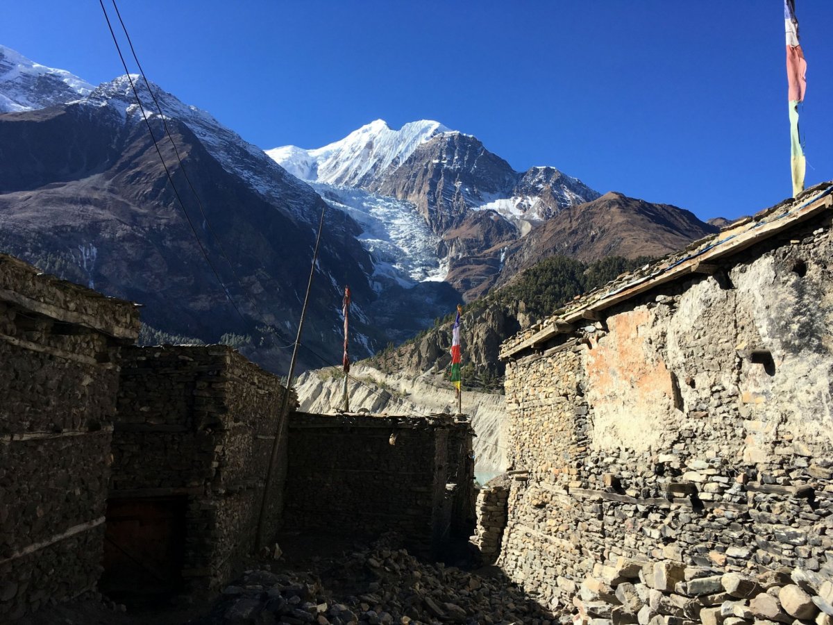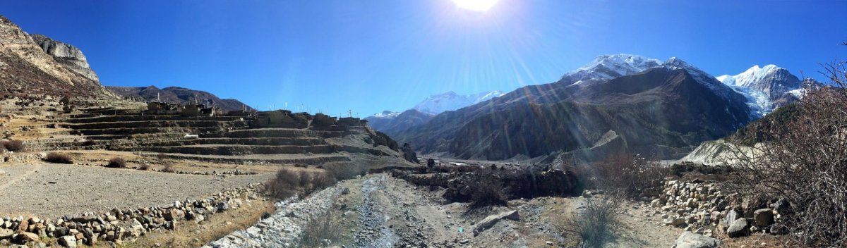 V půli úseku do Pisang si dopřáváme pauzu v okolí, které se během posledních pár let snaží firma Agro Manang přeměnit v zemědělskou půdu. Ve výšce téměř 3000 metrů nad mořem pěstují brambory a jablka. Necháváme za sebou jablečný sad s malými stromy a znovu se kocháme výhledy, které jsou den ode dne hezčí. Paní domu nám předešlý večer kladla na srdce, ať se spíš než do Lower Pisang vypravíme do Upper Pisang. Během cesty míjíme vybydlenou vesnici se starými kamennými domy. V podobném duchu stojí i domy v Upper Pisang.