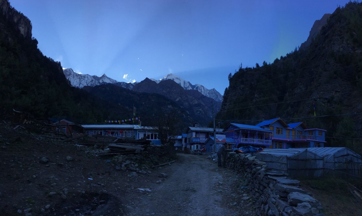 Z Humde do Manang to není daleko. Dlouho se rozhodujeme pro ubytování, nakonec vcházíme do hotelu Gangapurna. Nedokážeme se přimět k tomu, abychom vylezli z vyhřátých spacáků. Později u večeře znovu vidíme známé tváře z předchozího večera s Češkou Andreou v čele.