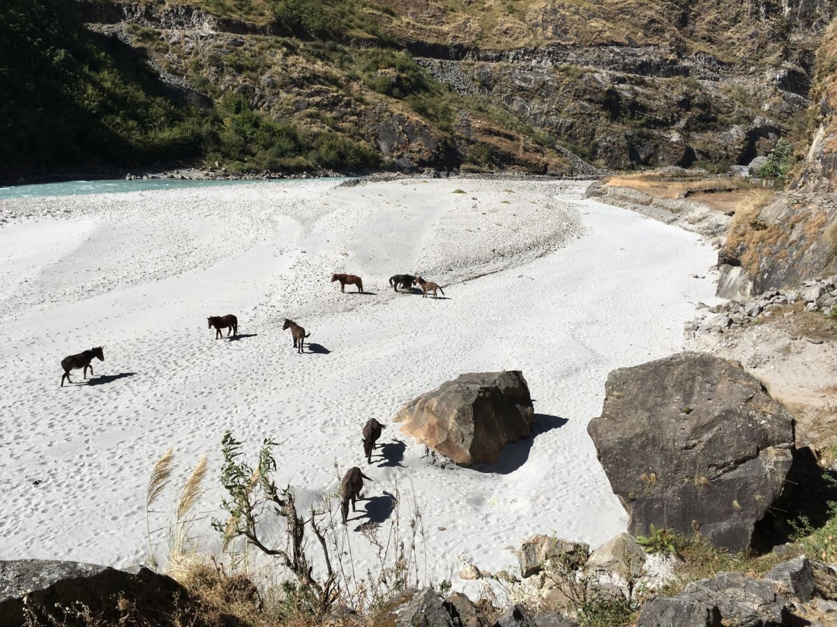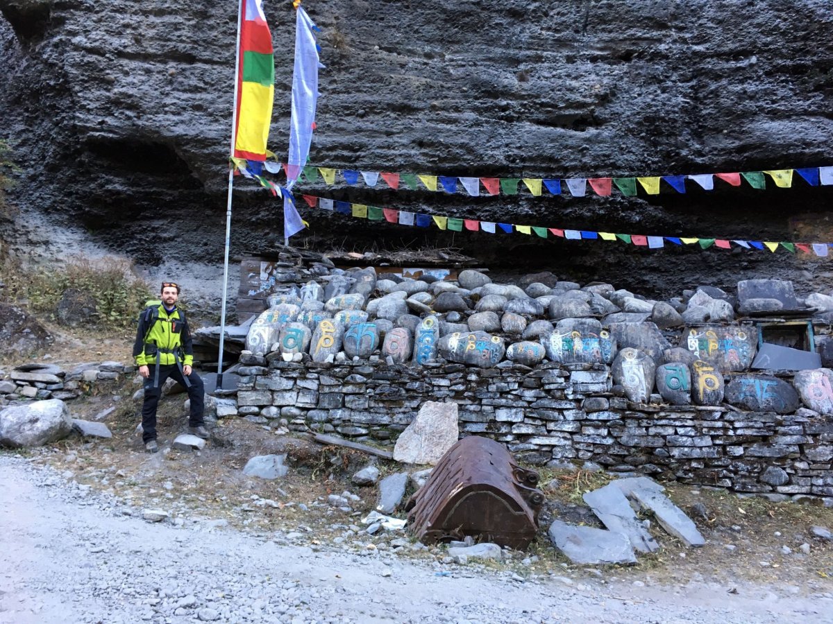 Přes den chodíme stále ještě v krátkých kalhotách. Jakmile ale zapadne slunce, teplotní skok je citelný. Vlezlý chlad bývá i po ránu. Po cestě míjíme spoustu buddhistických svatyní, modlitebních mlýnů a kamenných valů pomalovaných mantrami. Z Chame nás ještě tři kilometry za vesnici doprovázejí tři potulní psi. Pořád narážíme na prašnou krajinu s cestou, po které jezdí džípy.