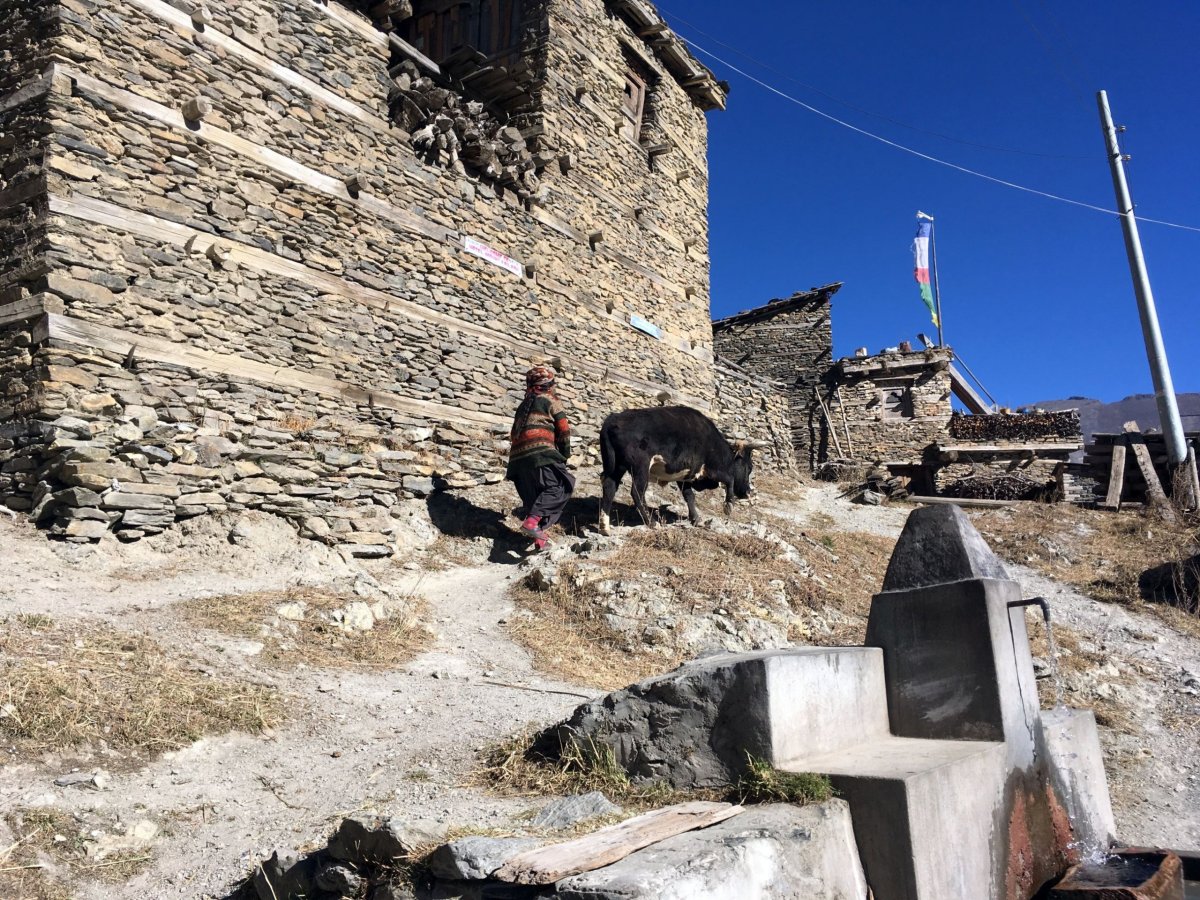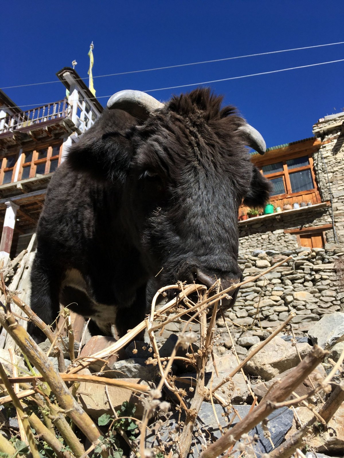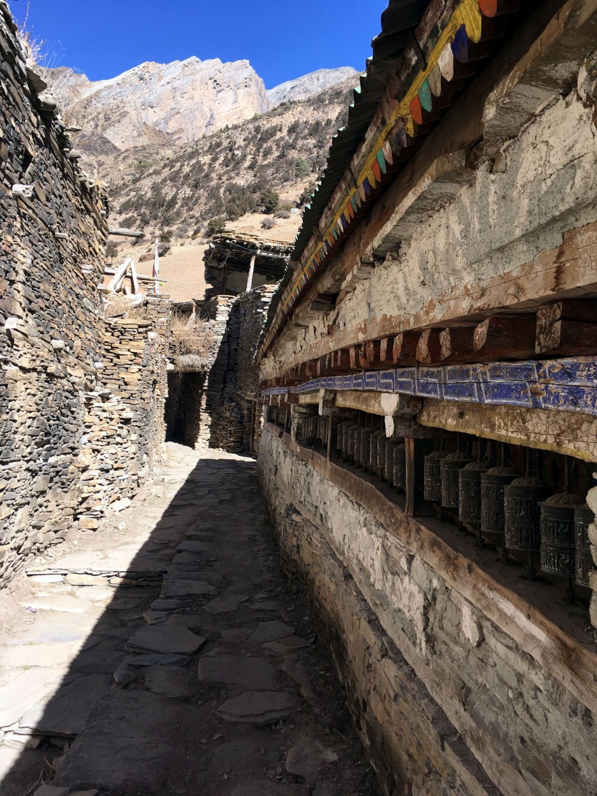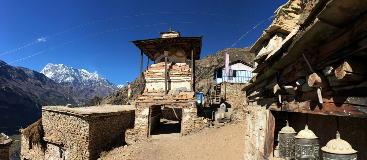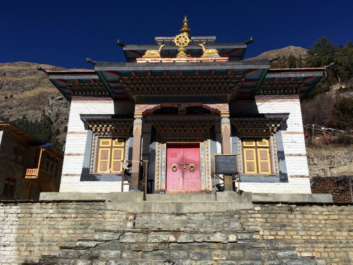 Procházíme úzkými uličkami, vyhýbáme se jakům a stoupáme k buddhistickému klášteru, který se nachází v kopci nad vesnicí. Rádi bychom nahlédli dovnitř, hlavní chrám je bohužel zamčený. Prosím jediného mnicha v okolí, zda by nám mohl dveře odemknout. Praví, že klíče od chrámu spravuje kuchař a pokouší se ho nalézt, nicméně se vrací s nepořízenou. Omlouvá se a zve nás na obřad, který se koná později odpoledne. Klesáme tedy zpět do vesnice a nacházíme si ubytování. Přímo z okna pokoje je nádherný výhled na stěny hor, které obepínají celé spodní údolí.