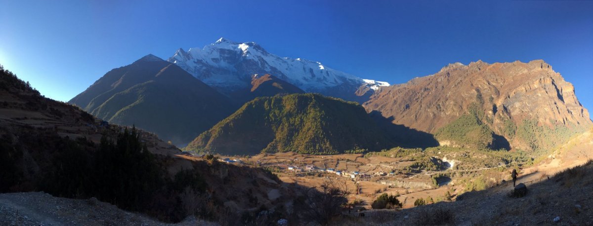 Začínají být vidět první zasněžené vrcholy. Výrazně se změnil i krajinný ráz. Stoupáme relativně pomalu, často zastavujeme a kocháme se nebo fotíme vrcholek osmitisícové Manaslu. Kručící žaludky nám společně s pohledem na hodinky připomínají, že dobu oběda jsme propásli před dvěma hodinami. Jídlo si tak dáváme v nejbližší vesnici po cestě, kde potkáváme starého známého z prvních dnů - Ukrajince s vlastními zásobami. V osmdesátilitrovém batohu nese na zádech především salámy. Zajímám se, zda se mezi salámy najde i nějaká bezprizorní lahev vodky. “Už ne.” říká kolega. “A jak dlouho po příletu vydržela? Dva dny?” ptám se. Odpovědí je mi bouřlivý smích. Poté odvětí, že dny to byly tři.