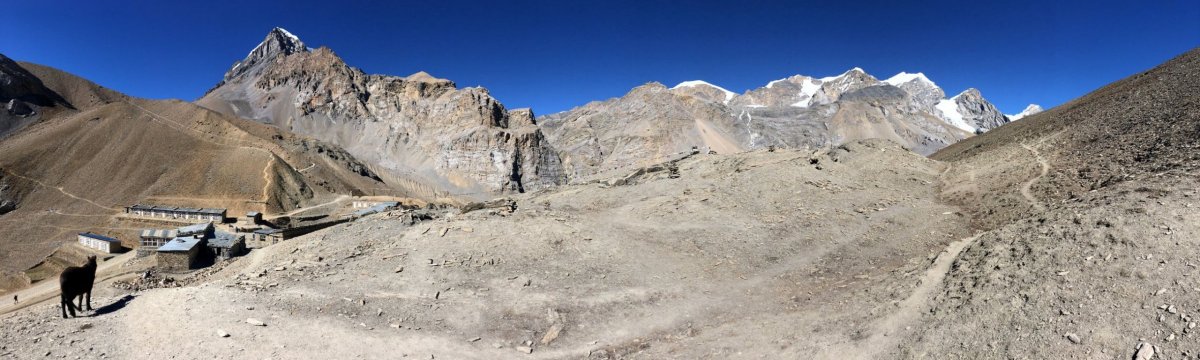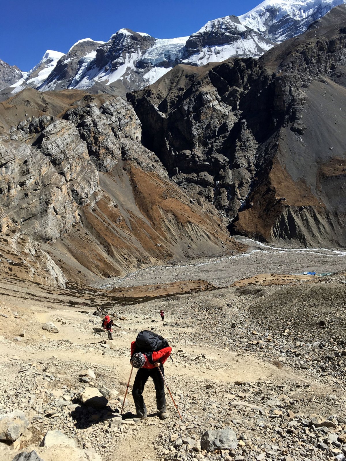 Naštěstí jsem se hned druhý den lehce zranil a změnil kvůli tomu plány na dokončení celého okruhu, což šlo jen po směru hodinových ručiček (kus tam na JV chybí). Pokračováním jsem nemusel platit znovu ty vysoké poplatky za TIMS a ACAP. Jít do sedla strmě od západu vyžadovalo jít to 2x kvůli aklimatizaci. Nejdřív do 5000 m a další den už s předem domluveným průvodcem s koněm, který by se vracel prázdný. Já ho ani nemusel platit, protože Švéd, se kterým jsem dal na tento úsek dohromady, měl moc těžký batoh (byl tam ze studijních důvodů) a potřeboval ho nutně pro sebe (batoh jsem na koně dal).
