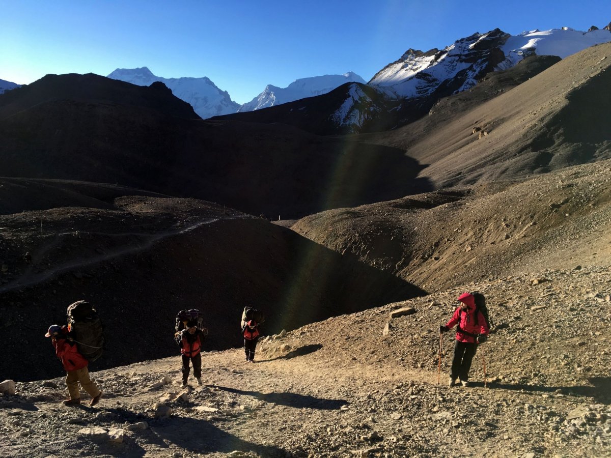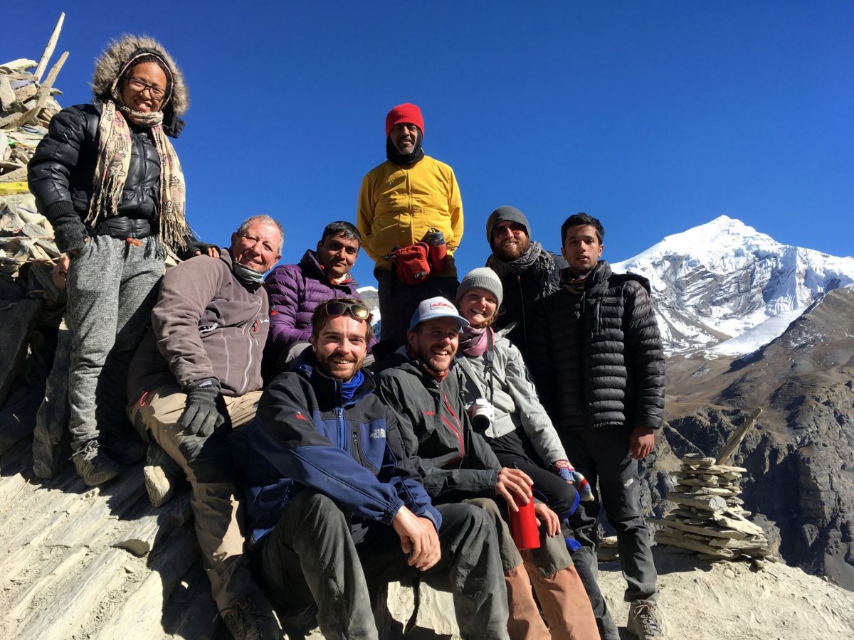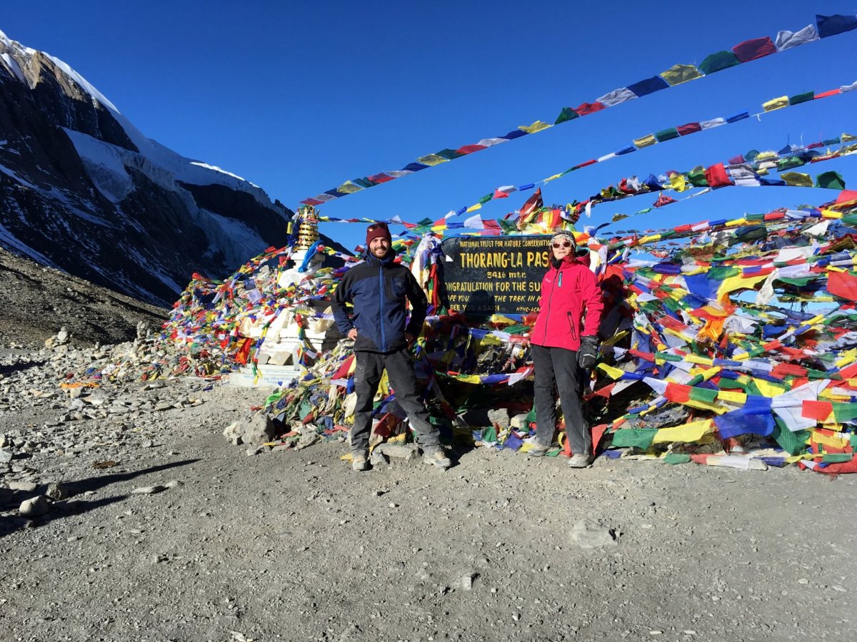 Po cestě máme několikrát pocit, že průsmyk je nedaleko. Po chvíli stoupání je však jasné, že jde o další z několika falešných vrcholů. Skutečný cíl nakonec poznáme snadno. Vrchol průsmyku je obsypán modlitebními praporky a lidé, kteří ho ten den dosáhli před námi, se u nich euforicky fotí společně s plechovou cedulí informující o výstupu. Po nás přicházejí další skupiny a ve tvářích všech se zračí upřímná radost. Nahoře se nachází i malé kamenité stavení sloužící jako čajovna. Ptám se obsluhujícího Nepálce, kolik měsíců v roce tady tráví. “Tři až čtyři.” odvětí a do dvou velkých plechových hrnků mi nalije silný černý čaj z termosky.
