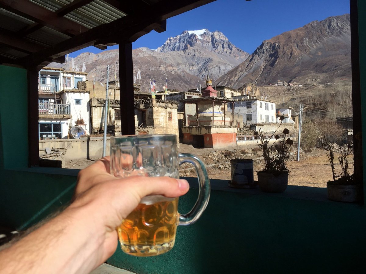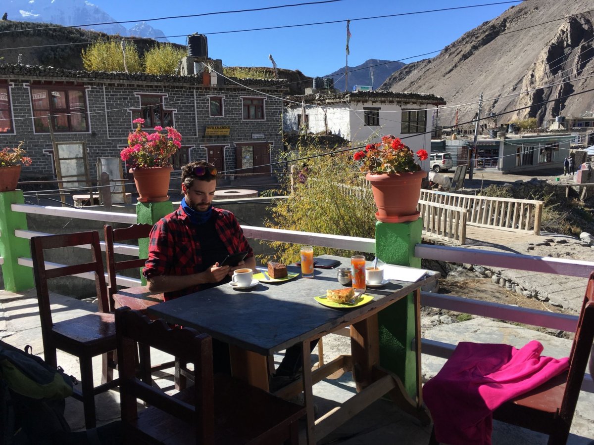 Po příchodu do města Kagbeni, které je v půli cesty, jsme znovu v civilizaci, což stvrzujeme objednávkou kávy a zákusku.