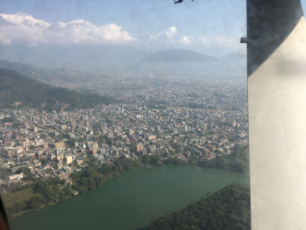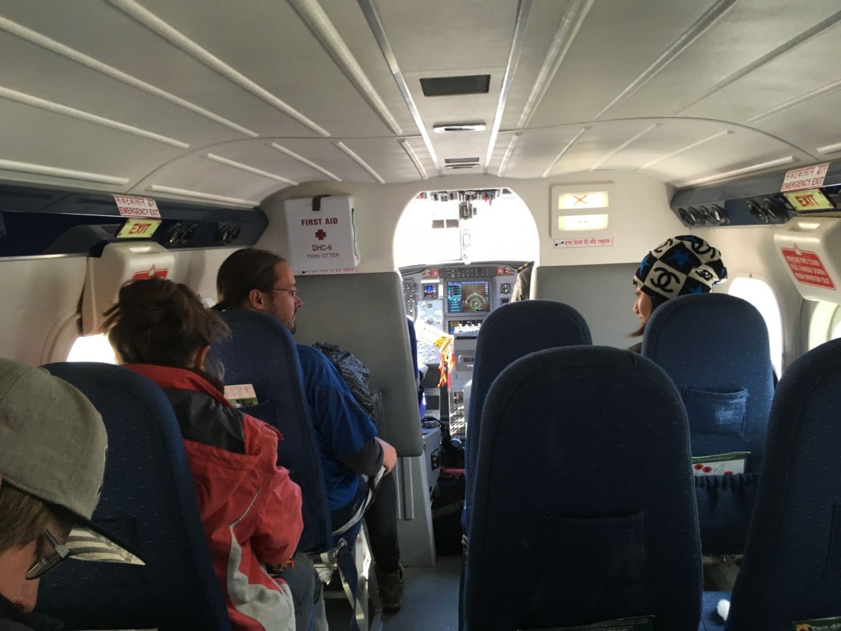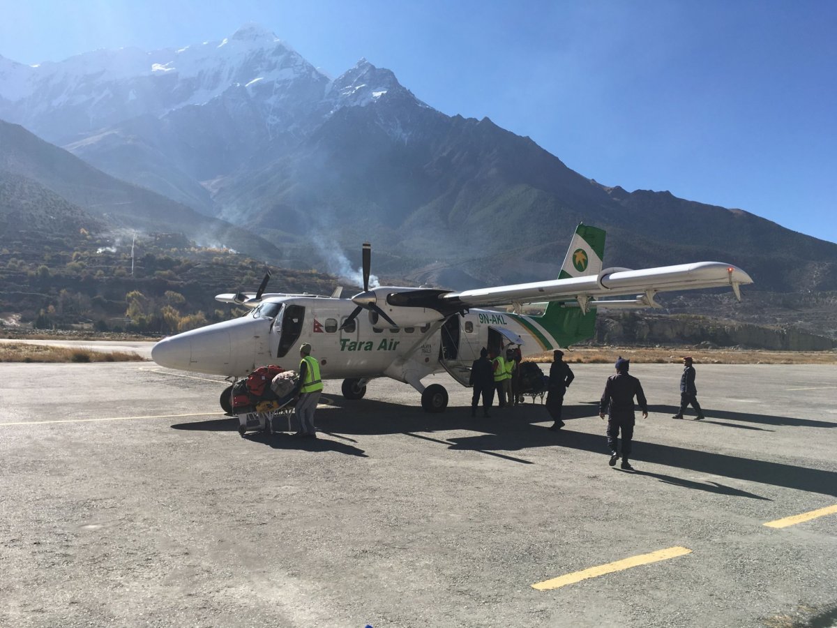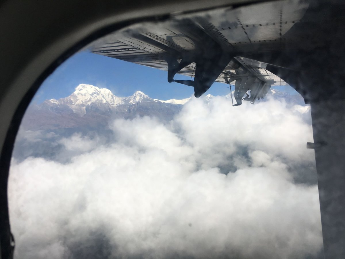Náš let má zpoždění kvůli mračnům okolo Annapuren. Po třech hodinách čekání začínáme být přesezení a hladoví. Když se však z oblak konečně snese malý hučící stroj, všichni bez výjimky propukají v jásot a tleskají. Let trvá 20 minut a zahrnuje výhledy na údolí mezi masivy Dhaulágirí a Annapurny.