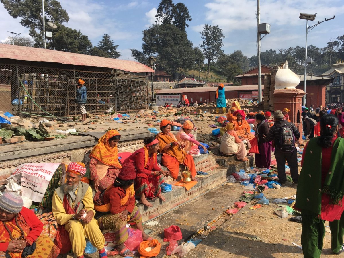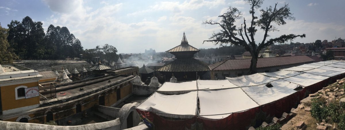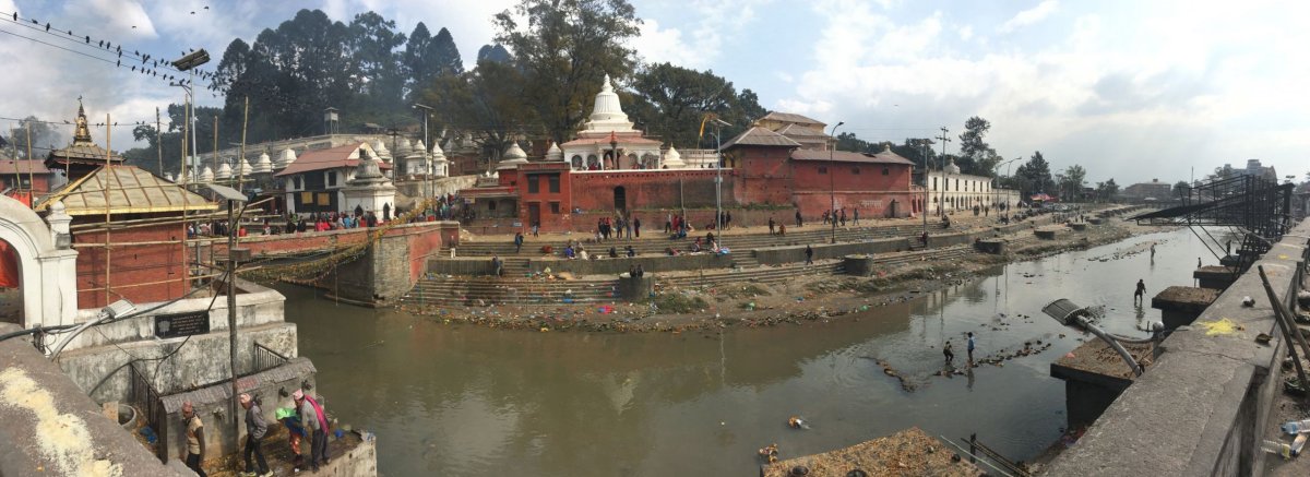 Frekventovanou ulici, jež odděluje vstupní cestu k chrámu Pashupatinath, překonáváme zavěšeni za dvě Nepálky. Pořád máme dost rupií, na dvě hodiny si tedy platíme průvodce. Nepálec s námi krouží okolo posvátného chrámu a přednáší o jeho historii. Dovnitř nesmíme, z jednoho vyššího místa je ale možné pozorovat proudící davy hinduistických poutníků. Dostáváme se do blízkosti spalovacích ghátů. Průvodce popisuje jednotlivé druhy obřadů podle pohlaví, věku a významu osoby. Mluví o různých způsobech počínaje pohřbíváním do země přes rozčtvrcení až po spalování, které se provádí zde v těsné blízkosti chrámu.