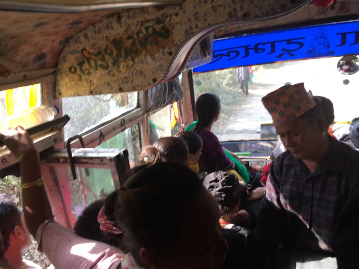 Odjezdové místo je špinavé a pod těžkým atakem smogu. Autobus po cestě nabírá další a další Nepálce. Za námi sedí parta mladých studentů jedoucích do hor, před námi početná nepálská rodina s malou dcerou. Já sedím první polovinu cesty vedle pytle s rýží.