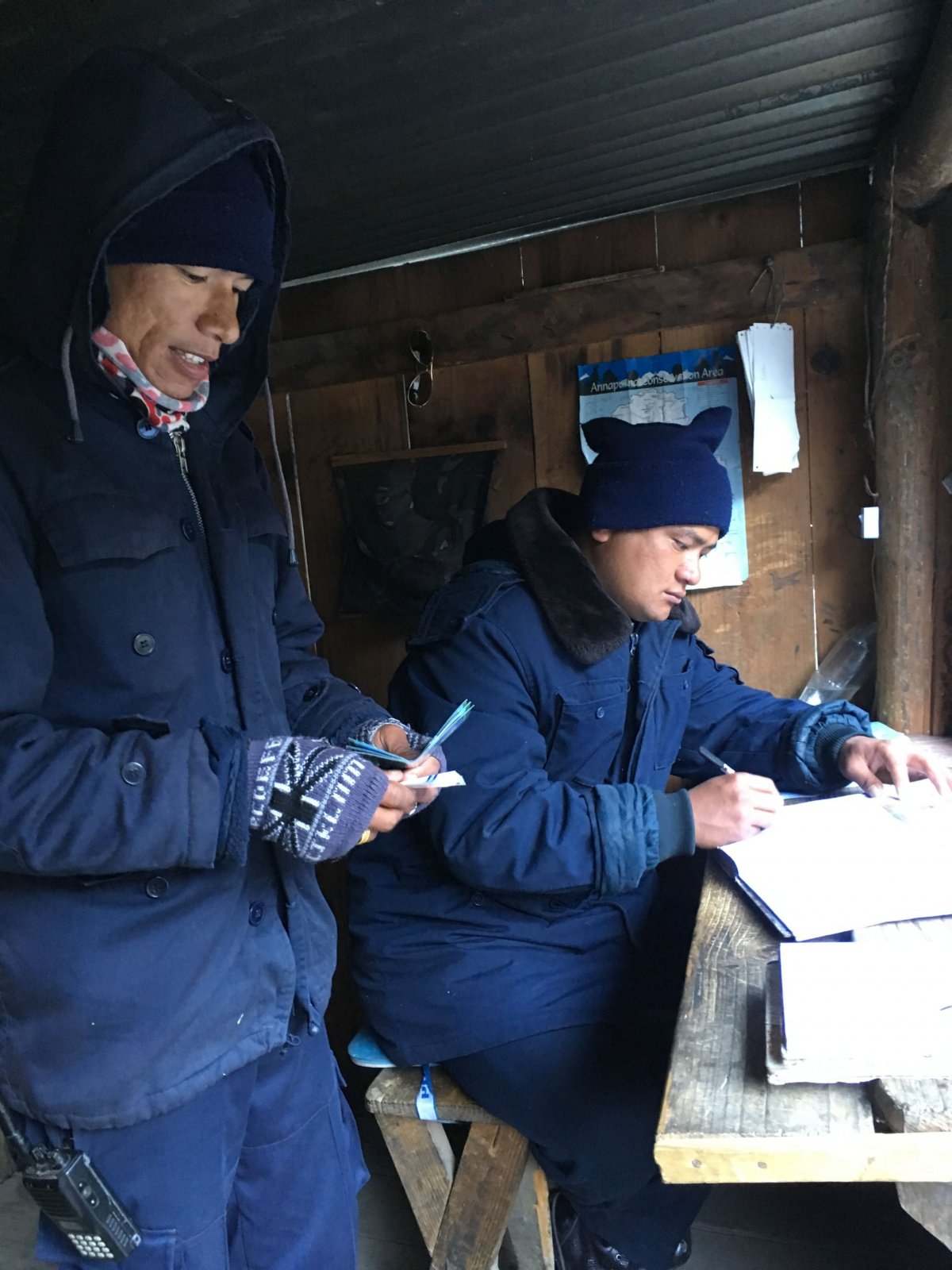 Ve čtvrt na šest máme sbaleno a z venkovního sudu si nabíráme vodu, ke které je třeba se přes zmrzlou hladinu probít. Venku je pořádná tma, přes zimní čepice si nasazujeme čelovky a pomalým tempem se vydáváme vpřed.