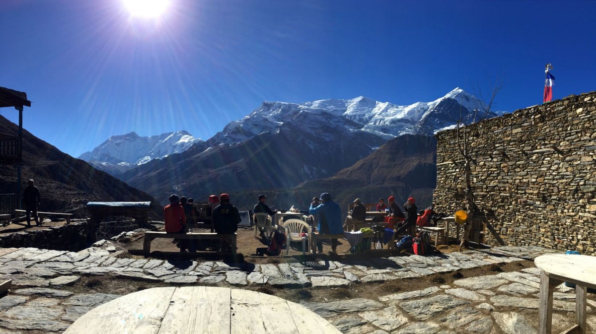 Ráno se motivujeme a pochvalujeme si, jak jsou naše batohy s každým nanesením zubní pasty na kartáček lehčí a lehčí. Hustota lidí po cestě stoupá. V Thorong Phedi jíme oběd a při pohledu na stoupání s vidličkou v ústech konstatujeme, že těch zbývajících 300 výškových metrů do High Camp se nám půjde lépe dnes, kdy máme rozchozené nohy, než v pět hodin ráno. Nahoře se znovu shledáváme se známými tvářemi z minulých dnů na cestě. Všichni se scházíme na kopci, jenž skýtá přímé pohledy na okolní masiv. Annapurna 2, Annapurna 3, Gangapurna. Říkám si, že hory nepřestanu obdivovat po zbytek života.