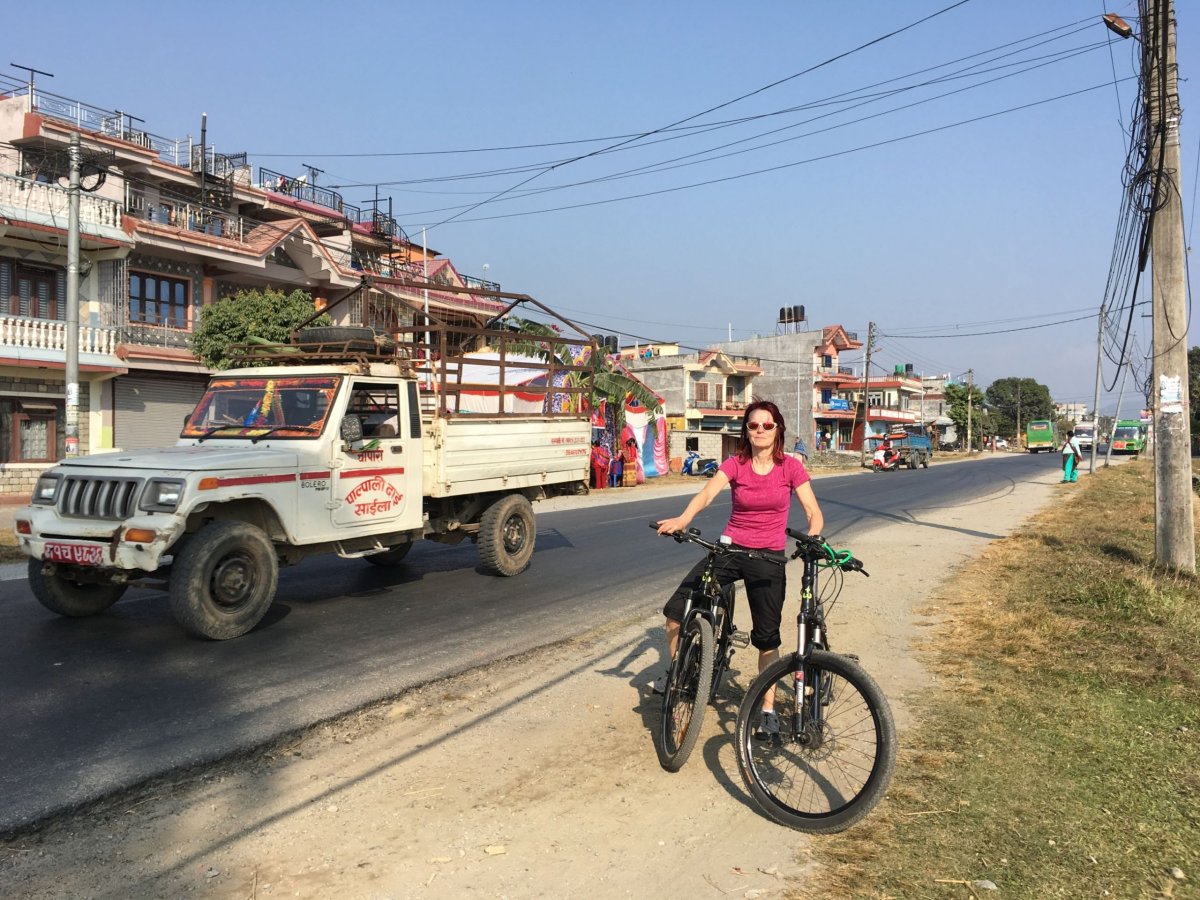 Poblíž parku Basundhara si půjčujeme jízdní kola od Nepálce, který se už v deset hodin ráno pyšní jedním promile. Předchozí den jsme se chtěli vypravit na kopec ke stúpě Shanti.