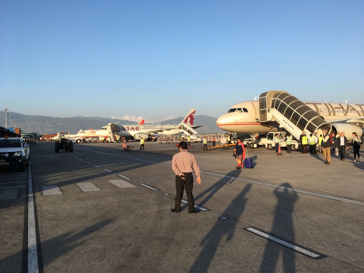 Po výstupu z letadla v Káthmándú nenastupujeme do žádného autobusu. Jde o malé letiště a z místa přistání do příletové haly je to pár kroků. První formalitou je vyplnění imigrační karty, po kterém následuje podání žádosti o vstupní vízum. Vízum je nově možné vyřídit jednoduše pomocí speciálního terminálu s integrovanou čtečkou elektronického pasu. Po načtení údajů zbývá vytisknout účtenku a tu společně s příletovým formulářem a dvaceti připravenými dolary zanést úředníkovi na přepážku.