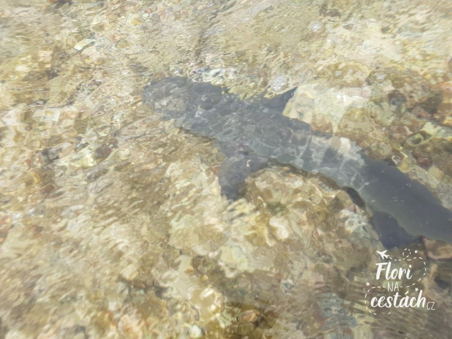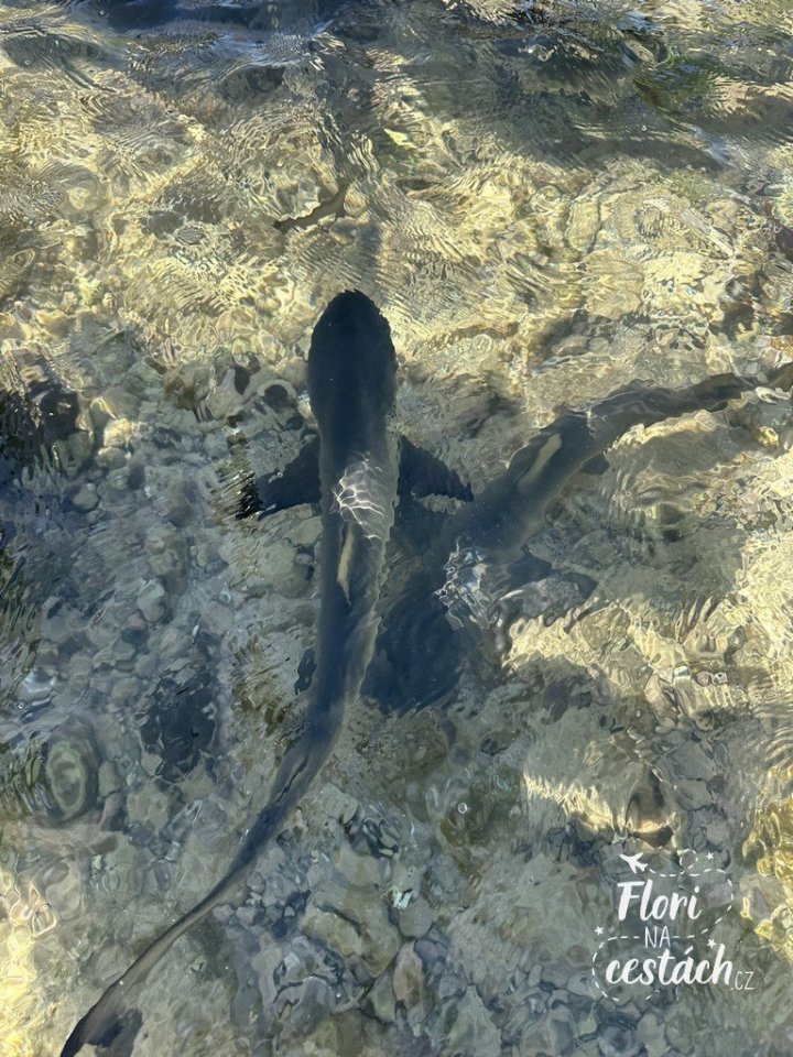 Žraločí zátoka se nachází se na východním pobřeží ostrova. Mělká voda kamenitého pobřeží láká žraloky citronové, aby se tady vyhřívali na slunci. Půjč si boty do vody (nebo si přivez své, ty máš zdarma), projdi se zhruba 50 metrů a najednou se ti žraloci dotýkají nohou a proplouvají všude kolem tebe. A neboj, žraloci citronoví prý na člověka nejdou, takže zpět se vracíš se všemi prsty na nohou i rukou.