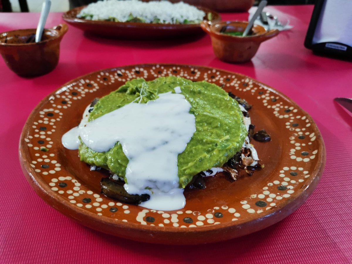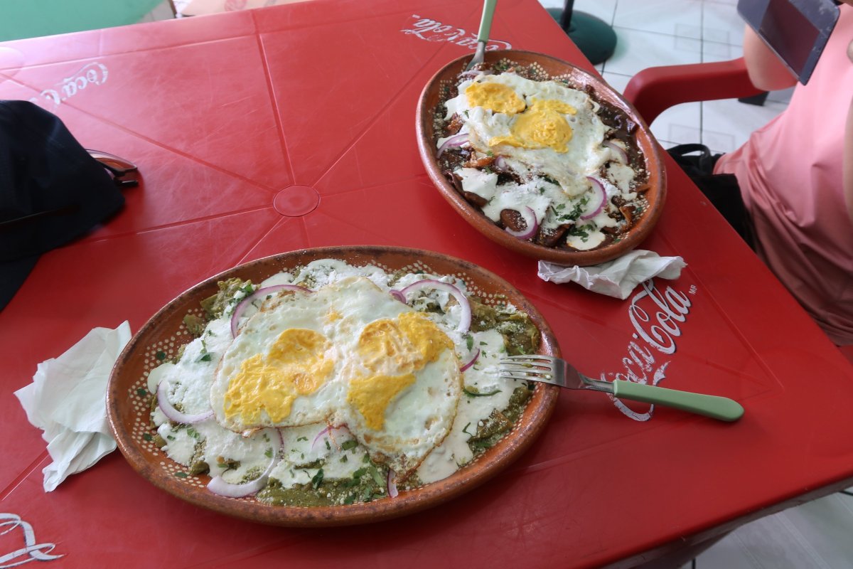 Pro extranjeros jsou méně známé třeba chilaquiles, který se teda dělaj asi spíš jako snídaně (což znamená tak do dvou). Jsou to nachos nebo natrhaný tortilly, který se na pánvi smíchaj se zvolenou omáčkou: salsa verde/roja nebo de mole. Podávaj se s vejcem nebo s masem. Skvělý je má paní na Calle 10 Nte mezi Avenida 70 a 75. Doporučuju i její okurkovou limonádu. A jedna porce na dvojici stačí. Jsem docela požerák, ale tahle celá porce je i na mě moc.