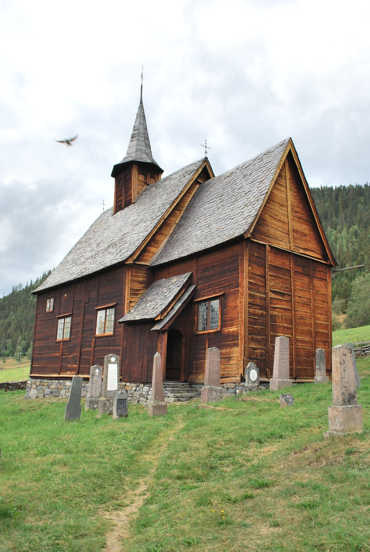 Ráno po snídani jedeme na první parkoviště s vykopávkami, je tu asi 5 bydlíků, ještě spí, takže máme vykopávky jenom pro sebe. Stejně tak i na druhém stanovišti, kde je malý asi 800 metrový okruh. Pak jedeme k muzeum Vitlycke, otevírají až v 10, takže si nejdříve prohlédneme okruh s vykopávkami a pak jdeme do muzea. Koupíme podtácky a pohled. Všude se dá platit kartou, takže ani nepotřebujeme švédské koruny. Z muzea jedem přes Oslo, Sandviku, Hønefoss, Fagernes, Ryfoss k městečku Lomen, kde se podíváme na první „sloupový“ dřevěný kostel. Mají tu záchody s teplou vodou, kostel už je však zavřený. Popojedeme ještě kousek a najdeme místo na spaní, u malého jezera je plážička s piknikovým stolem, suchý záchod a kabinka s kamny na převlékání. Takže se vykoupeme – voda je docela teplá, uděláme večeři a jdeme spát.