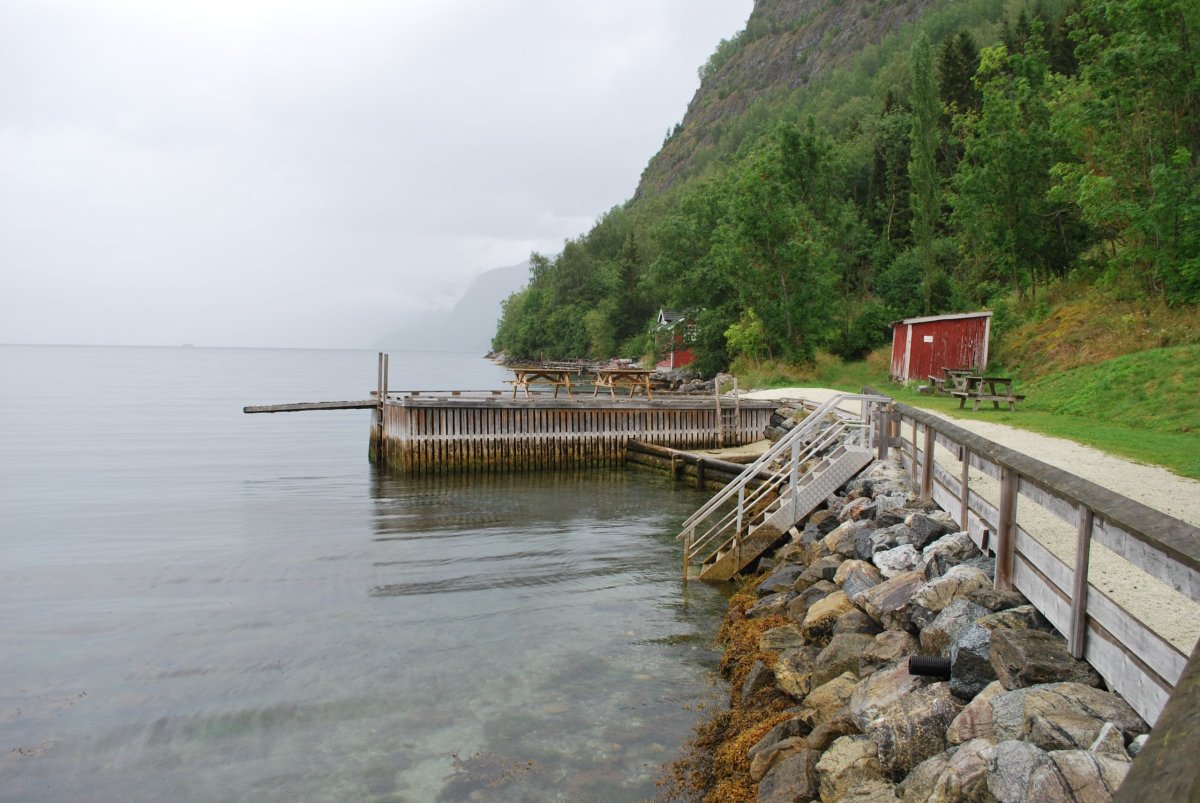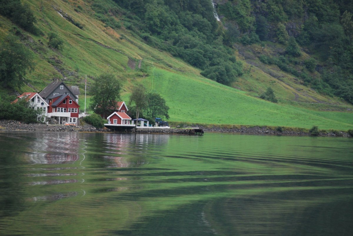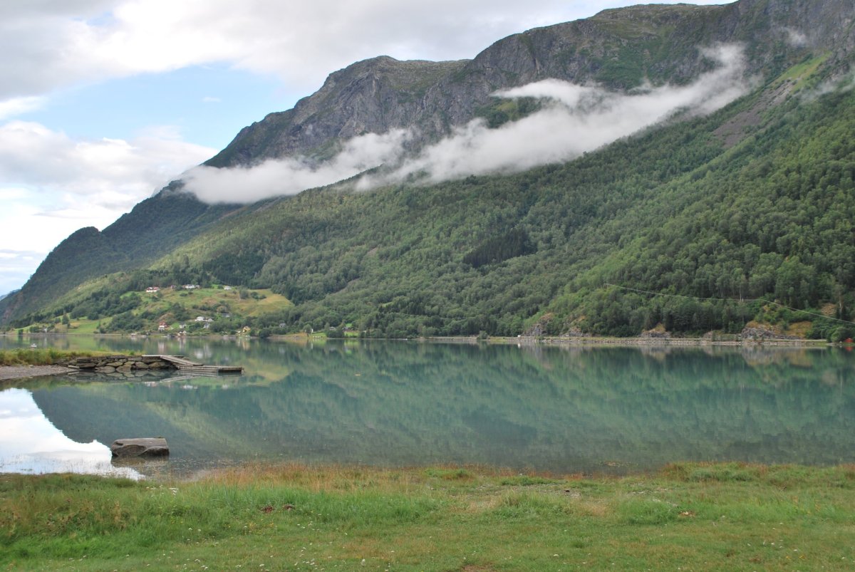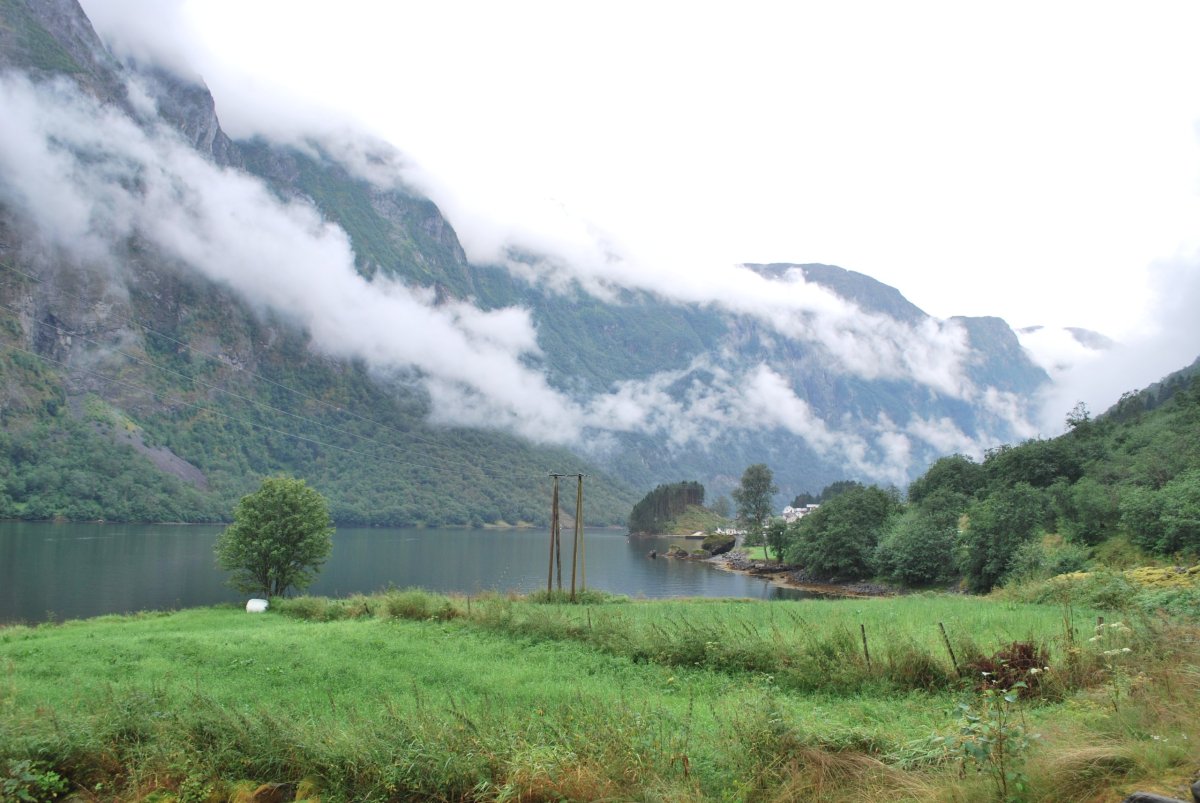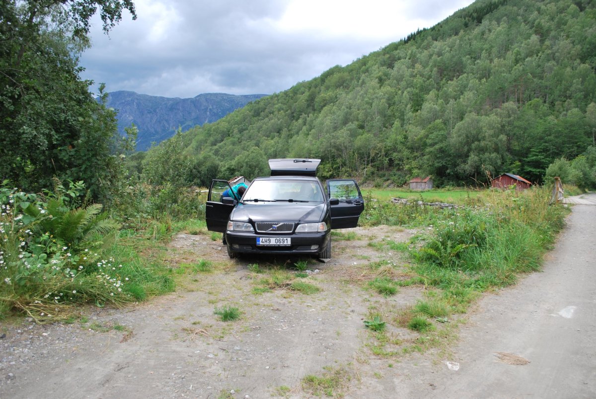 Ráno trochu poprchává, stihneme se nasnídat a jedem do městečka Solvorn, kde necháme auto a trajektem (43 NOK na osobu a 1 cestu) se přeplavíme na druhou stranu Sognefjordu do vesnice Ornes (Urnes), kde je nejstarší sloupový kostel (UNESCO) (vstupné 90 NOK/osoba). Cestou ke kostelu míjíme sady a pole s jablky, malinami, třešněmi, u kostela je prodejna, kde si kupuji za 30 NOK vaničku malin, jsou výborné, a ještě malinový sirup. Za hodinu jede trajekt zpět, je to akorát na prohlídku kostela a cestu zpět do přístavu, musíme trochu popoběhnout, aby nám trajekt neujel. Přejedeme zpět do Solvornu. Pak podél fjordu jedeme na další trajekt (Leikanger) do městečka Vangsnes (asi 30 minut). Z Vangsnes jedem podél fjordu do městečka Fresvik, kde i přes jemný déšť Štěpa vleze do fjordu se vykoupat. Pak vyrazíme směrem "na hory", zakempujeme na konci cesty na parkovišti, u řeky v údolí s pastvinami (opět UNESCO). Jsou tam okolo nás ovce, kozy a koně, večer se ošplouchneme v řece, která je strašně studená (z ledovce), uvaříme večeři a jdeme spát.