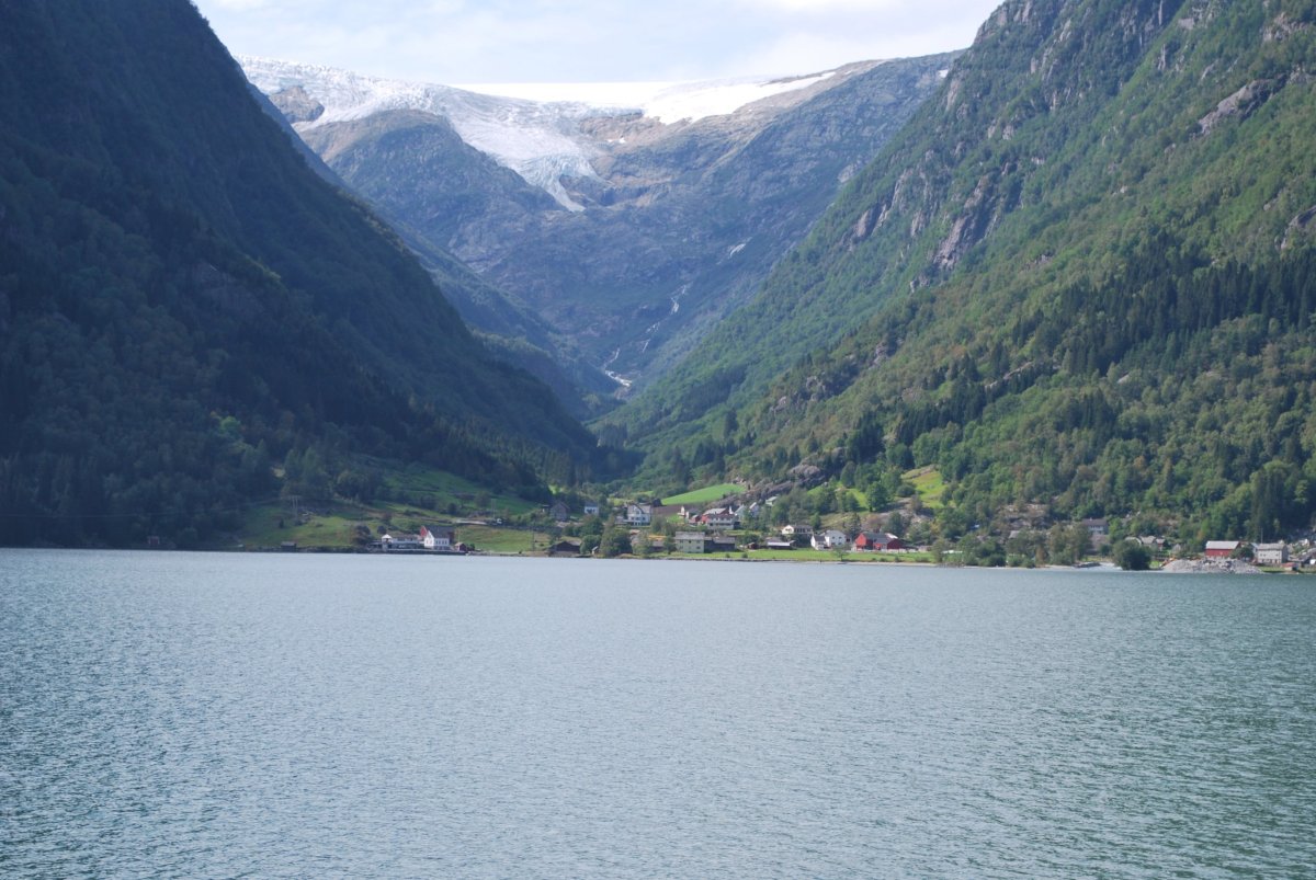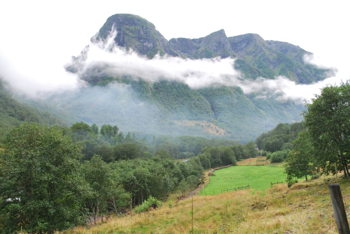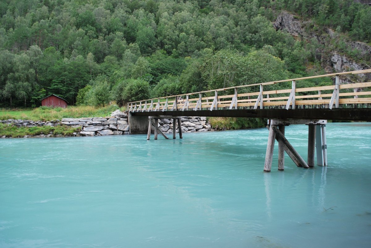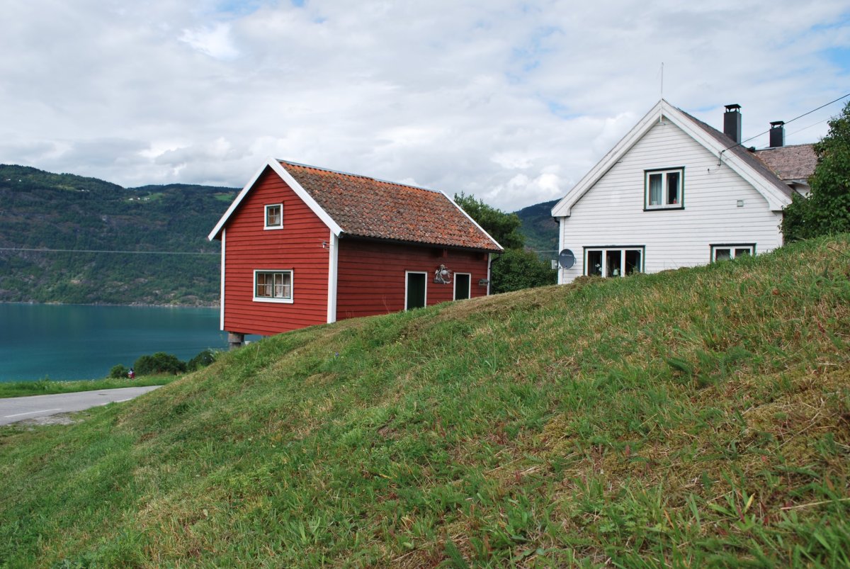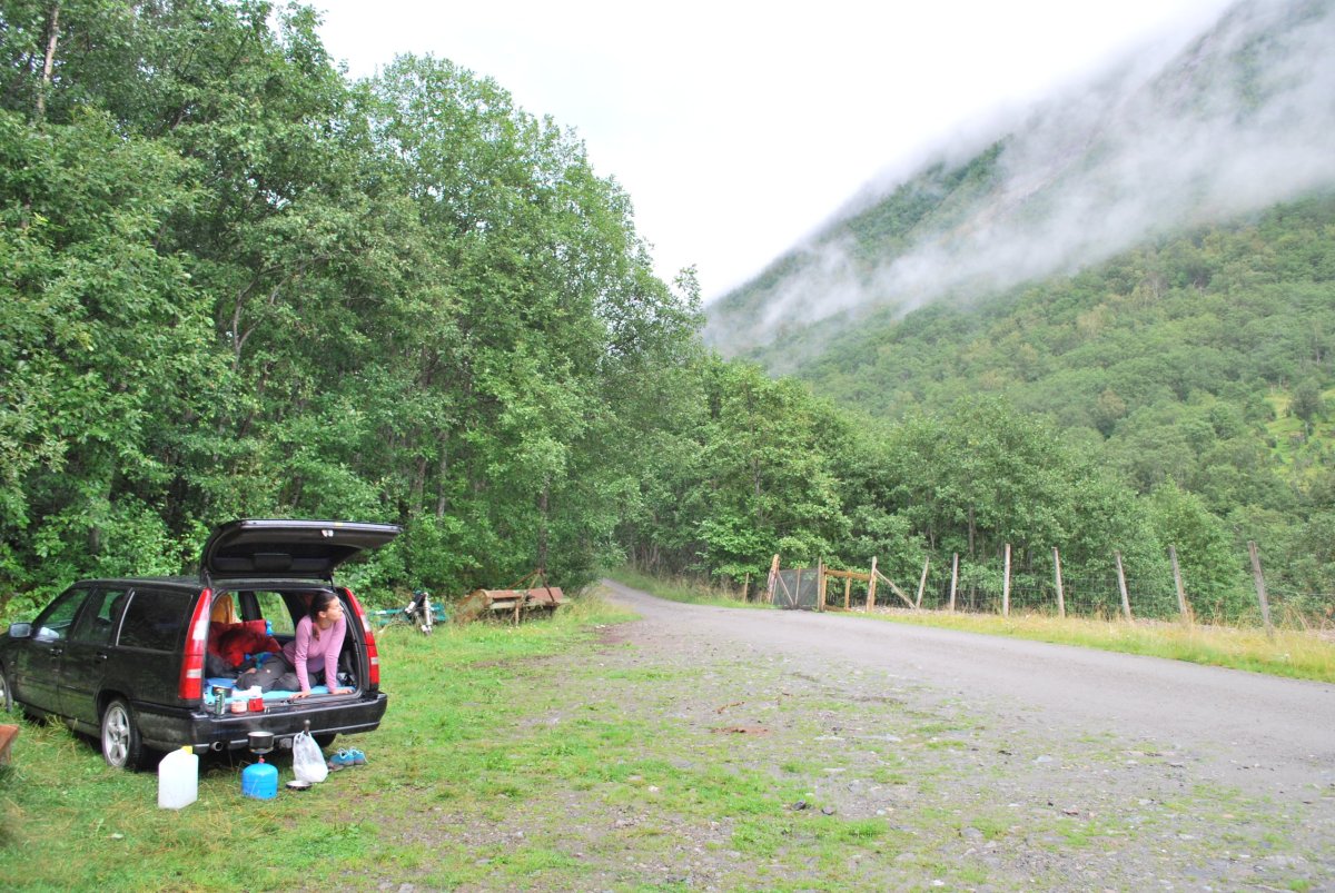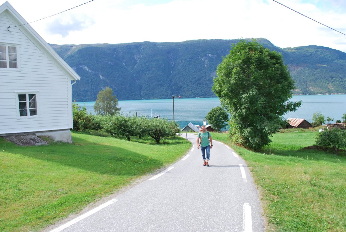 Ráno trochu poprchává, stihneme se nasnídat a jedem do městečka Solvorn, kde necháme auto a trajektem (43 NOK na osobu a 1 cestu) se přeplavíme na druhou stranu Sognefjordu do vesnice Ornes (Urnes), kde je nejstarší sloupový kostel (UNESCO) (vstupné 90 NOK/osoba). Cestou ke kostelu míjíme sady a pole s jablky, malinami, třešněmi, u kostela je prodejna, kde si kupuji za 30 NOK vaničku malin, jsou výborné, a ještě malinový sirup. Za hodinu jede trajekt zpět, je to akorát na prohlídku kostela a cestu zpět do přístavu, musíme trochu popoběhnout, aby nám trajekt neujel. Přejedeme zpět do Solvornu. Pak podél fjordu jedeme na další trajekt (Leikanger) do městečka Vangsnes (asi 30 minut). Z Vangsnes jedem podél fjordu do městečka Fresvik, kde i přes jemný déšť Štěpa vleze do fjordu se vykoupat. Pak vyrazíme směrem "na hory", zakempujeme na konci cesty na parkovišti, u řeky v údolí s pastvinami (opět UNESCO). Jsou tam okolo nás ovce, kozy a koně, večer se ošplouchneme v řece, která je strašně studená (z ledovce), uvaříme večeři a jdeme spát.
