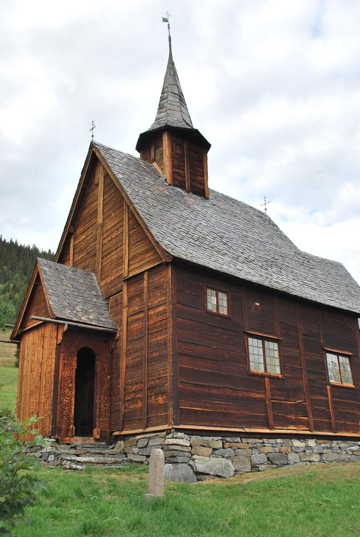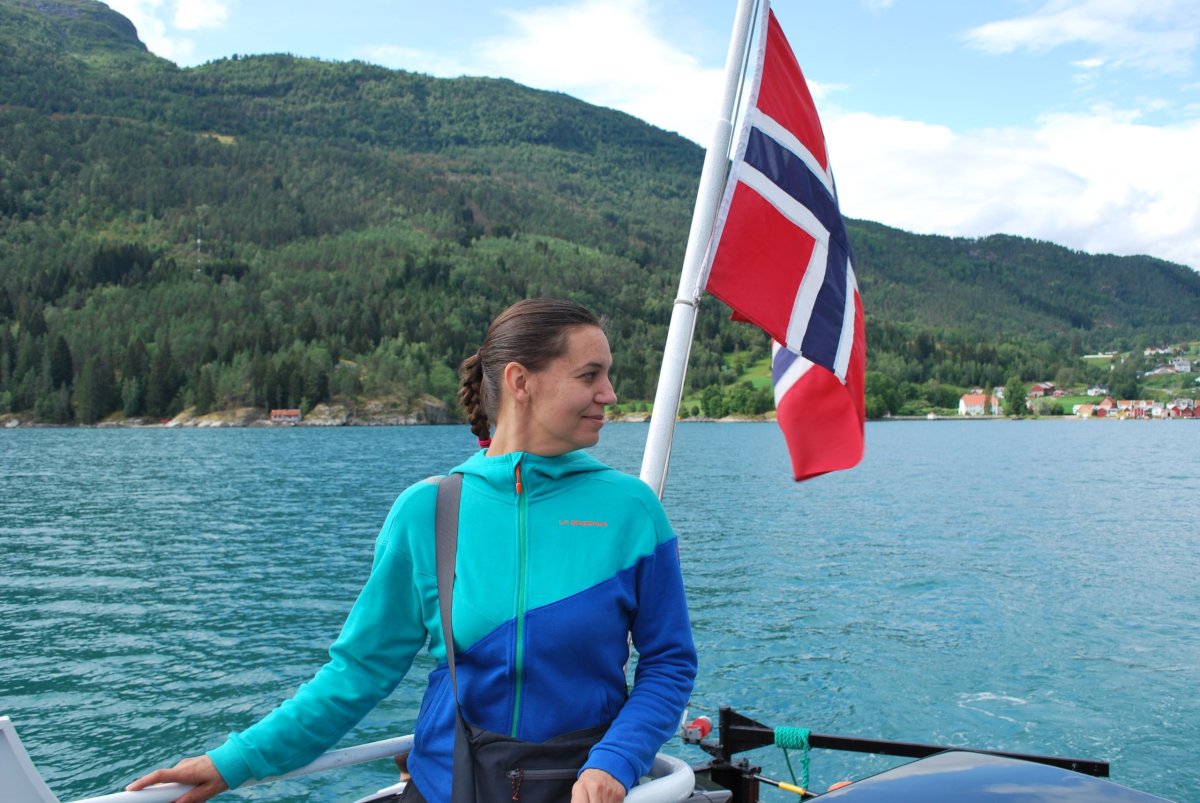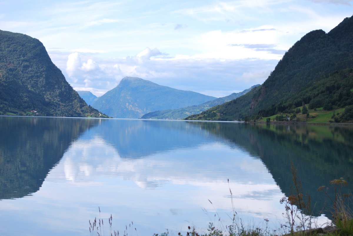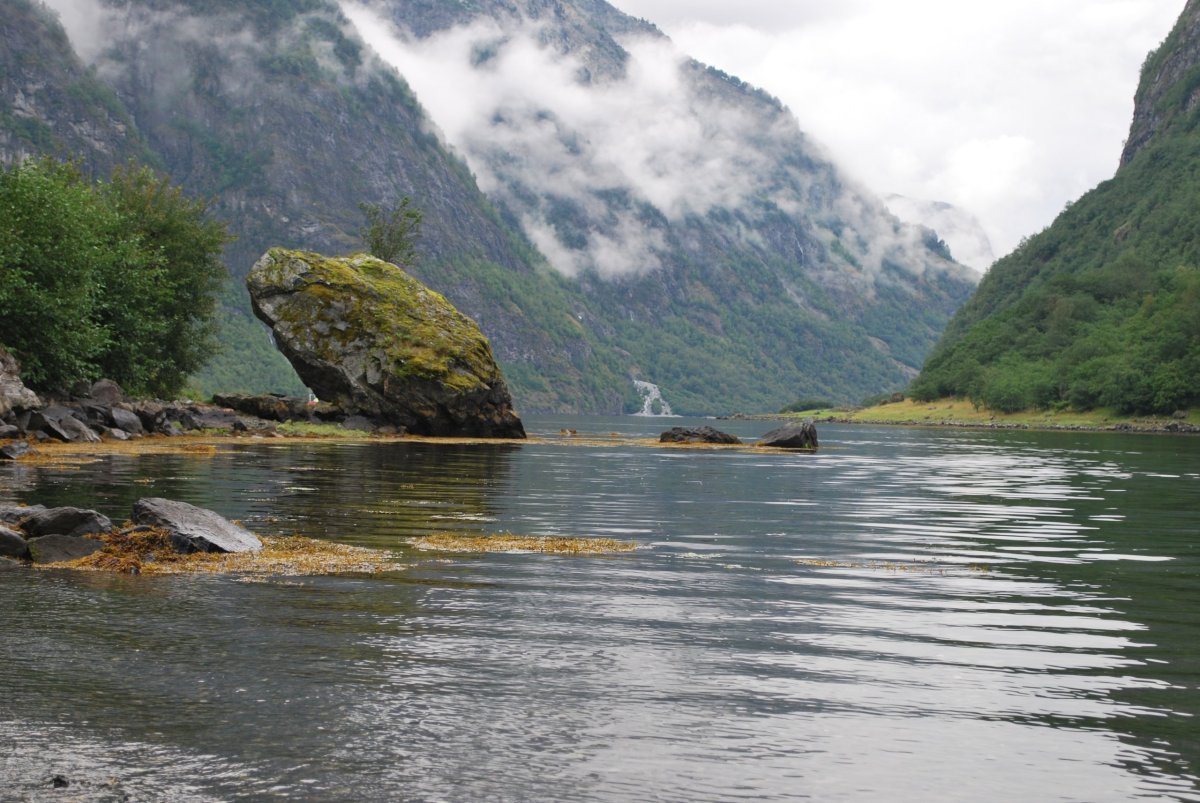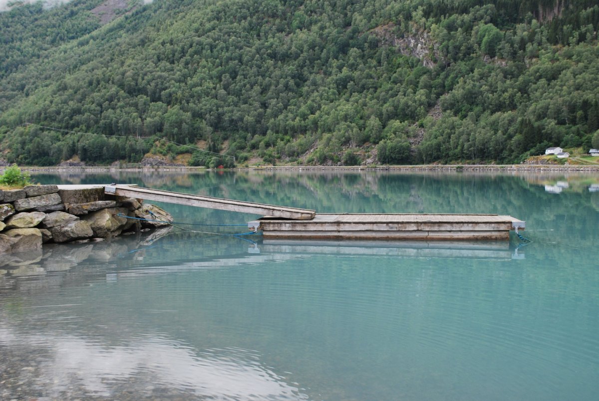 Ráno trochu poprchává, stihneme se nasnídat a jedem do městečka Solvorn, kde necháme auto a trajektem (43 NOK na osobu a 1 cestu) se přeplavíme na druhou stranu Sognefjordu do vesnice Ornes (Urnes), kde je nejstarší sloupový kostel (UNESCO) (vstupné 90 NOK/osoba). Cestou ke kostelu míjíme sady a pole s jablky, malinami, třešněmi, u kostela je prodejna, kde si kupuji za 30 NOK vaničku malin, jsou výborné, a ještě malinový sirup. Za hodinu jede trajekt zpět, je to akorát na prohlídku kostela a cestu zpět do přístavu, musíme trochu popoběhnout, aby nám trajekt neujel. Přejedeme zpět do Solvornu. Pak podél fjordu jedeme na další trajekt (Leikanger) do městečka Vangsnes (asi 30 minut). Z Vangsnes jedem podél fjordu do městečka Fresvik, kde i přes jemný déšť Štěpa vleze do fjordu se vykoupat. Pak vyrazíme směrem "na hory", zakempujeme na konci cesty na parkovišti, u řeky v údolí s pastvinami (opět UNESCO). Jsou tam okolo nás ovce, kozy a koně, večer se ošplouchneme v řece, která je strašně studená (z ledovce), uvaříme večeři a jdeme spát.