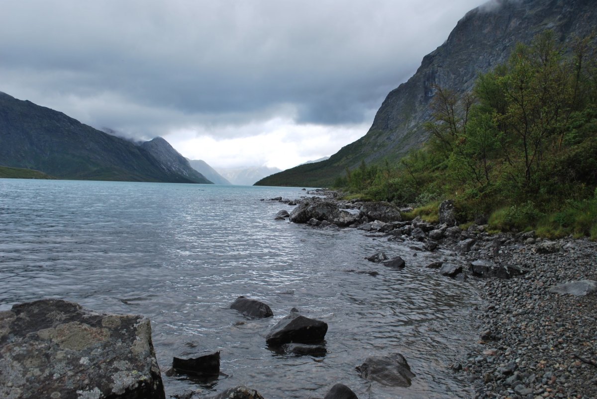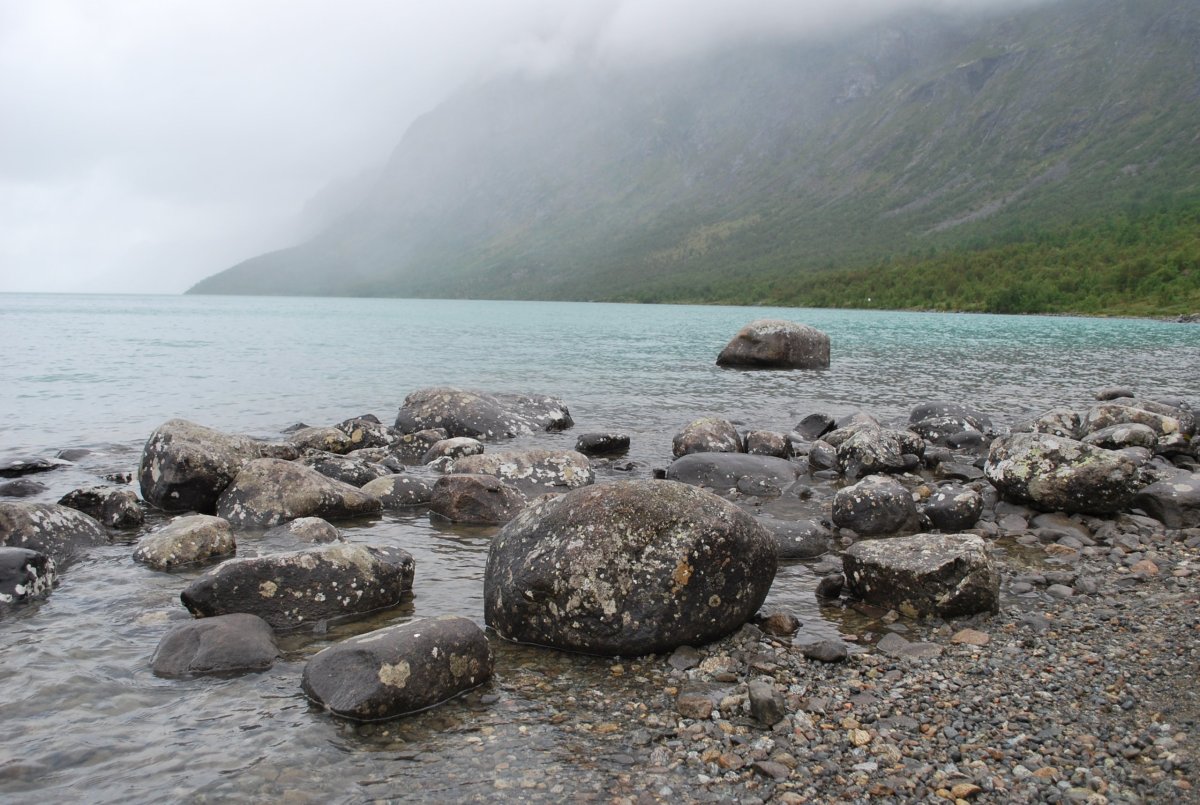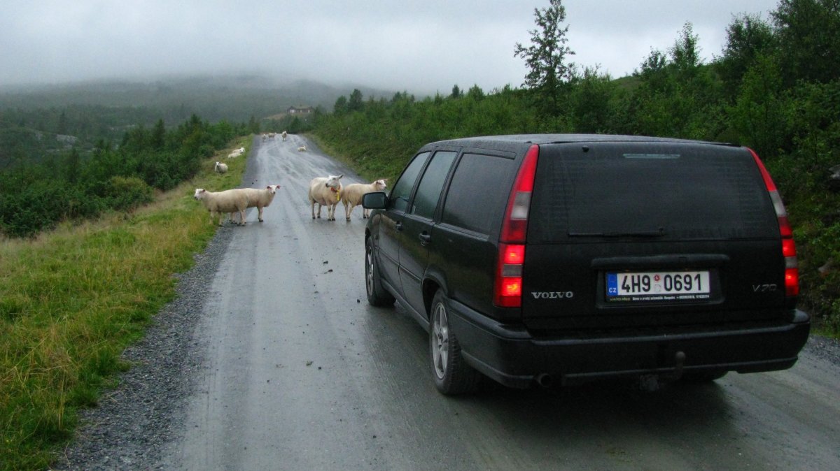 Dnes se trochu kazí počasí – začalo poprchávat a je zima. Po snídani se sbalíme a jedeme přes placenou silnici (80 NOK – kartou) do městečka Beitostølen – něco jako Špindl – lanovky, sjezdovky. Je mlha, výhledy moc nejsou, ale je to dobrodružná cesta – potkáváme ovce, které leží na kraji silnice, nebo přímo na silnici, a pak stádo koz, které chci odehnat, takže vylezu z auta, ale kozy jsou zvědavé a místo toho, aby utekly, přijdou se na mě podívat. Přes hřebeny jotunheimenského národního parku dojedeme k jezeru Bygdin. Tam zaparkujeme na krátkodobém parkovišti (dá se tam stát dvě hodiny zadarmo – ale to jsme nevěděli a zaparkovali bez lístečku a když jsme se vrátili, měli jsem za stěračem lístek, ať si přeparkujeme), a jdeme na malý výlet okolo jezera. Jezero má za hezkého počasí modrozelenou barvu, tu bohužel nevidíme, je pod mrakem a poprchává. Ale zase jsme tu sami, cestou nazpátek potkáváme pár zoufalců, co mají sbaleno vše s sebou a jdou na trek, a jsou úplně mokrý. U jezera Štěpa sbírá první kameny – dal si závazek, že to, co objemově vyprázdní z auta (myšleno plechovky piva a redbullu) nahradí kameny. Po návratu k autu se domluvíme, že nemá cenu v tomhle počasí někde trajdat, a že si uděláme road trip a pojedeme autem okolo parku a budeme stavět na vyhlídky a focení. Objíždíme tedy park z východní strany, po cestě je spoustu vodopádů, jezer, jezírek, štítů, ledovce…a také jedna domorodá prodejna suvenýrů – váháme nad kůží ze soba. Nakonec jí nekoupíme, úplně se nám nehodí do domečku. Navečer dojedeme před městečko Sklojden a u kempu zaparkujeme na rybářském místě, u mostku přes řeku, a naproti přes silnici je obrovský vodopád. Uvaříme, pokoukáme a jdeme spát.