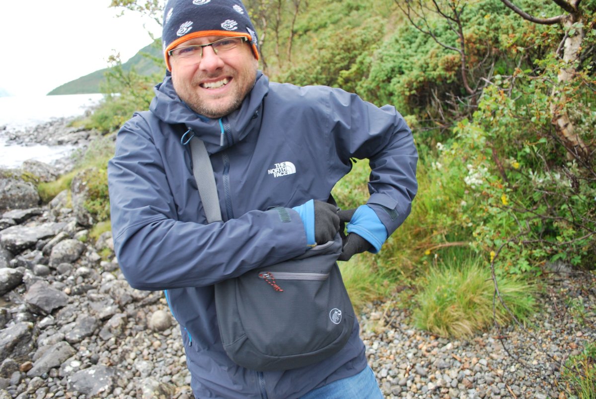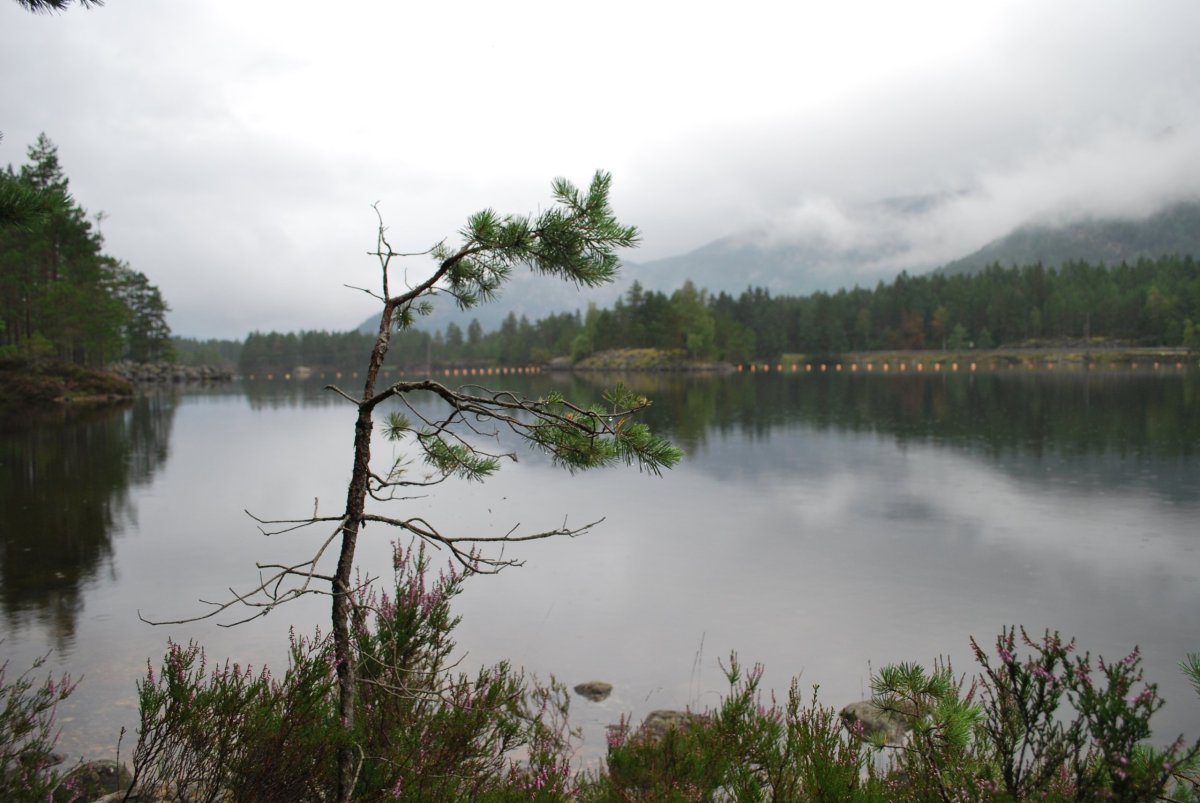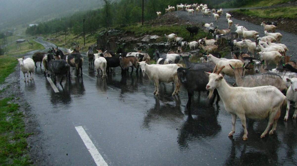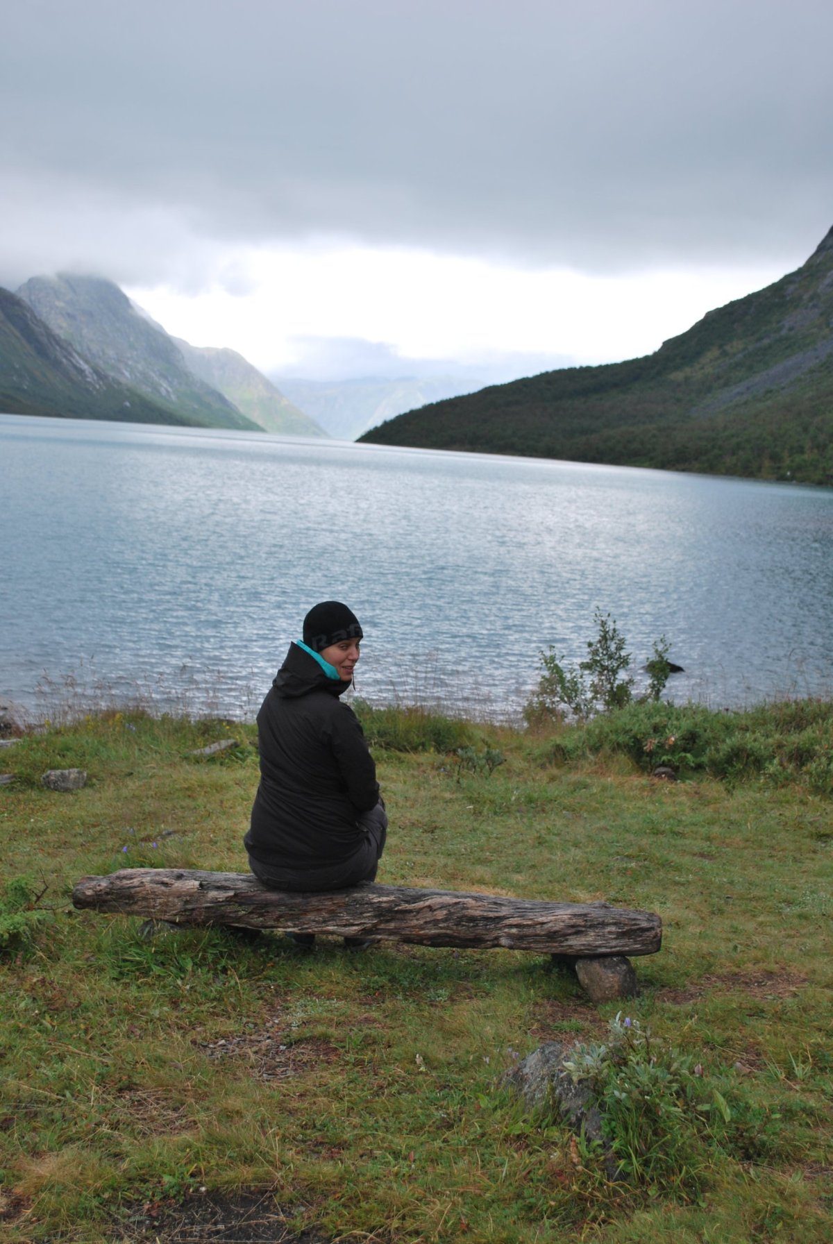 Dnes se trochu kazí počasí – začalo poprchávat a je zima. Po snídani se sbalíme a jedeme přes placenou silnici (80 NOK – kartou) do městečka Beitostølen – něco jako Špindl – lanovky, sjezdovky. Je mlha, výhledy moc nejsou, ale je to dobrodružná cesta – potkáváme ovce, které leží na kraji silnice, nebo přímo na silnici, a pak stádo koz, které chci odehnat, takže vylezu z auta, ale kozy jsou zvědavé a místo toho, aby utekly, přijdou se na mě podívat. Přes hřebeny jotunheimenského národního parku dojedeme k jezeru Bygdin. Tam zaparkujeme na krátkodobém parkovišti (dá se tam stát dvě hodiny zadarmo – ale to jsme nevěděli a zaparkovali bez lístečku a když jsme se vrátili, měli jsem za stěračem lístek, ať si přeparkujeme), a jdeme na malý výlet okolo jezera. Jezero má za hezkého počasí modrozelenou barvu, tu bohužel nevidíme, je pod mrakem a poprchává. Ale zase jsme tu sami, cestou nazpátek potkáváme pár zoufalců, co mají sbaleno vše s sebou a jdou na trek, a jsou úplně mokrý. U jezera Štěpa sbírá první kameny – dal si závazek, že to, co objemově vyprázdní z auta (myšleno plechovky piva a redbullu) nahradí kameny. Po návratu k autu se domluvíme, že nemá cenu v tomhle počasí někde trajdat, a že si uděláme road trip a pojedeme autem okolo parku a budeme stavět na vyhlídky a focení. Objíždíme tedy park z východní strany, po cestě je spoustu vodopádů, jezer, jezírek, štítů, ledovce…a také jedna domorodá prodejna suvenýrů – váháme nad kůží ze soba. Nakonec jí nekoupíme, úplně se nám nehodí do domečku. Navečer dojedeme před městečko Sklojden a u kempu zaparkujeme na rybářském místě, u mostku přes řeku, a naproti přes silnici je obrovský vodopád. Uvaříme, pokoukáme a jdeme spát.