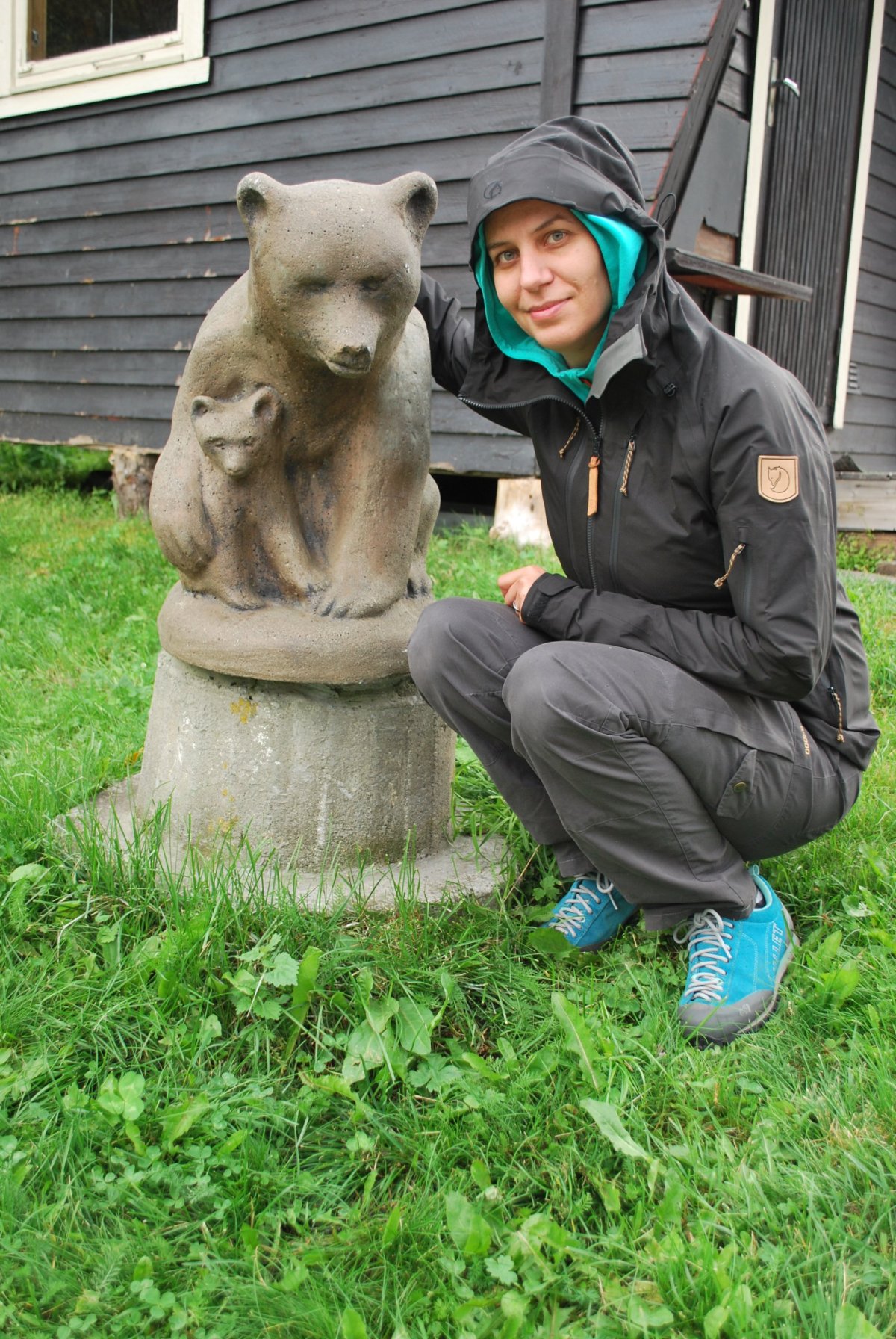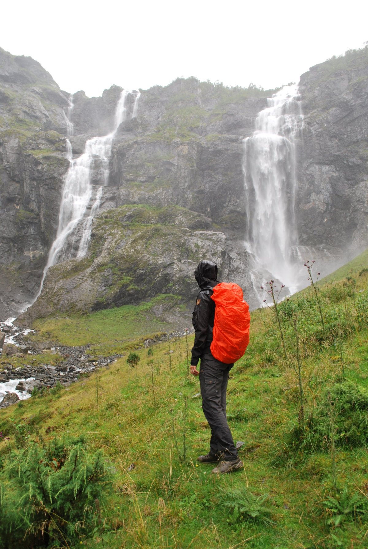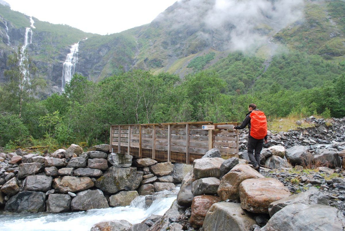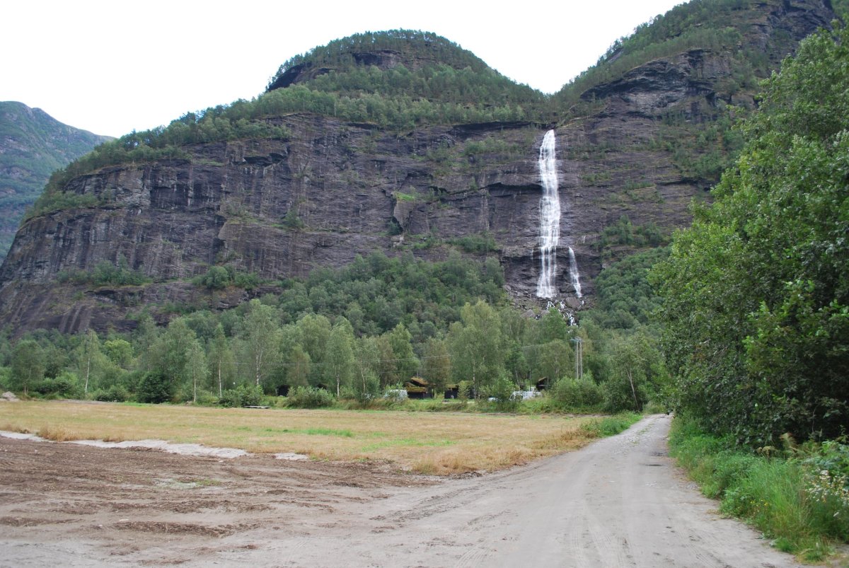 Ráno se nasnídáme v tom nejhezčím počasí, sbalíme se na výlet jdeme asi 3 km do kopce, podél řeky k vodopádu. Docela prší, za chvíli máme úplně mokré boty, je jedno jestli goretex a impregnace, ponožky se dají ždímat. U paty vodopádu je turistická knížka (všude po Norsku je jich docela dost) tak se tam zapíšeme a jdeme ještě kousek nahoru, i když v dešti. Po chvíli se ale otočíme a jdeme zpět, v tomhle dešti nemá cenu se sápat někam na vrcholky, je mlha, a z oblohy padají docela proudy vody. Po cestě na zpět Štěpa nakrmí ovečky jablkem. U auta se převlékneme a sbalíme se a jedeme zpět přes Fresvik a Vangsnes k nejhezčímu ramenu Sognefjordu. Přes městečka Vinje, Oppheim do Gudvagenu, kde je velká benzínka s vikingským muzeem, ale hlavně s teplou sprchou (zadarmo, ale klidně bych za ní i zaplatila). Takže Štěpa se jde podívat na bunkry, kousek od benzínky a já se jdu umýt. Pak jedeme do městečka Bakka, kde je hezký kemp u vody s kostelem. Trochu se tam projdeme, trochu přestalo pršet a vykoukla i modrá obloha, ale jenom na chvilku. Pak jedem najít místo na spaní, nic moc se nedá najít, nakonec sjedeme ze "žluté" silnice na "bílou" (mapy.cz) a spíme u odbočky na lesní cestu poblíž městečka Skulestadmoen. Celou noc prší, i ráno :(.