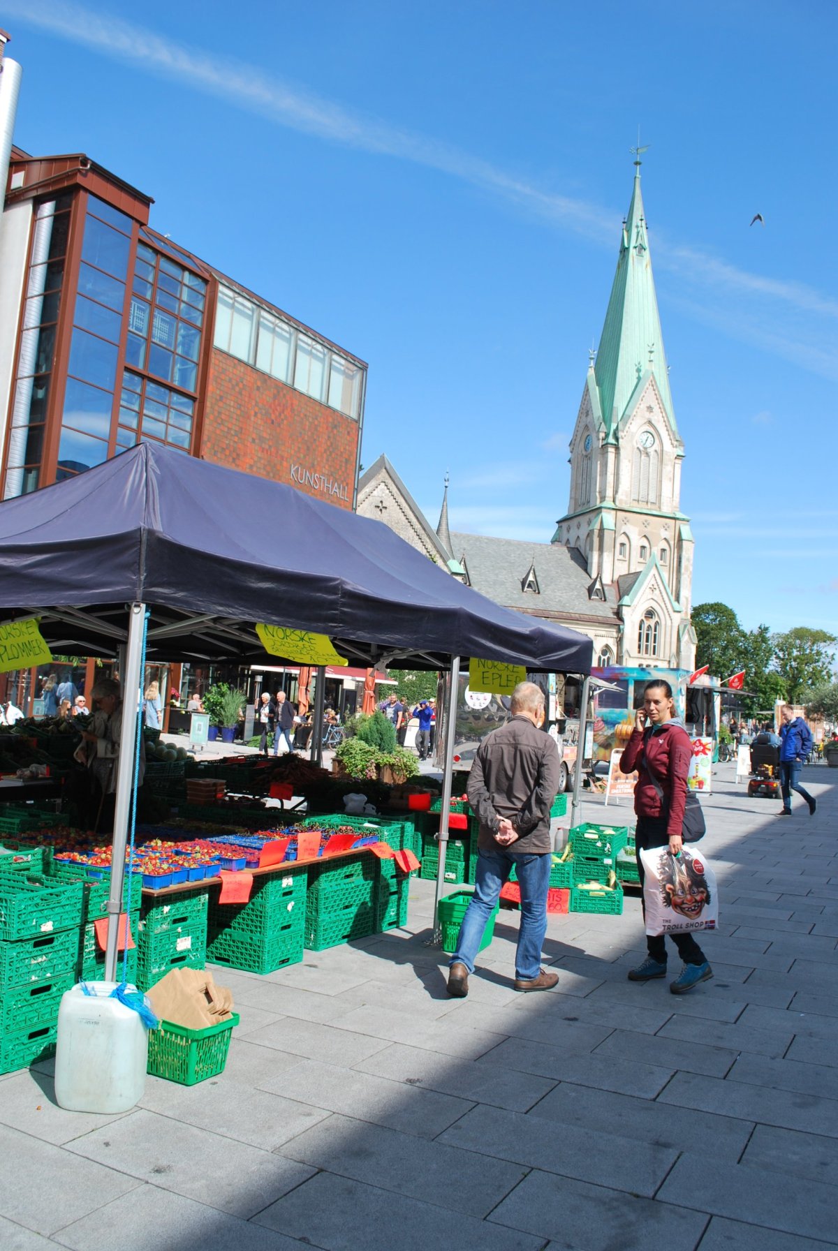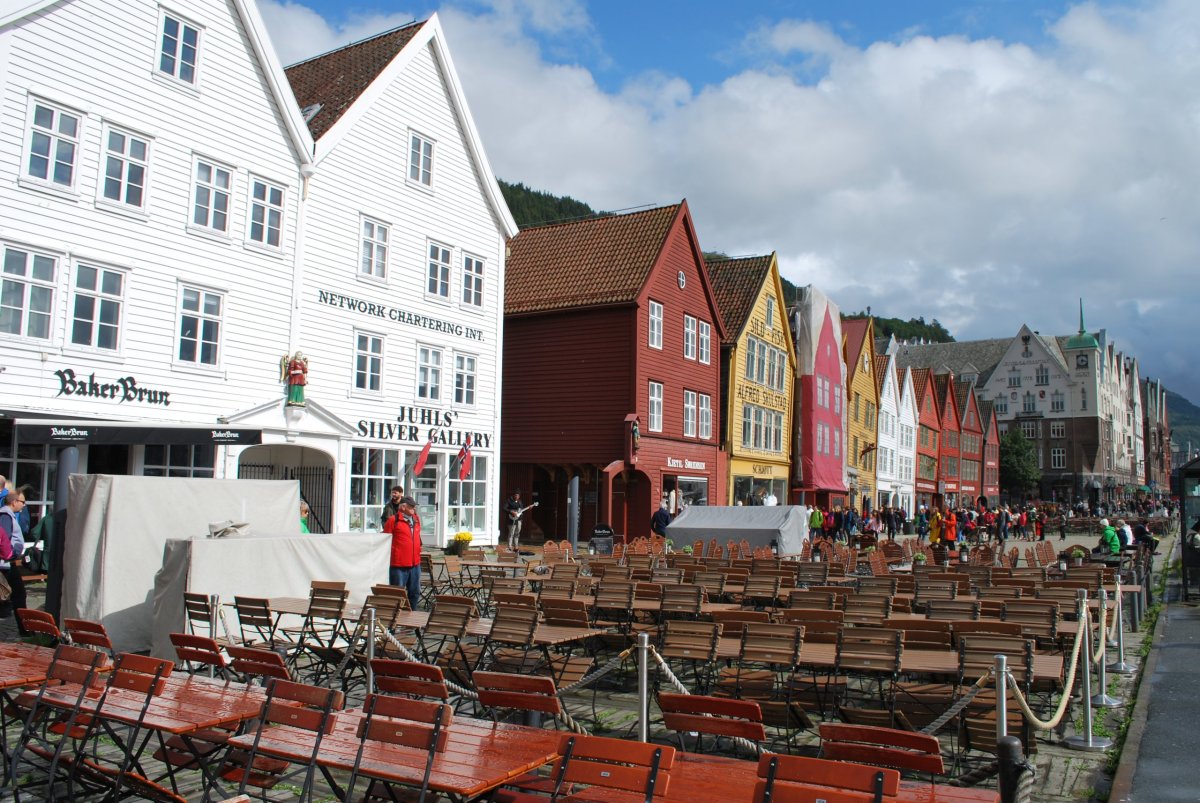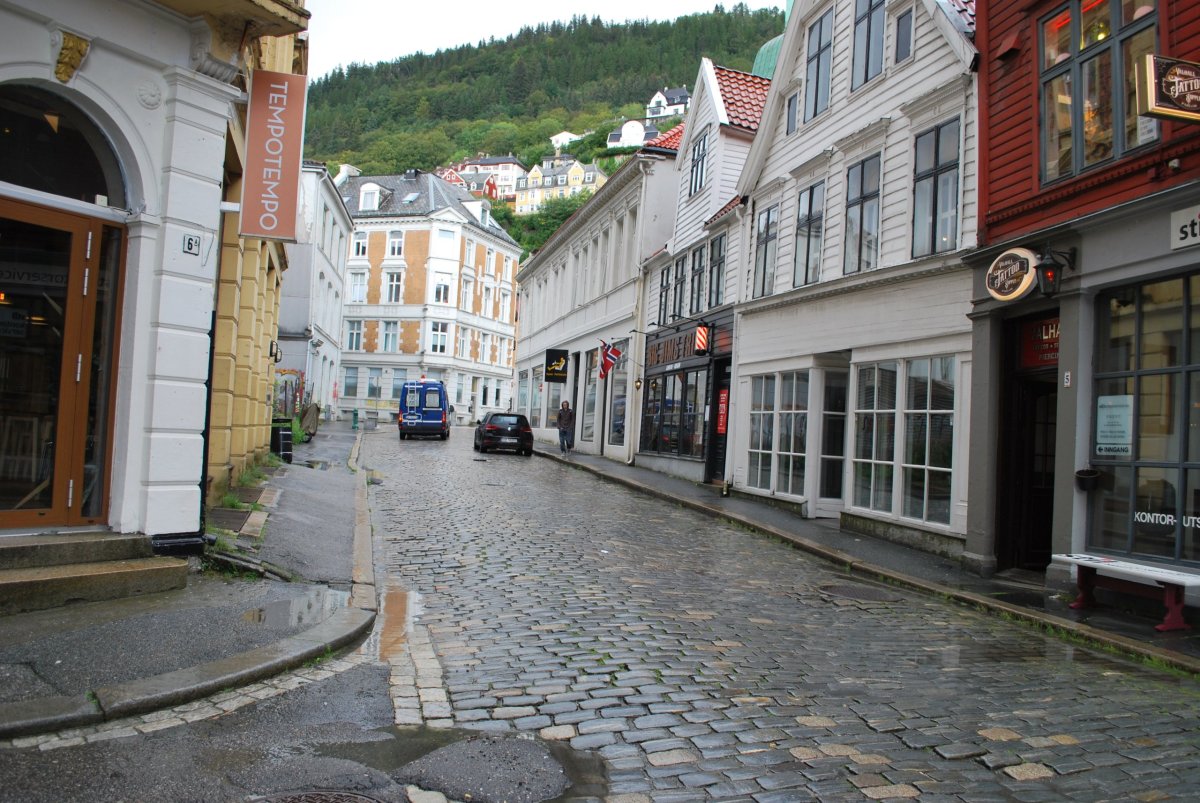 Ráno trochu prší. Včera po příjezdu jsem zarezervovala trajekt z Kristiansandu do Hirsthalsu, na sobotu ráno v 8:30. Nasnídáme se a jdeme na procházku do města. Projdeme hansovní čtvrť Bryggen, s barevnými domečky a rybí trh, kde si dáme rybí koláčky – ty jsou teda nic moc, ani ten svůj nedojím, dám ho Štěpánovi a ten s tím taky docela bojuje :). Počasí je proměnlivé, chvíli prší, chvíli ne, když prší, tak zalezeme do giftshopu, kterých je tu spousta, Štěpána to po dvou, třech přestane bavit :). Na trhu koupíme salám z losa, soba a velryby, šátky, magnetky. Pak jdeme do vojenského muzea, vstup je zdarma a mají tam kafe a čaj. Muzeum je hezké. Pak jdeme na hradby. A pak jdeme zpět do města, najít obchod s alkoholem. Mají tam pravděpodobně jenom jeden, na celý Bergen, v takovém velkém nákupním centru. Koupíme víno (málem jsme koupili nealkoholické víno) a pak si zajdeme do kavárny, na kávu a koláč. Pak jdeme domů na večeři a víno.