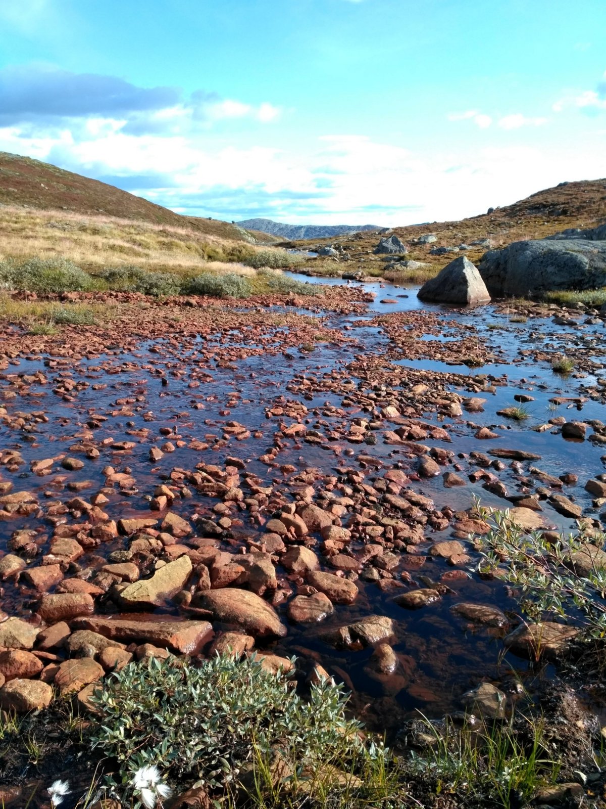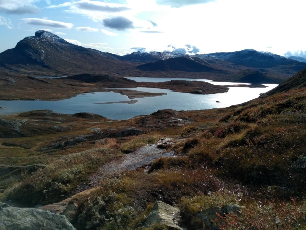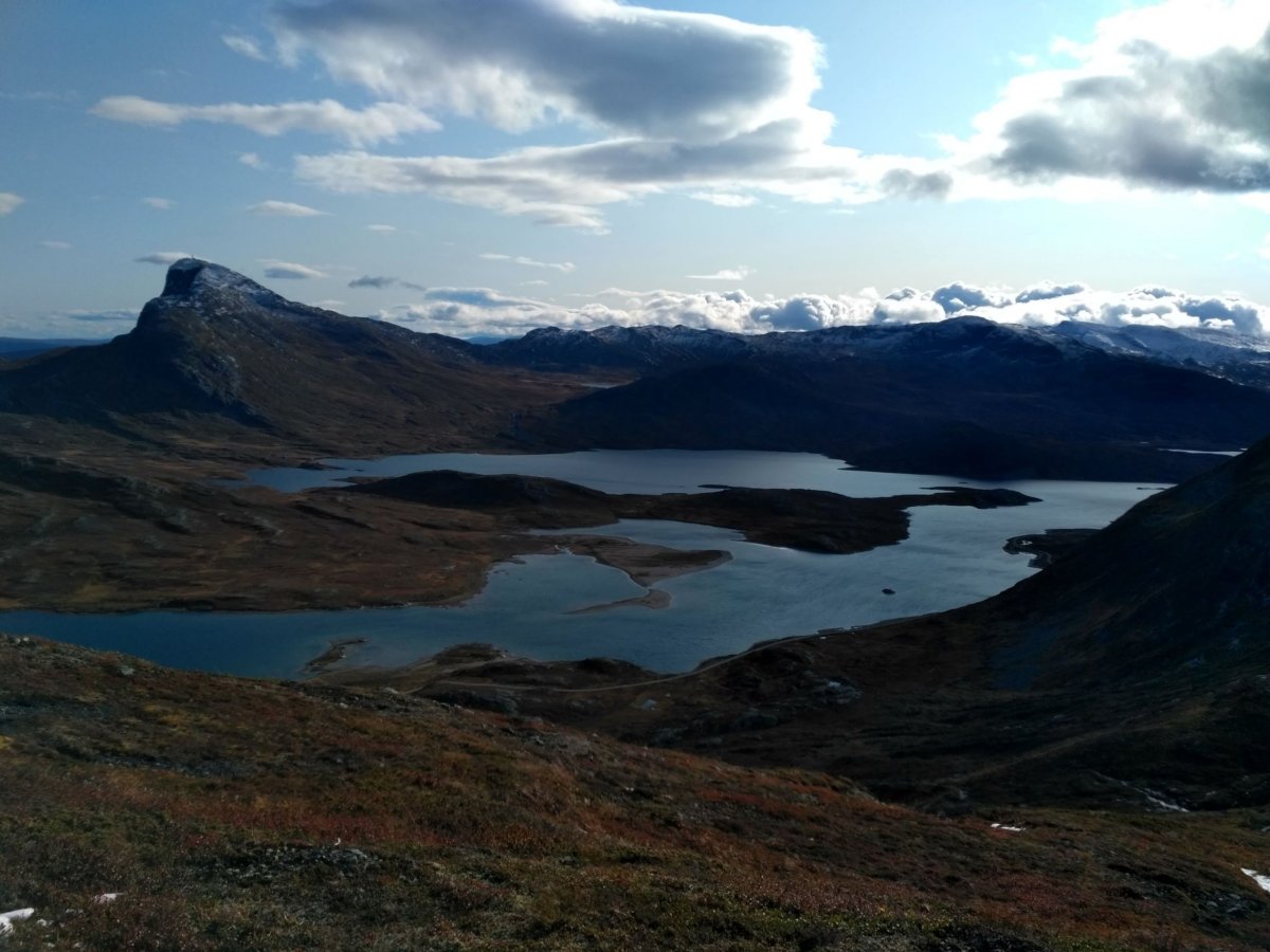 Tam, nahoře na Synshornu jsme cítili první feel opravdového Norska. Ohromný otevřený prostor od obzoru k obzoru, v dálce strmé zasněžené skály, pod námi lesknoucí se jezera, rozlitá do šířky na náhorní planině, nahoře rezavo, pusto, nevlídno a přeci tam cítím silný pocit bujícího života. Ostré slunce a ledový vítr.