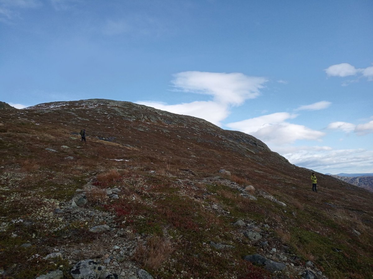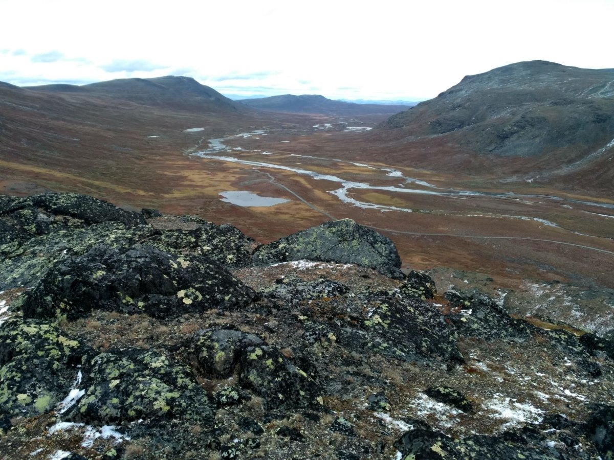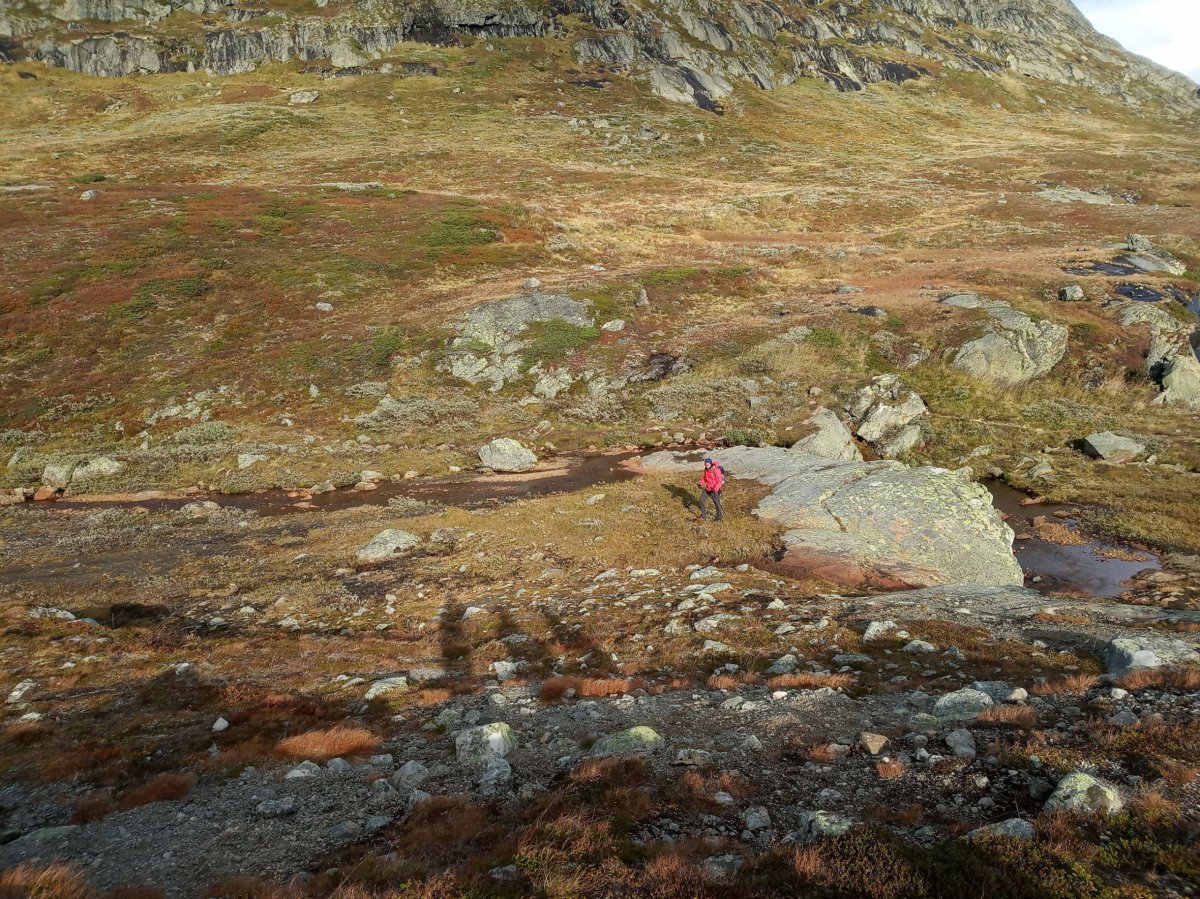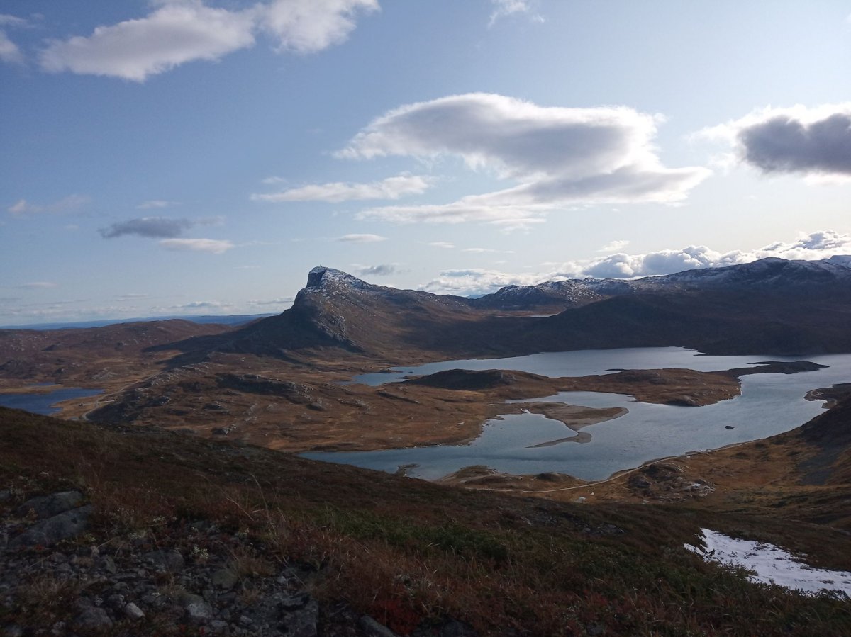 tak oznamuji, že návrat bude o něco dřív, neb bych nerad těch padesát kilometrů zpátky kráčel pěšky, až někde zapadnem. Zatím to vypadá bezpečně, ale fakt nevím, co to v Norsku znamená, když "má sněžit". Každopádně čas vylézt aspoň na malý kopec a rozhlédnout se dolů do údolí máme. Až to budu za patnáct let hledat, tak kopec se jmenoval Bergenusshaugen (1496 m).