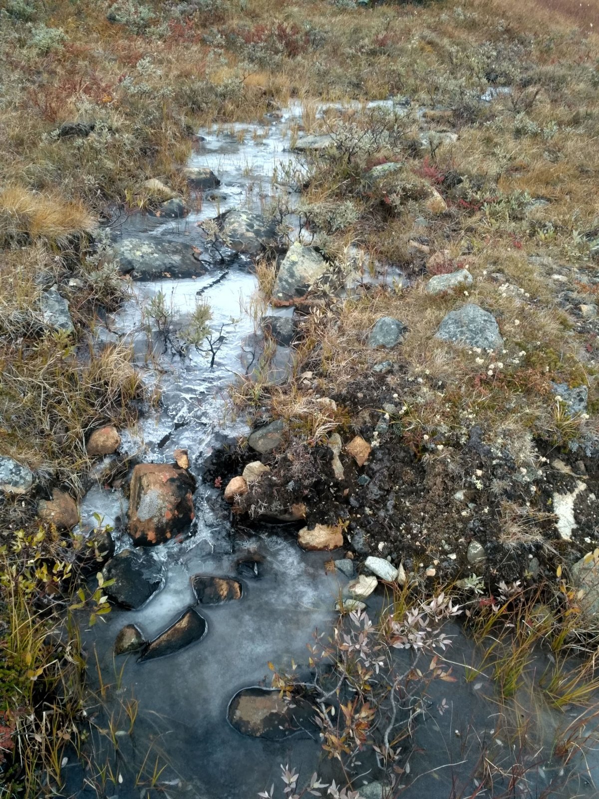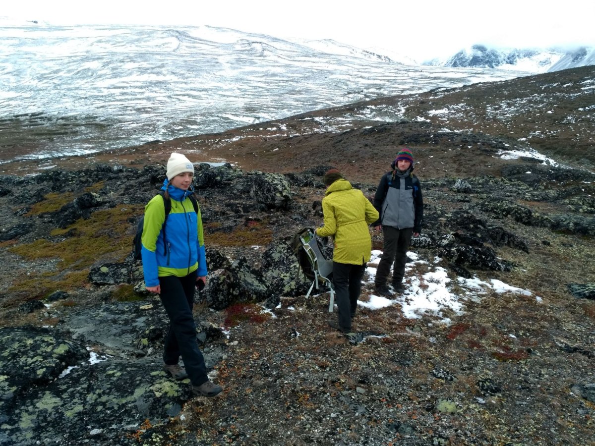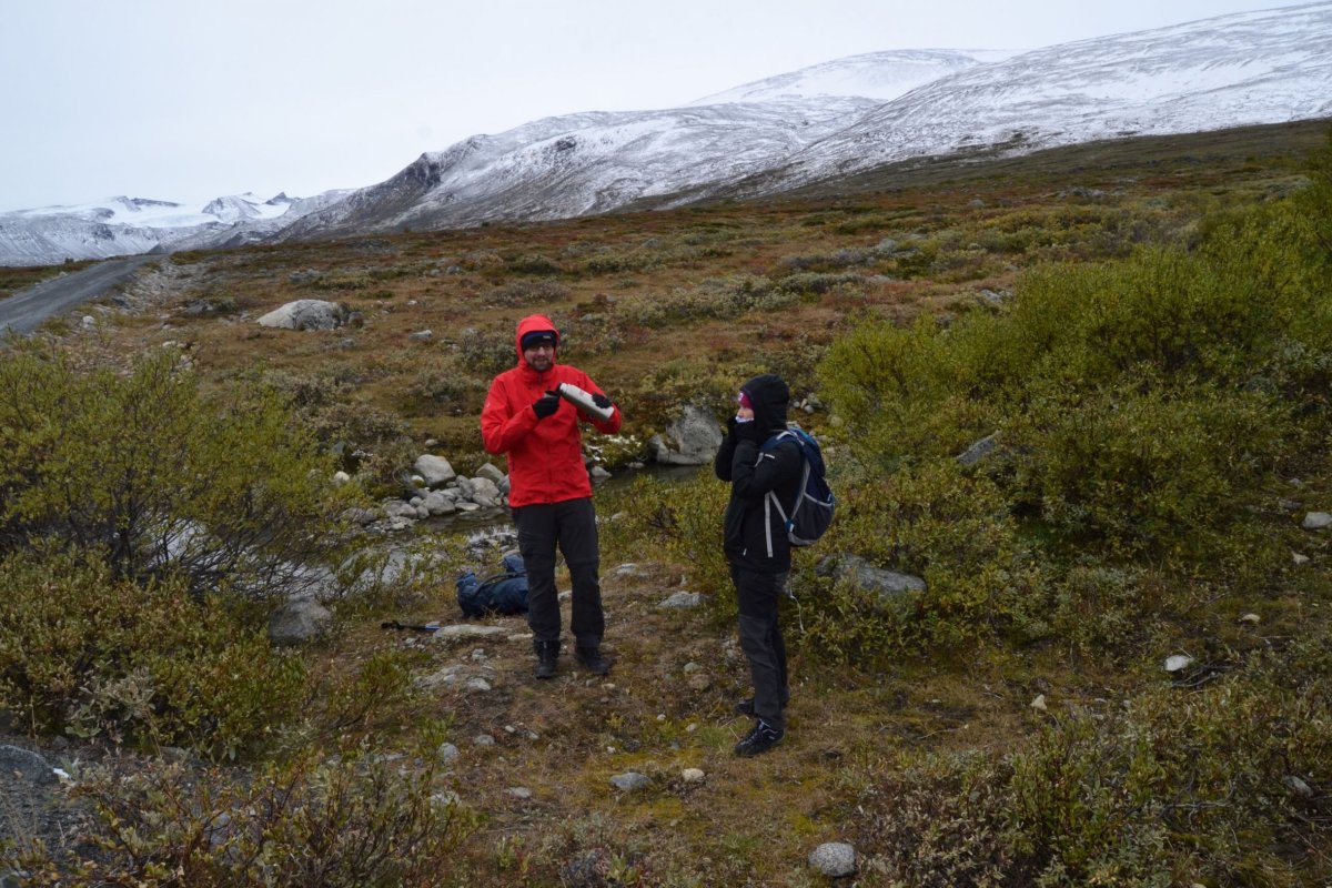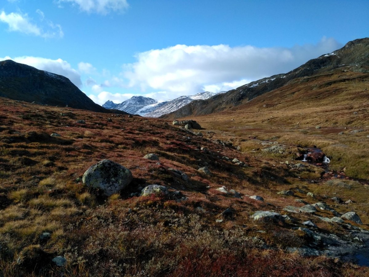 tak oznamuji, že návrat bude o něco dřív, neb bych nerad těch padesát kilometrů zpátky kráčel pěšky, až někde zapadnem. Zatím to vypadá bezpečně, ale fakt nevím, co to v Norsku znamená, když "má sněžit". Každopádně čas vylézt aspoň na malý kopec a rozhlédnout se dolů do údolí máme. Až to budu za patnáct let hledat, tak kopec se jmenoval Bergenusshaugen (1496 m).