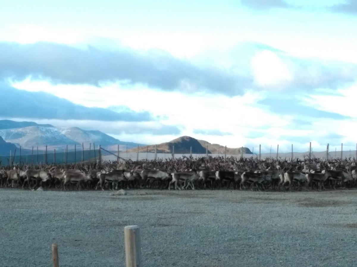 Po sestupu ze Synshornu pouštíme v autě topení na max, sjíždíme dolů a po chvíli opět vyjíždíme nahoru na další planinu. Pomalu se stmívá a u malé chalupy stojí na parkovišti asi patnáct aut. To je podezřelé, v rychlosti brzdím a smykem na šotolinovém parkovišti taky zastavuju. Vylézáme a po chvilce vidíme důvod - je to sobí farma. Tisícihlavé sobí stádo se pase na úbočí hory. Okolo plotu pobíhá několik fotografů s teleobjektivy. My to máme přesně proti světlu, ale rád bych si je taky vyfotil. V "pantoflích", které používám na řízení, se tedy snažím oběhnout sněhem a ledem pokrytou planinu. Studí to a když za několik minut doběhnu s durch promočenými ponožkami na druhou stranu, odkud by se stádo dalo spatřit a vyfotit pěkně, zjišťuju, že milí sobi nečekali a přemístili se na úbočí tak vysoko, že už nejsou vidět. Zklamaně se vracím zpátky a zjišťuju, že druhá půlka stáda je na druhé straně silnice za neprůhledným plotem. Se šikovností sobě vlastní se tedy šplhám před zraky pobavených přihlížejících na malou skalku, odkud je přes plot vidět. Ohromné stádo tvoří kruhovitý útvar. Polovina sobů kluše po jeho obvodu a vydává přitom zvuky podobné blížící se bouřce. Druhá polovina stojí nehybně uvnitř kruhu. Fascinující sobí tanec připomíná pravěké pohanské rituály.