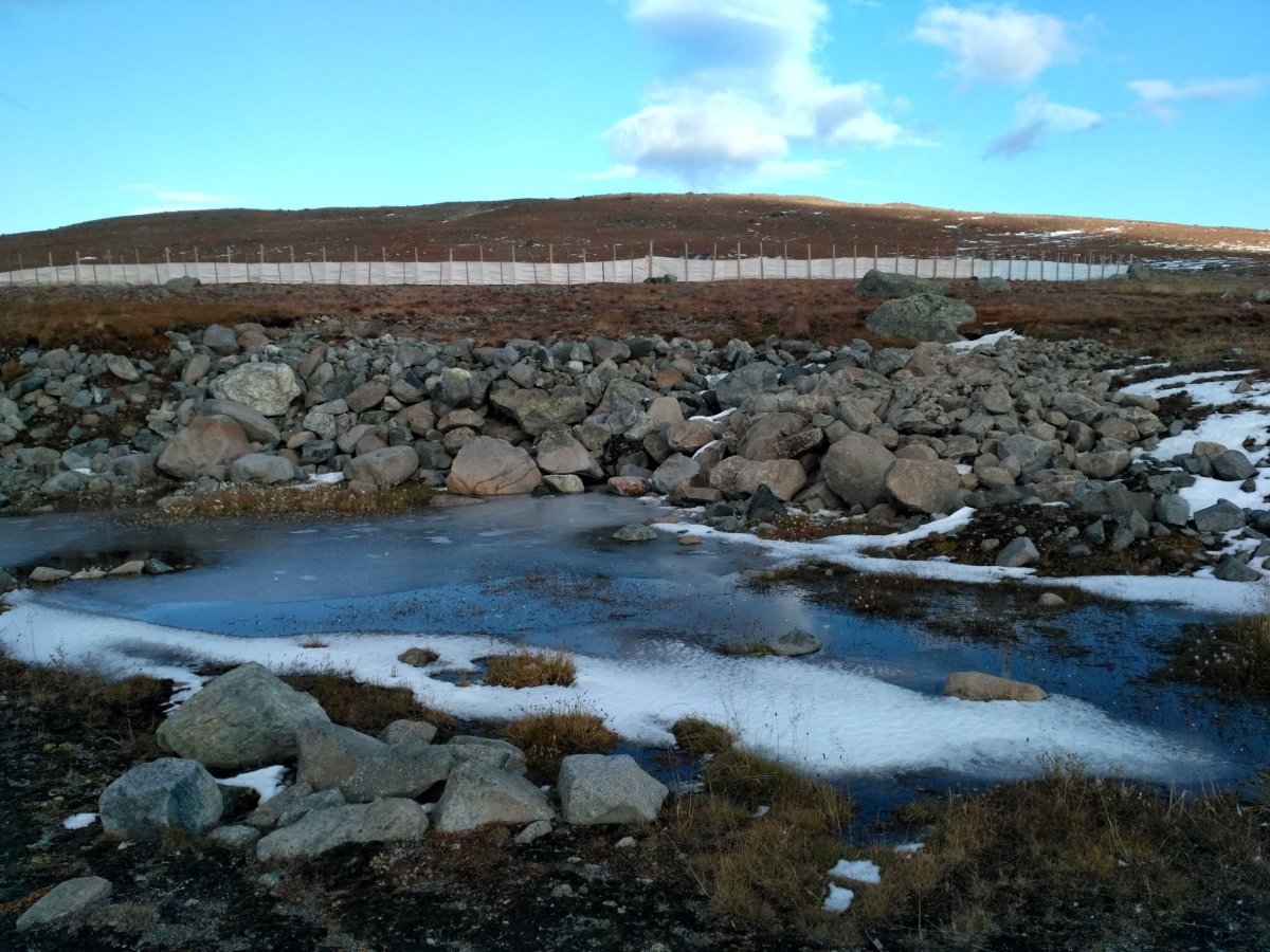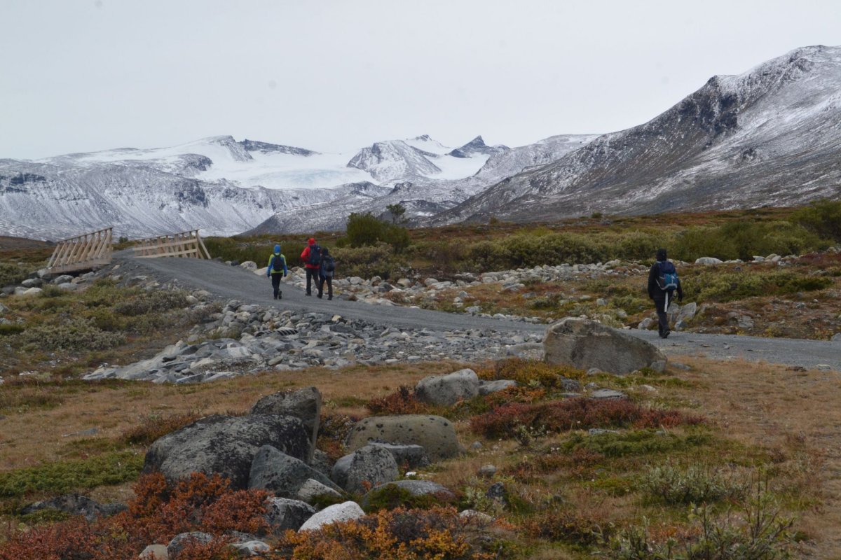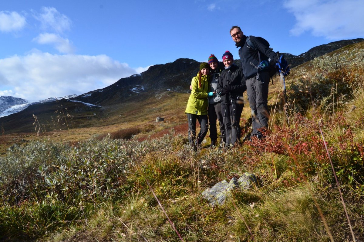 Auto necháváme u cesty a když chceme vystoupit, tak mě překvapuje, jak ledový vítr tady v tisíci metrech fouká. Teplota a vítr se vůbec neslučuje s tím, jak ostře svítí slunko. Oblékáme si neprofukavé bundy, čepice, rukavice a vyrážíme na kopec Synshorn. Vede tam ferrata, prý nejhezčí v celém Norsku, ale jsme turisti a já mám navíc smrtelnou hrůzu z exponovaného terénu, takže celkem nepřekvapivě volíme pěší cestu.
