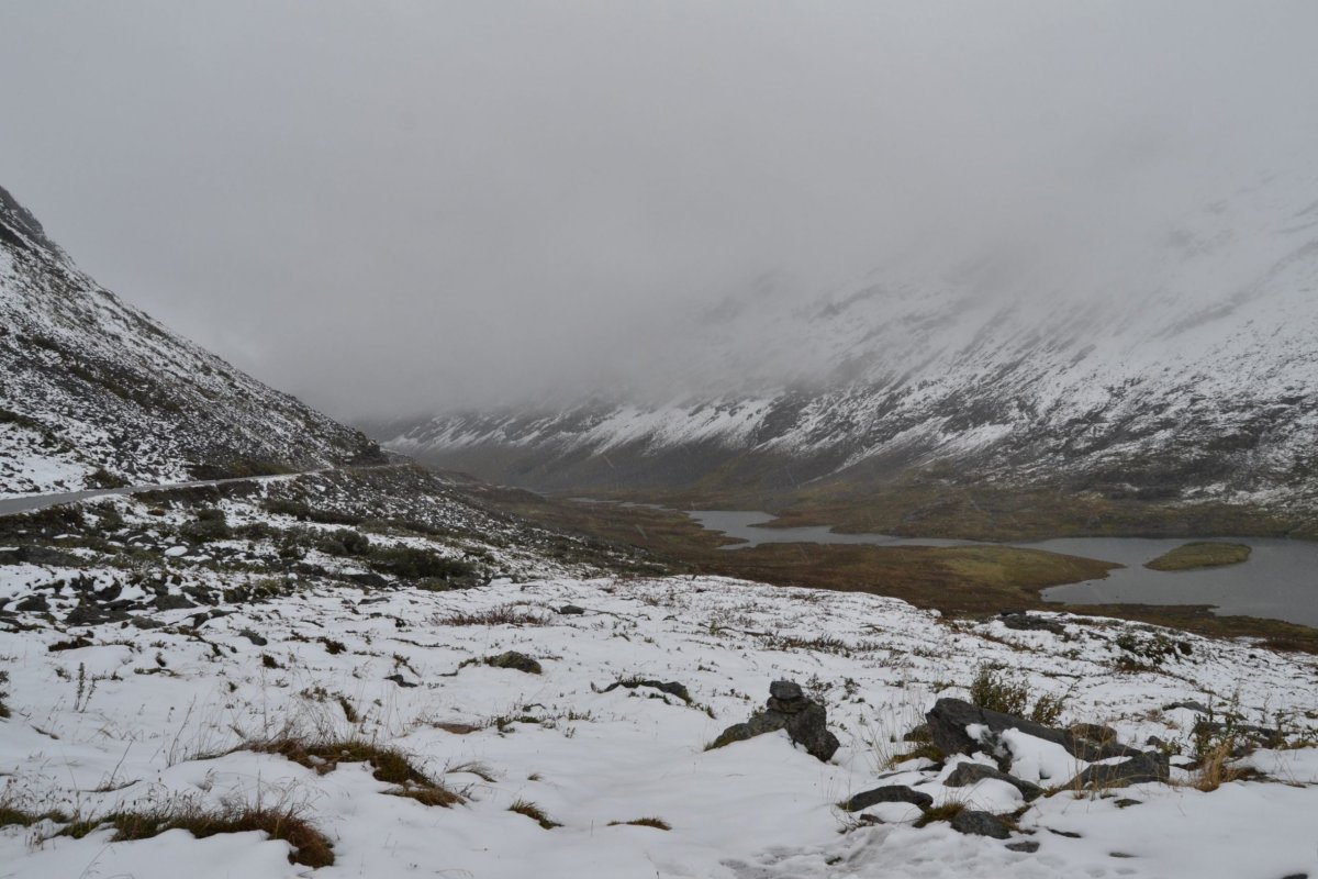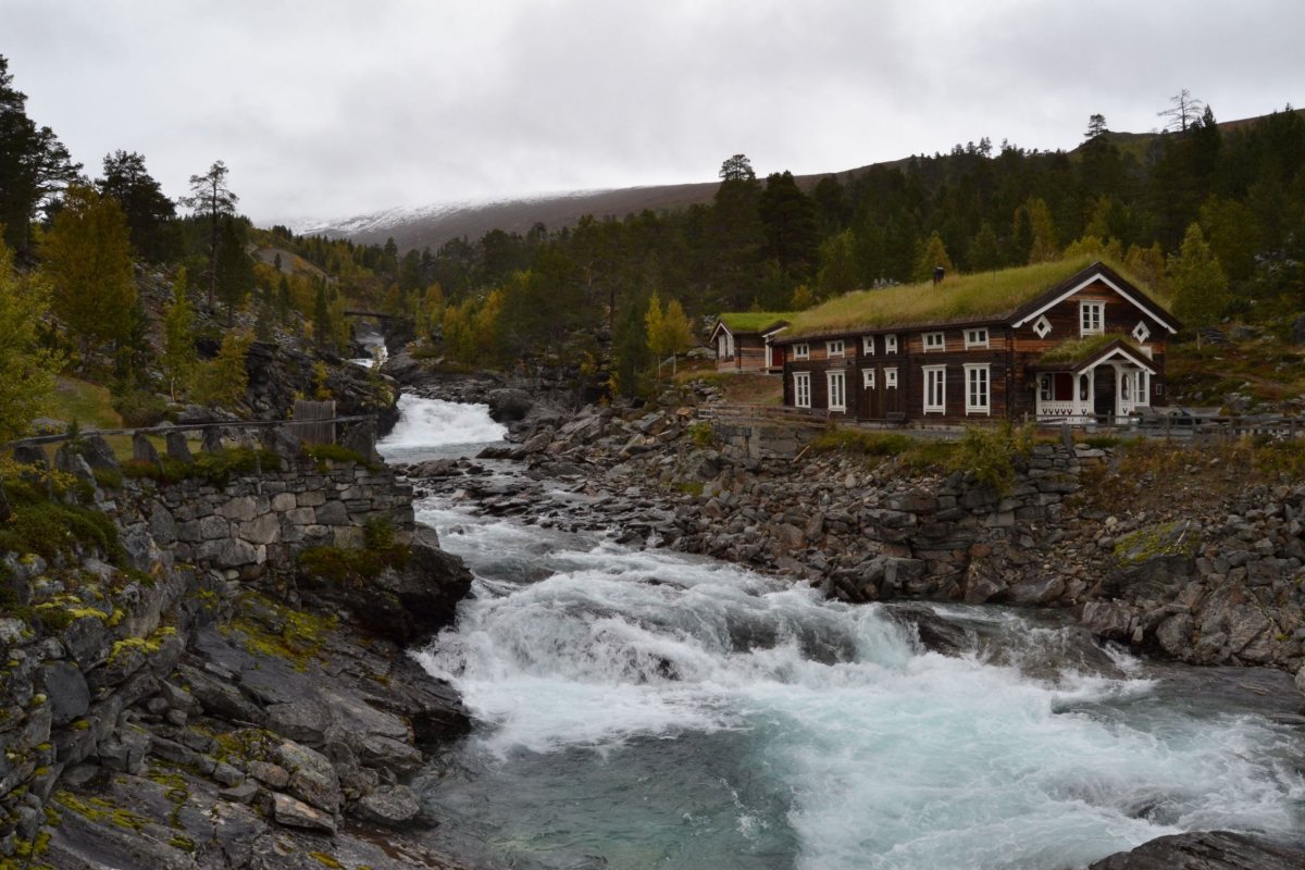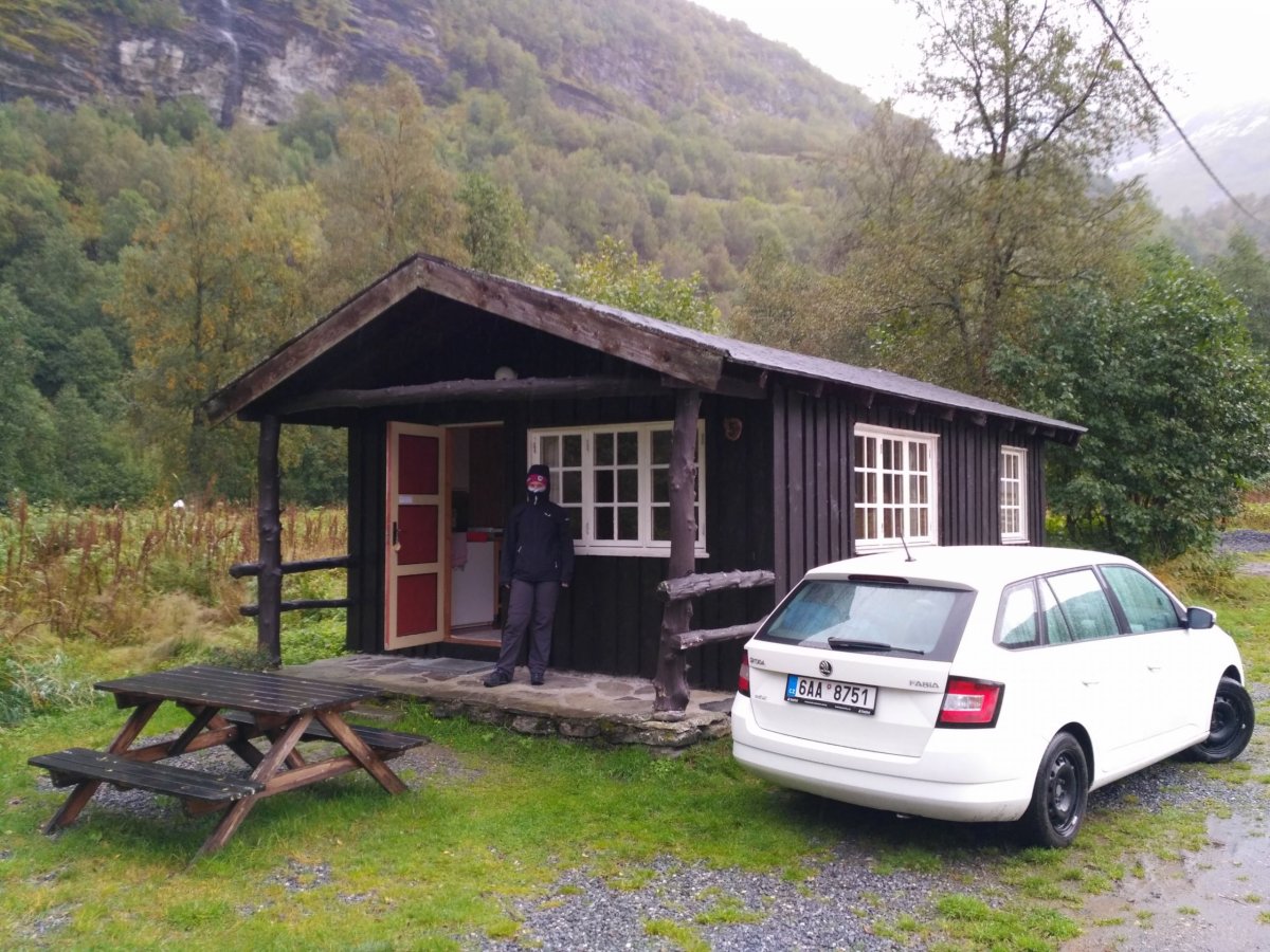 Dole pod sedlem u známé vyhlídky Dalsnibba nás překvapuje závora uprostřed silnice. Naštěstí je zvednutá, ale divíme se, k čemu tam je, když nikde v okolí není ani železniční trať, ani koridor pro přechod sobích stád přes silnici. Nahoře v sedle pochopíme. Sněží a naštěstí je těsně nad nulou, takže se na silnici nedělá námraza, jinak bychom si v serpentinách dolů asi pěkně poklouzali. Když všechny serpentiny úspěšně vytočíme (stavíme v každé druhé zatáčce, protože tyhle výhledy si prostě musíme užít/vyfotit), otevře se před námi nejromantičtější kemp, jaký jsme viděli. Malé hobití chatičky, porostlé travou, přímo pod padajícími vodopády a do výšky se tyčícími skalnatými stěnami.