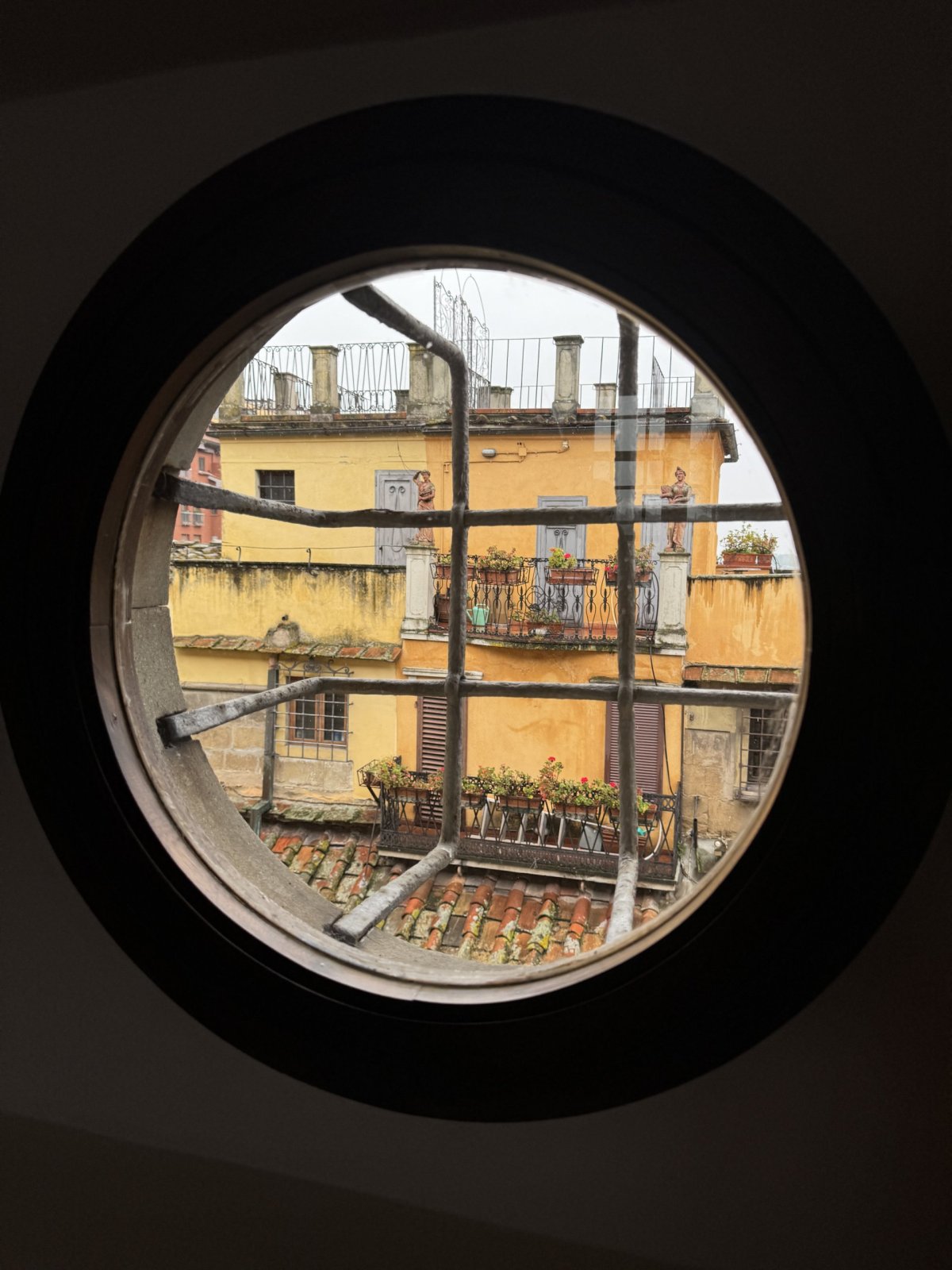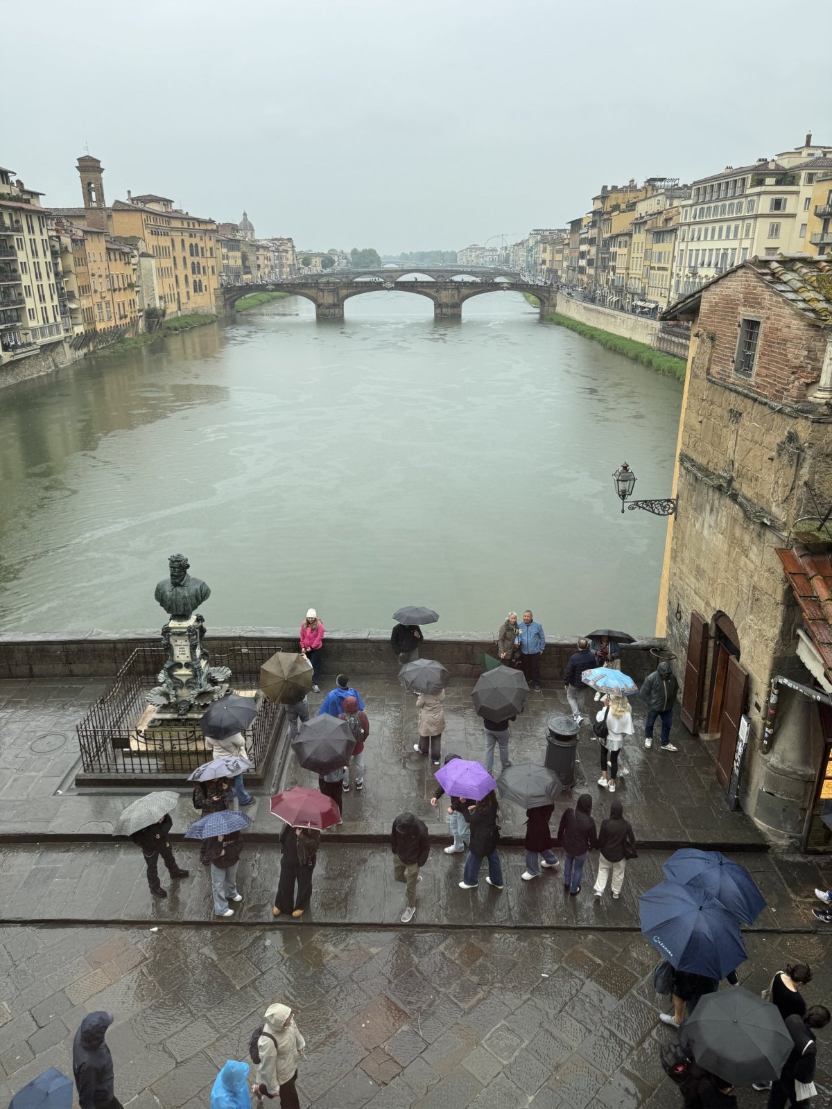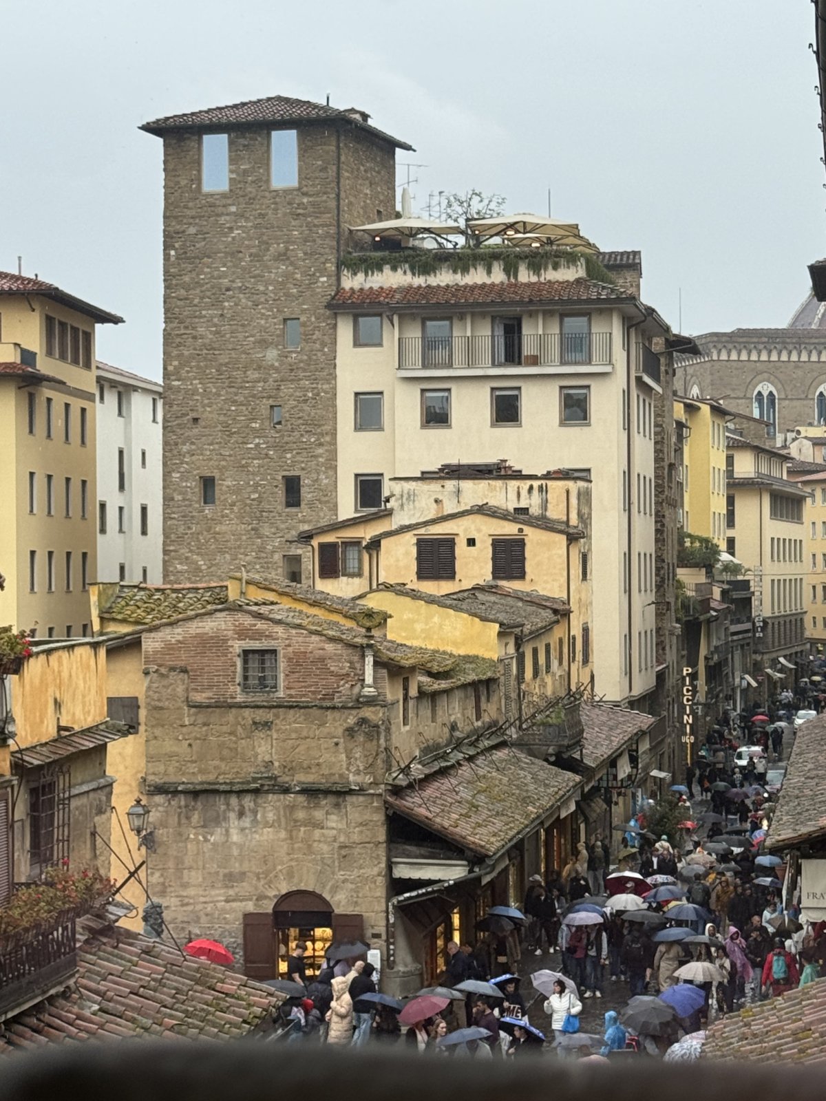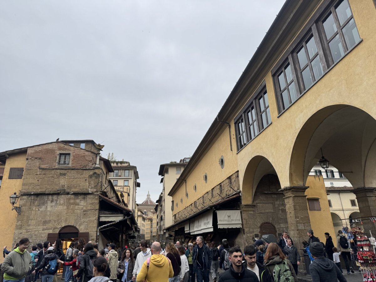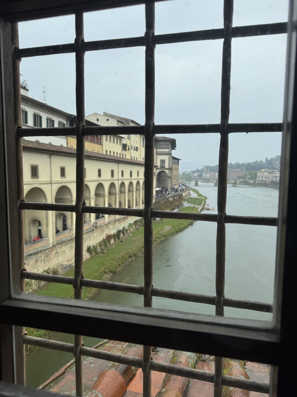 Po celé délce nechal architekt Vasari prorazit okénka, aby se dalo shlížet do ulic. V té době byly ještě na mostě Ponte Vecchio masné krámy řezníků. A protože to strašně smrdělo a vévodovi by to vadilo, byly na jejich místě otevřeny prodejny zlatníků, které tam jsou doteď.