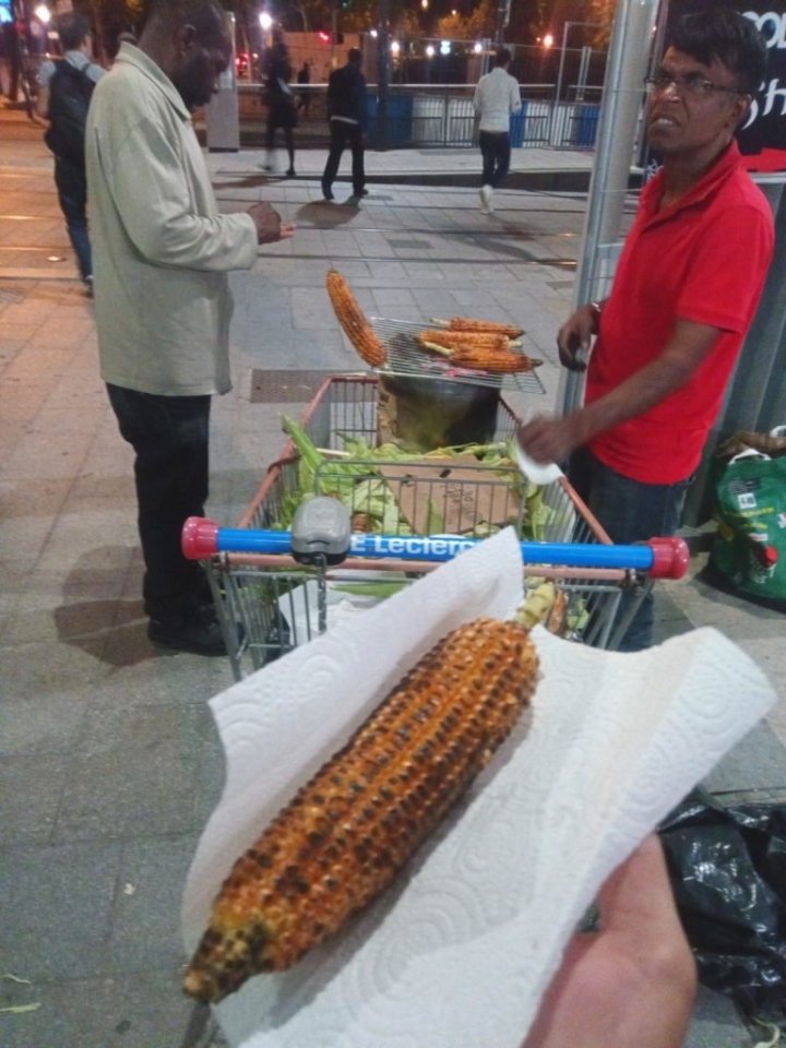 U stanice metra Les Courtiles celé tři dny postával jeden, zřejmě indický imigrant, který si tam otevřel nepříliš legální business s grilovanými kukuřicemi. Byl jsem vyloženě zklamán, když jsme byli cestou na metro svědkem zásahu místní policie, která u pána zkušeně zastavila se svojí dodávkou, vytáhla z ní petláhev s vodou, gril svědomitě uhasily a za zběsilého máchání před obličejem jednou z kukuřic, dali pánovi pokutu a vyhnali ho pryč. Doufal jsem totiž, že tuhle zajímavou pochoutku, na kterou se den předtím stála dokonce fronta, ochutnám.