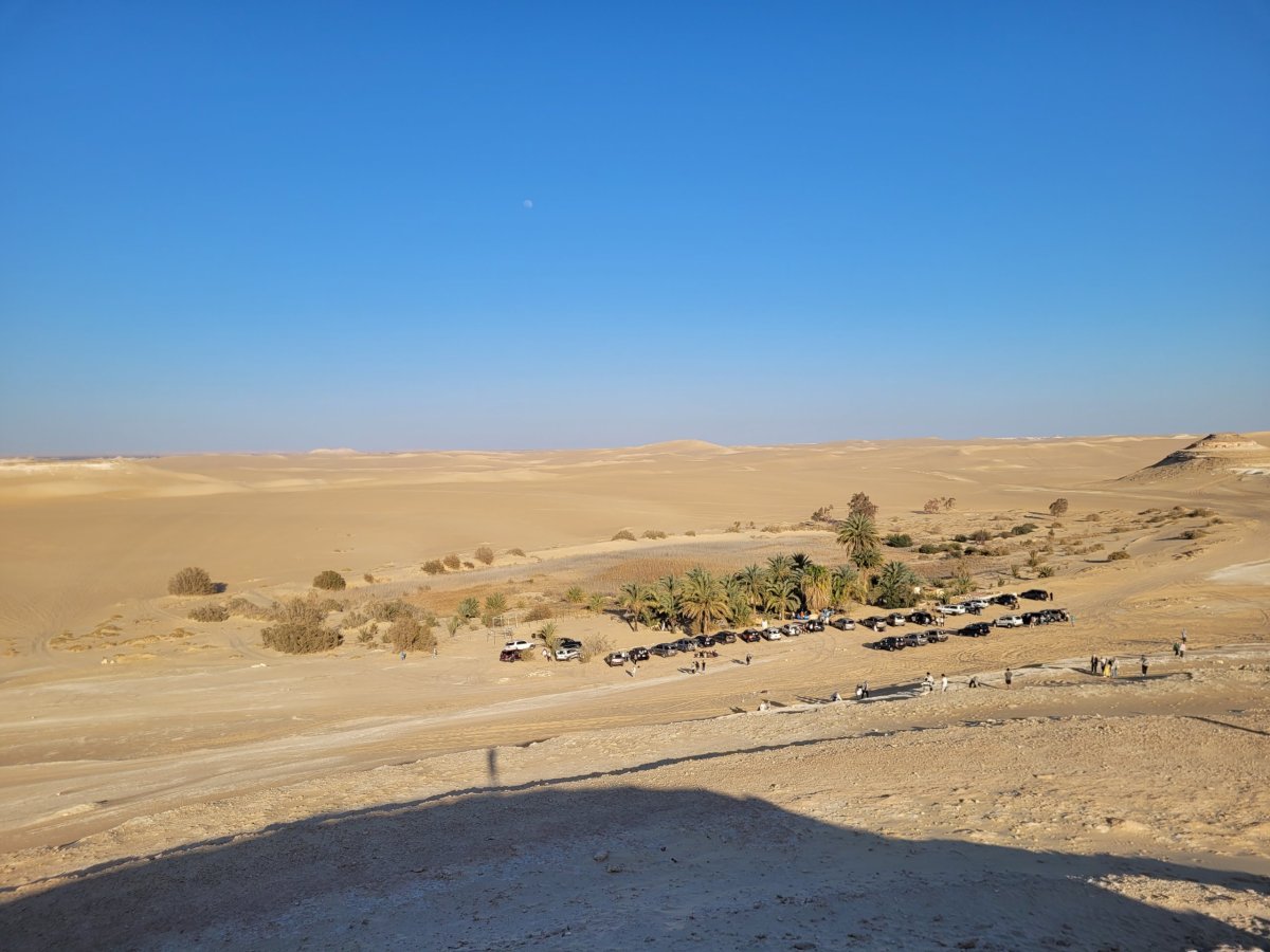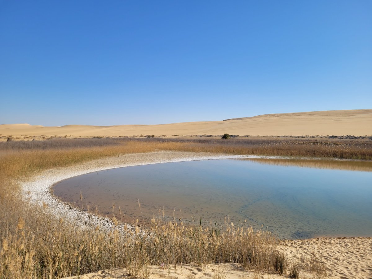 Odpoledne nás čeká jeep safari s místním berberem, mezi duny, do pouště. Výlet začíná ve velikém stylu. Na dálnici je maximální povolená rychlost maximálně 120 km/h a vypadá to, že si náš řidič plete dálnici s pouští. Jízda stodvacítkou v jemném písku nám trochu zprostředkovává zážitek, jaký mají účastníci rally Dakar. Kromě rychlé jízdy to je i jízda v náklonu na vysoké a strmé duny, jejich následné sjíždění. A pořád dokola. Pěkná horská dráha. Navštěvujeme dvě malé, neobydlené oázy. První, oáza Bir Wahed Cold Spring je s větší vodní plochou, mírně slanou, ale studenou vodou. Druhá, Bir Wahed Sulphuric Hot Spring, má teplý pramen s malým koupacím bazénkem. Dojem z druhého místa mi kazí pouze veliké množství turistů, které jinak nepotkáváme.
