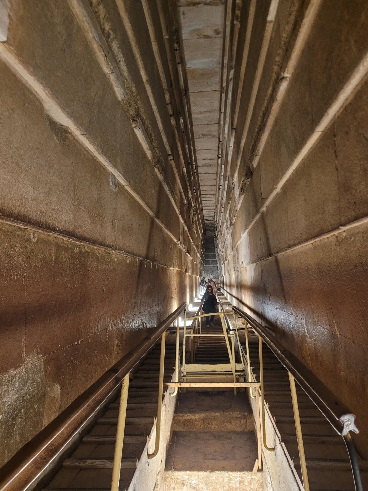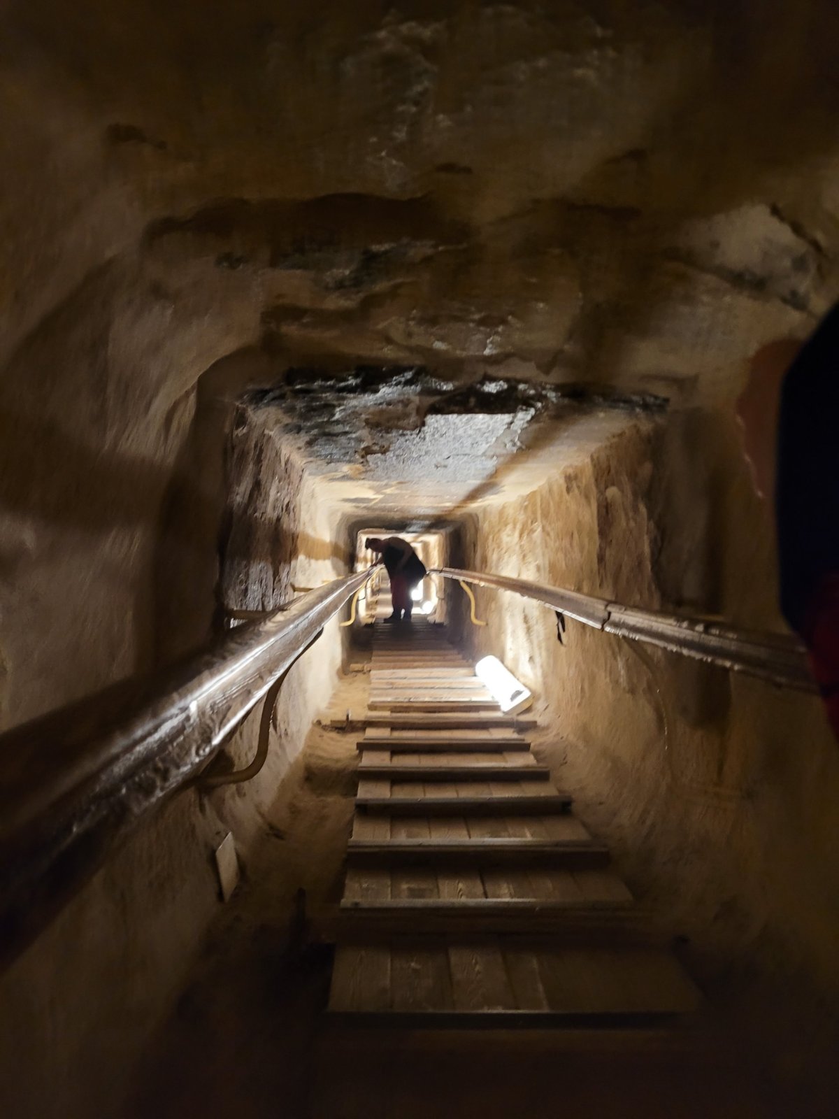 Cesta utíká rychle a nakonec dojíždíme až do Gízy. Ubytováváme se v hotelu s pěkným výhledem na pyramidy, který si užíváme hned po příletu a ráno u snídaně. Máme skvělé, strategické místo. Ráno jsme už o půl deváté u Sfingy. Jak skvěle strategické rozhodnutí byla hned ranní návštěva gízské nekropole se ukázalo především když jsme ji opouštěli a drali se pryč šíleným davem lidí. V plné sezoně to tu musí být strašné. V komplexu trávíme něco málo přes 2 hodinky. Vidíme vše podstatné včetně pohřební síně Chufuovy pyramidy. Dostat se dovnitř není snadné. Uvnitř pyramidy se podstatnou část leze úzkou, a strmou chodbou. Navíc tam je vedro a dost vydýchaný vzduch.