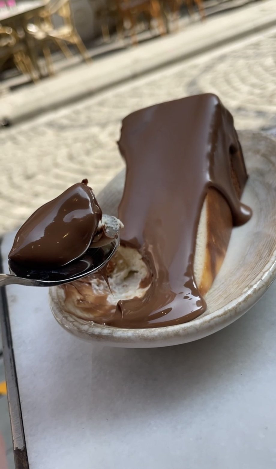 Tento legendární cheesecake pečou přímo na místě a přímo před vámi na dort nalévají horkou čokoládu, na výběr je mezi mléčnou a hořkou.