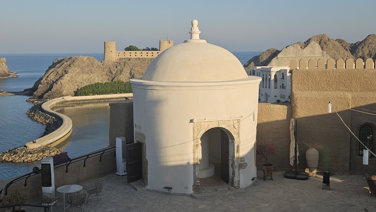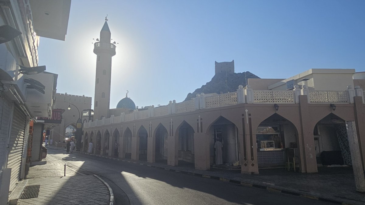 Sedáme do auta, město už je zase volně průjezdné, a pokračujeme kolem pobřeží kousek na východ do starého Maskatu, což je malé a poloprázdné městečko, tvořeno z velké části budovami ve vládní čtvrti. Cestou míjíme věž/rozhlednu na kopci, jejíž tvar odkazuje na typickou místní kadidelnici. Bohužel, všechny cesty nahoru jsou zavřené a hlídané. My se chvíli procházíme starým Maskatem a zezadu se dostáváme až na dohled sultánova paláce Al Alam (jednoho z těch, které v Ománu má). A podle vojenské stráže je jasné, že dál nemůžeme.