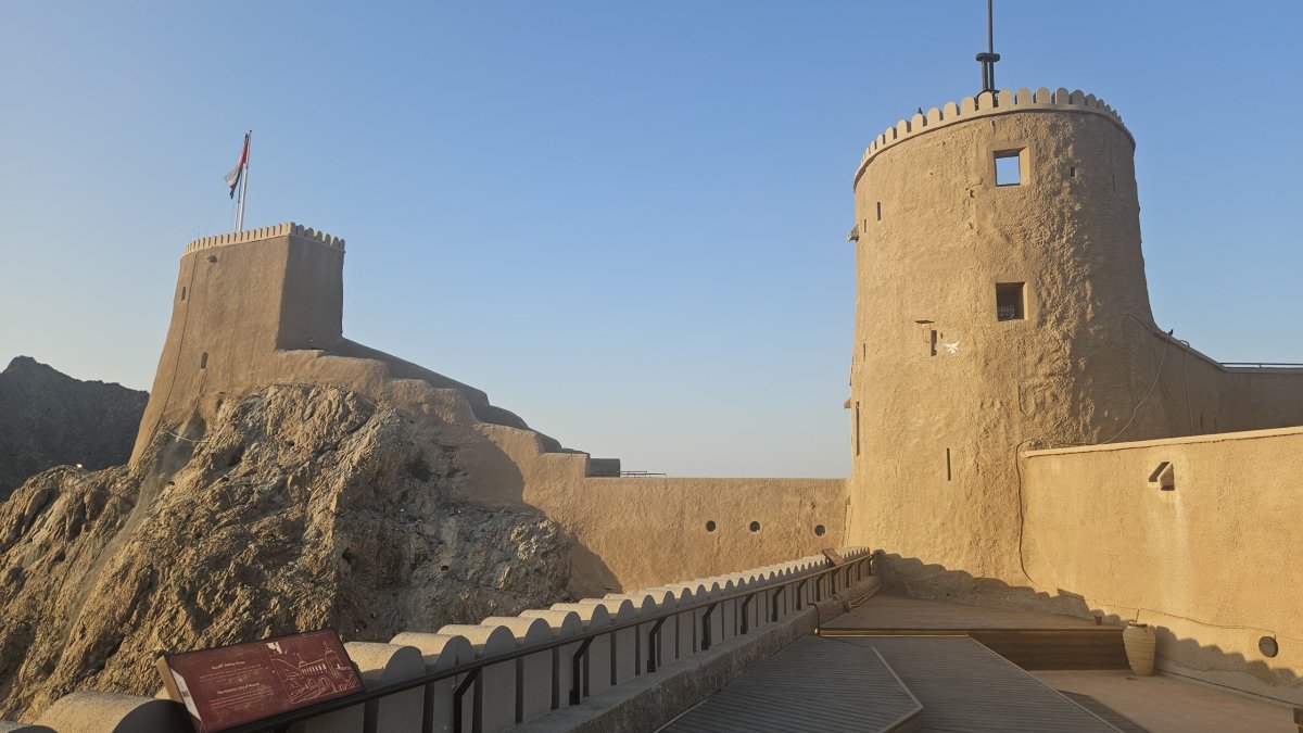 Přejíždíme pod pevnost Al-Mirani, což je moderně zrekonstruovaná pevnost na skále u pobřeží. Vstupné je 5,5 omaru na osobu (300 Kč) a my se jdeme kouknout dovnitř, kde je jen pár návštěvníků. Asi hodinu procházíme celou pevnost, užíváme si slunce a kocháme se výhledy na moře, město i barevný sultánův palác. V podvečer dokonce vidíme návrat sultánovy kolony k paláci.
