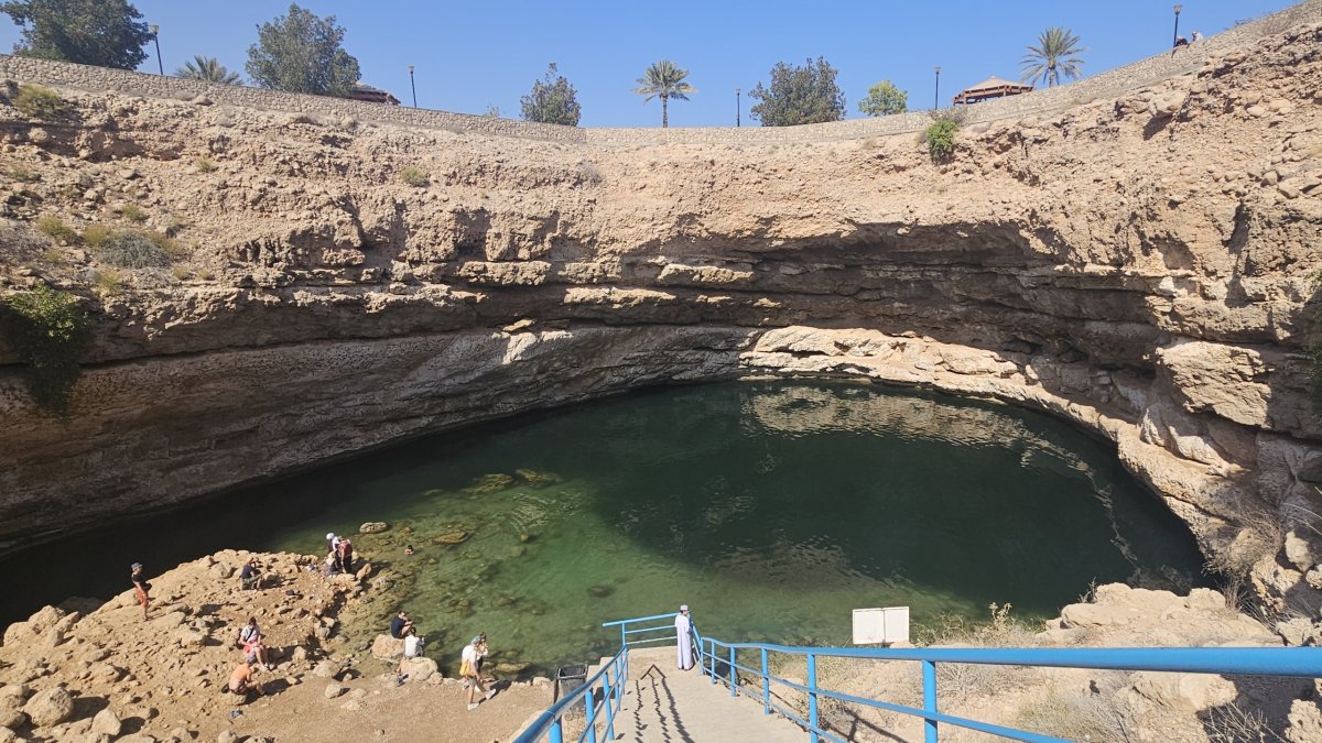 Po dni spíše relaxačním si třetí den plánujeme den výletový. Chceme se podívat na Bimmah Sink Hole, ke které to máme zhruba 140 kilometrů, převážně po dálnici. K ní volíme cestu zkratkou po čtyřproudovce přes hory, jejíž serpentiny jsou neuvěřitelným způsobem vystřílené do skal na městem. Po prázdné dálnici prakticky pustou krajinou, kterou zpestřují občasná zelená vádí, tak za necelé dvě hodiny parkujeme před oploceným, ale zdarma přístupným areálem Sink Hole. To je přírodní úkaz – asi 60 metrů široká a 20 metrů kruhová skalní propadlina, na jejímž dně je voda a dá se v ní i vykoupat (sic je zde varování, nikoliv ale zákaz).