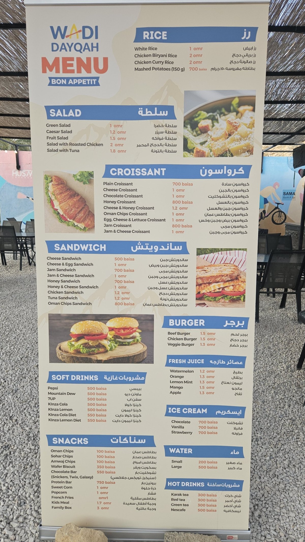 My sedáme do auta a po dálnicích valíme zpět do Maskatu, kde chytáme podvečerní dopravní špičku. Naposledy si užíváme až do zavíračky střešní bazén a na večeři tentokrát nejdeme do obchoďáku, ale míříme poprvé do regulérní restaurace Al Deyar Café hned vedle hotelu. A za jídlo, typický místní mix grill, dáváme 5,5 omaru (300 Kč), porci, která se nedá sníst. Jen je fakt divné takovou baštu zapíjet džusem …