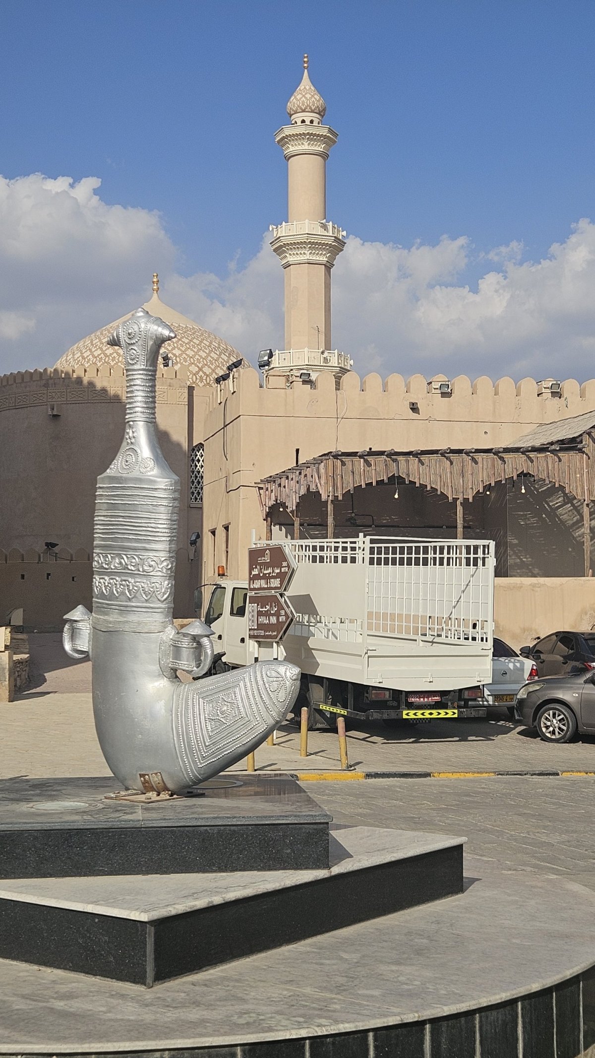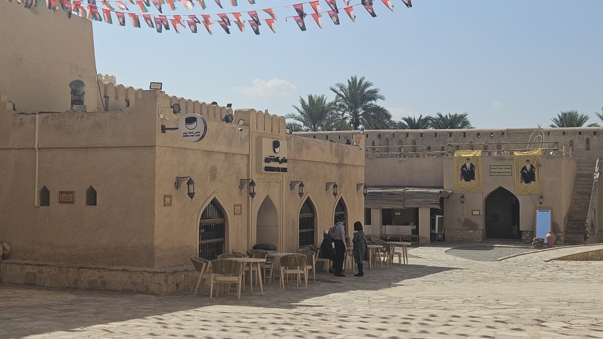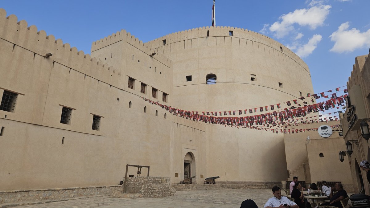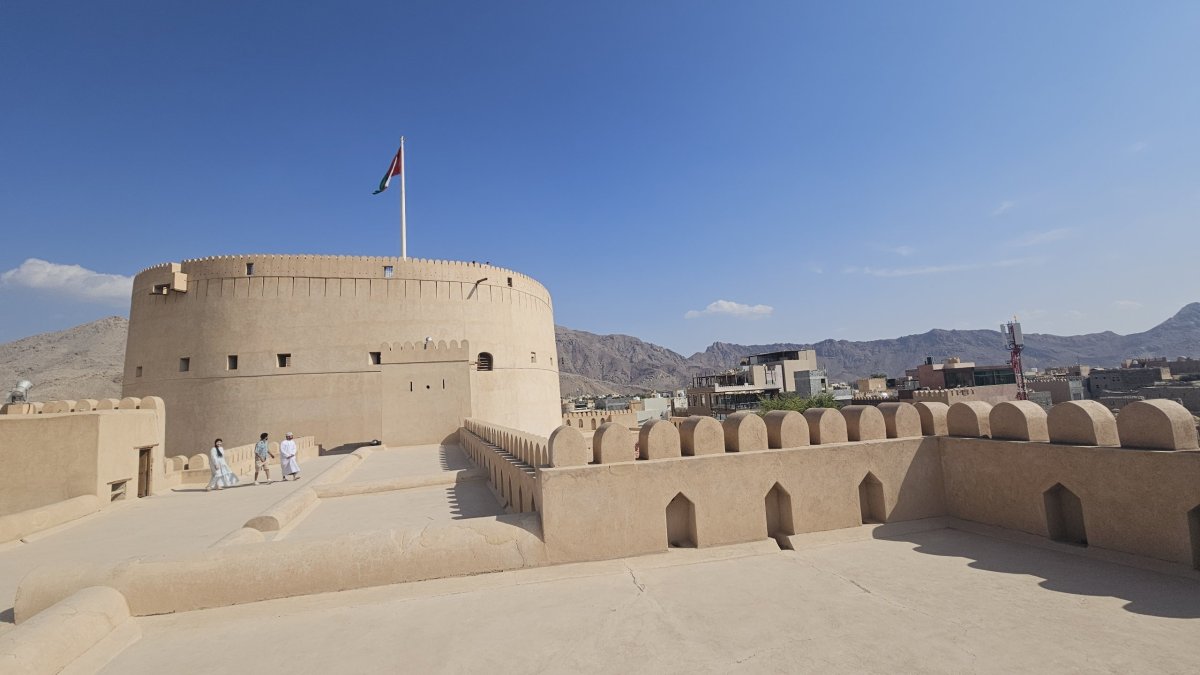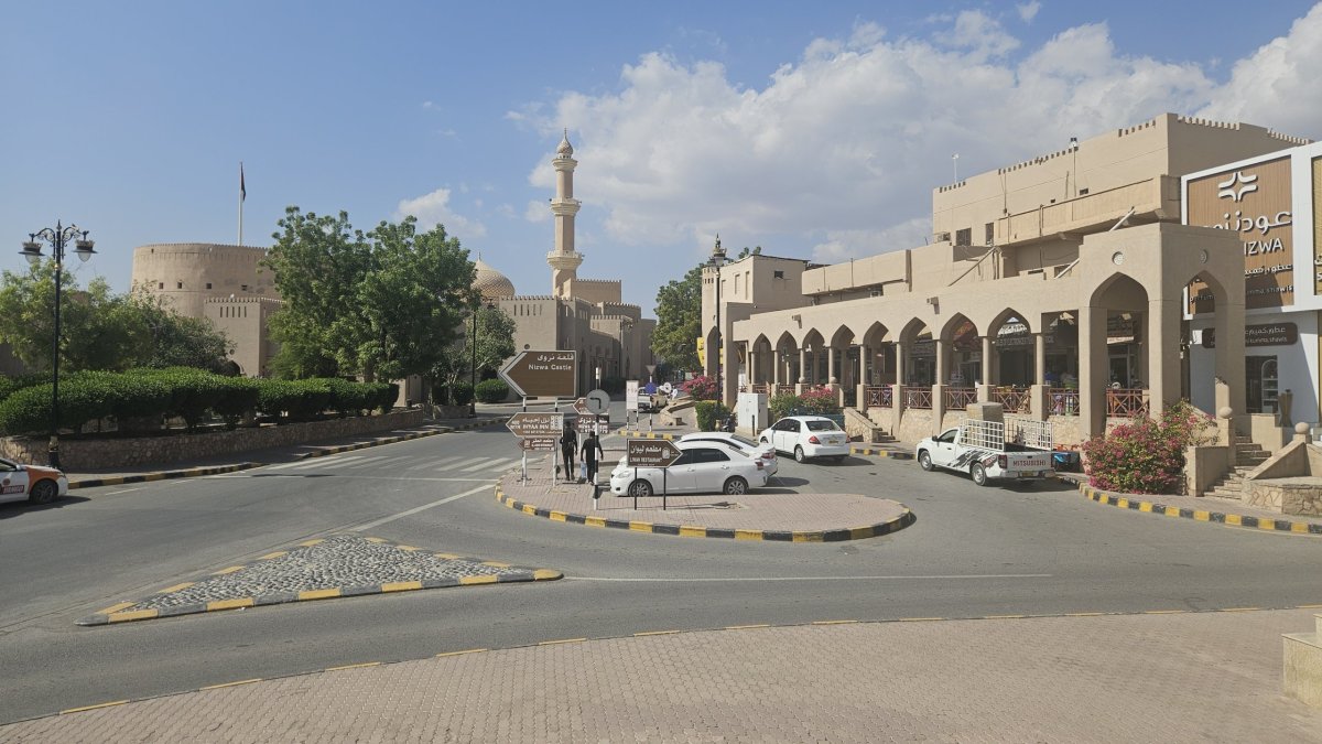Dle map to mám být po dálnici do Nizwy necelé dvě hodiny, my vyrážíme hned po snídani a po pár desítkách kilometrů po páteřním tahu odbočujeme na jih, kde asi 20 kilometrů pokračujeme po luxusním osmipruhu (!). Cesta pod horami rychle ubíhá a někdy okolo poledne parkujeme v centru Nizwy na obrovském a poloprázdném parkovišti v momentálně vyschlém korytu řeky, kousek od historického centra. Nizwa je na seznamu UNESCO a její hlavní turistickou atrakcí je kompletně zrenovovaná rozsáhlá pevnost ze 17. století. Ta je i naším cílem, vstupné je 5 omarů (270 Kč) a návštěva rozhodně stojí za to.