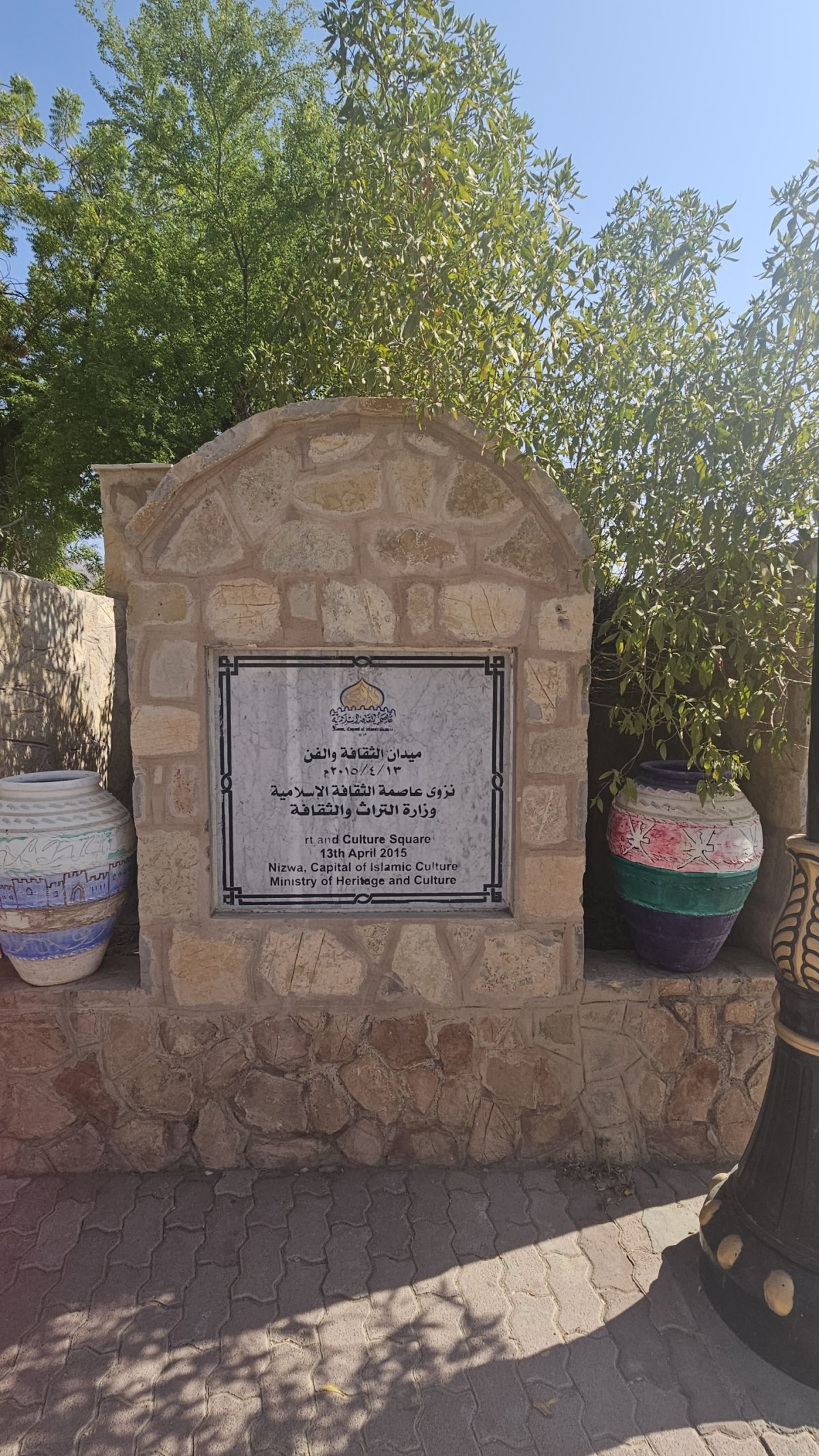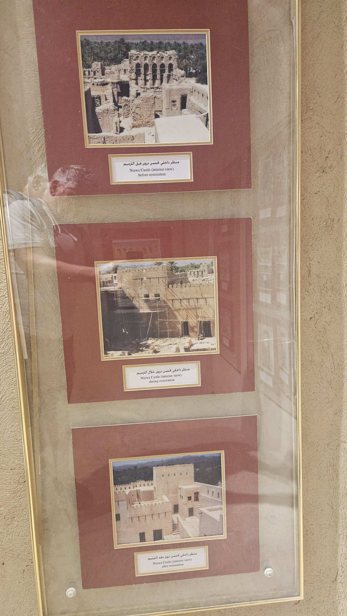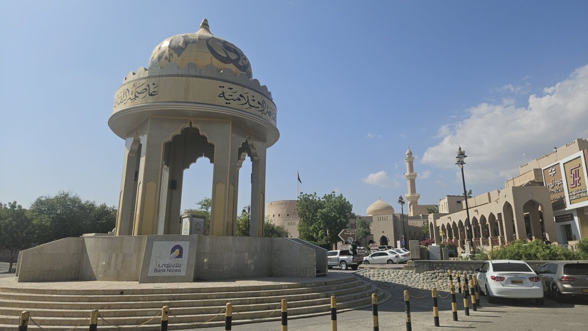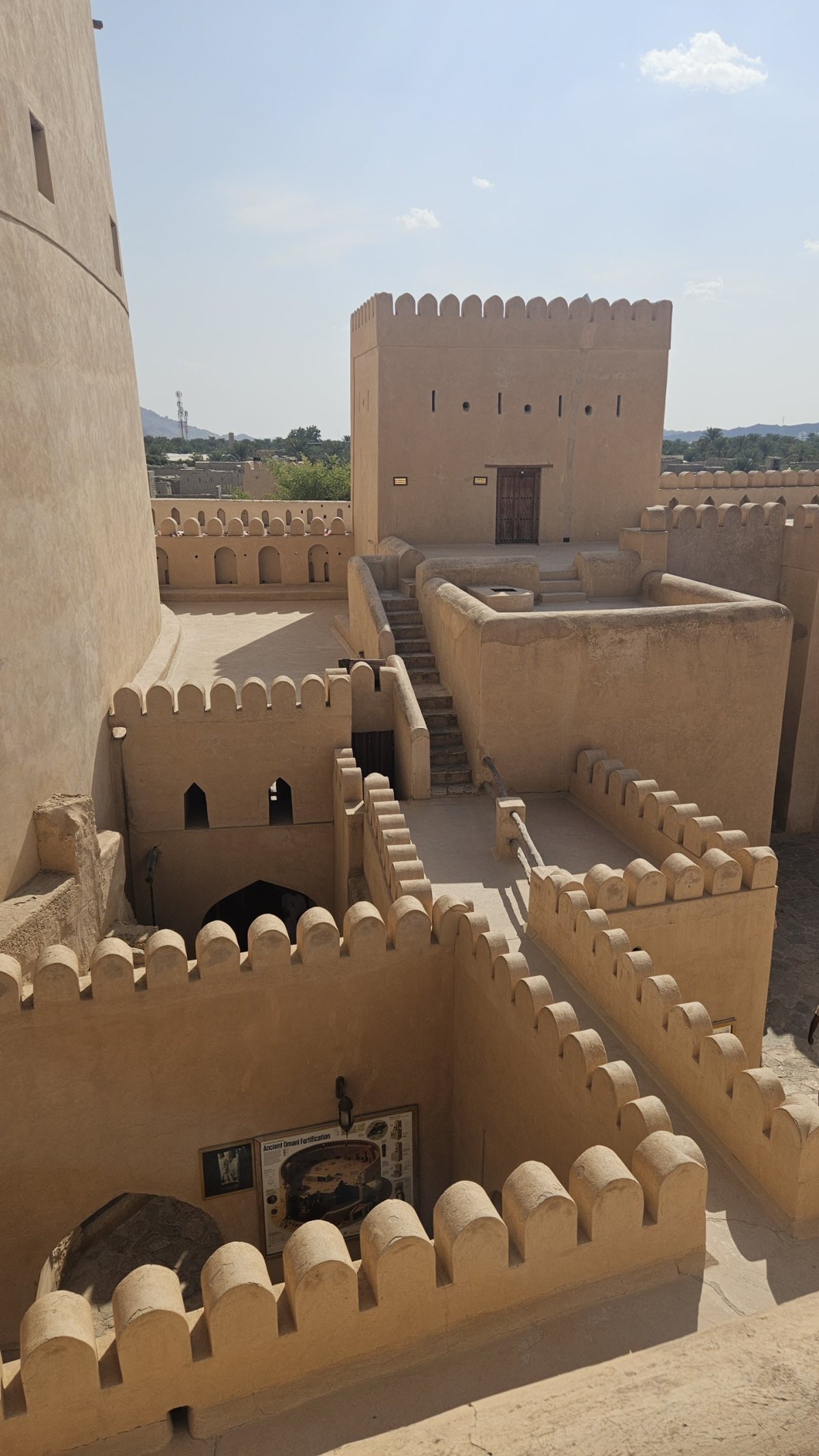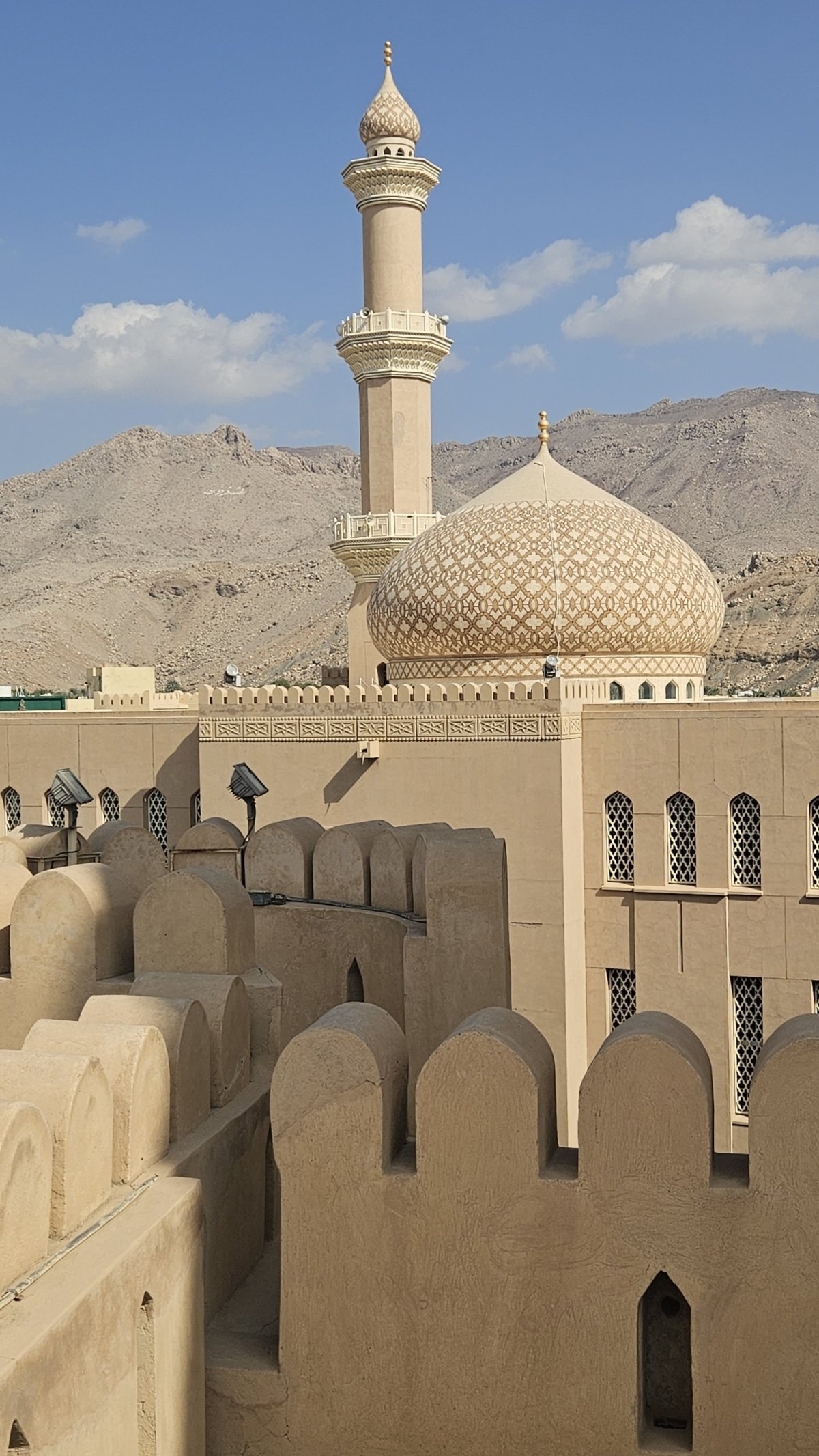 Dle map to mám být po dálnici do Nizwy necelé dvě hodiny, my vyrážíme hned po snídani a po pár desítkách kilometrů po páteřním tahu odbočujeme na jih, kde asi 20 kilometrů pokračujeme po luxusním osmipruhu (!). Cesta pod horami rychle ubíhá a někdy okolo poledne parkujeme v centru Nizwy na obrovském a poloprázdném parkovišti v momentálně vyschlém korytu řeky, kousek od historického centra. Nizwa je na seznamu UNESCO a její hlavní turistickou atrakcí je kompletně zrenovovaná rozsáhlá pevnost ze 17. století. Ta je i naším cílem, vstupné je 5 omarů (270 Kč) a návštěva rozhodně stojí za to.