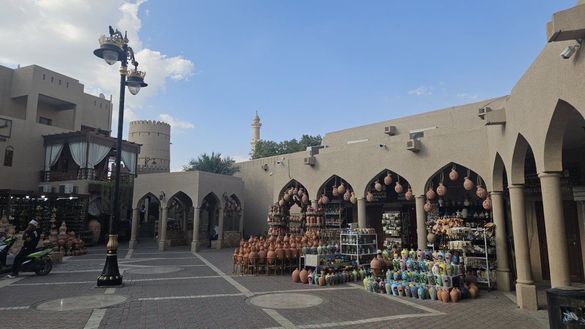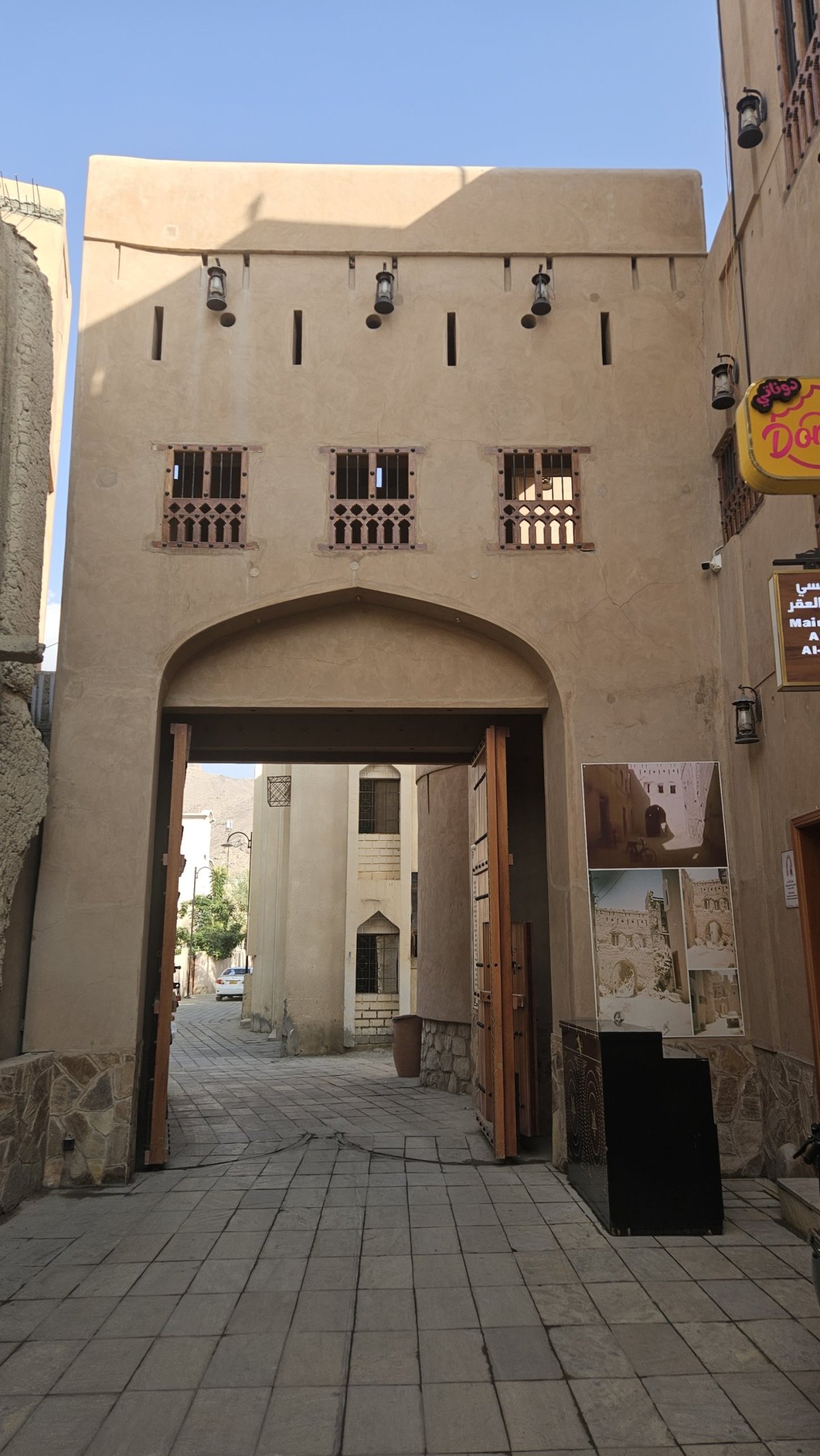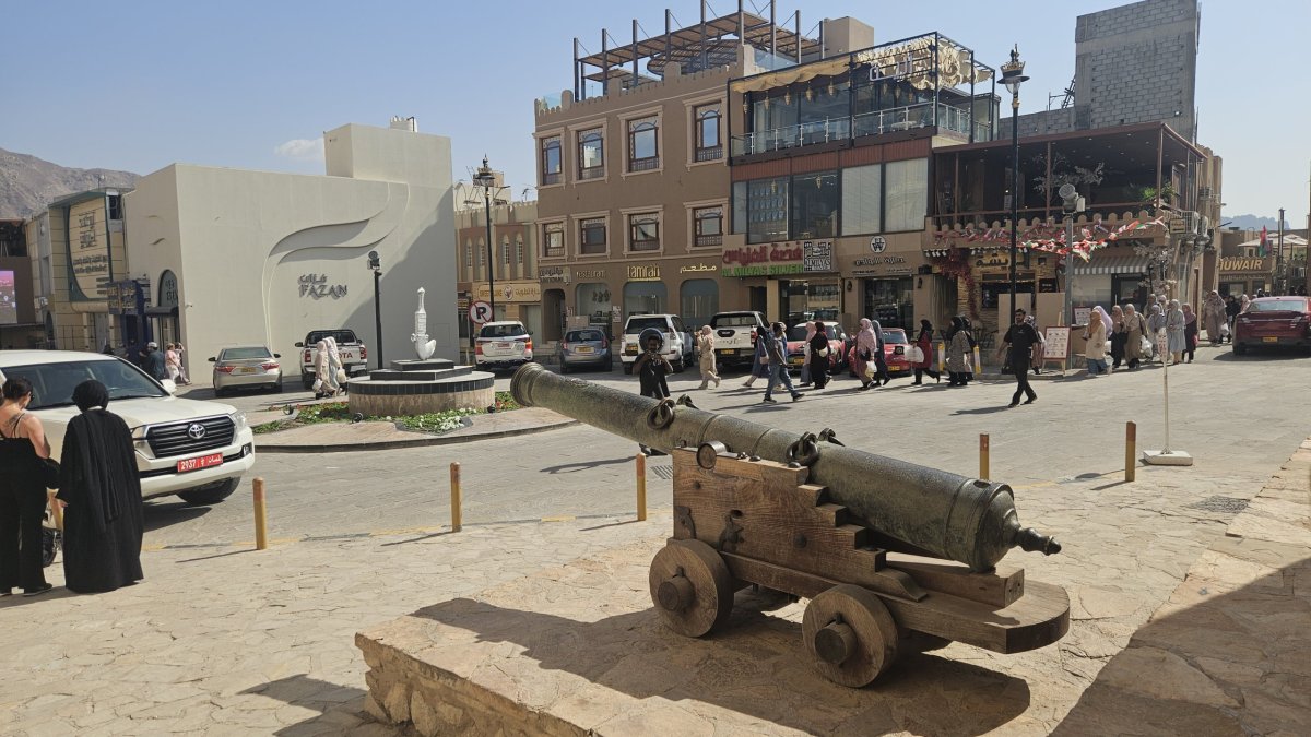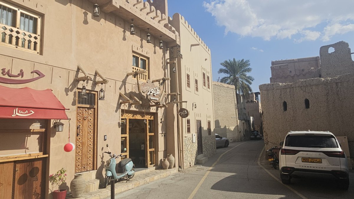 My se po této výjimečné události vydáváme do ulic města. Procházíme místním soukem (trhem), který má být jeden z největších a nejstarších v Ománu. A je překvapivé, že je zde celkem mrtvo, prodávající mají proti návštěvníkům mnohonásobnou přesilu. My kolem stánků plných všemožného zboží jen procházíme, i když se nás všichni prodejci snaží nalákat k návštěvě i koupi. My ale nemáme zájem, návštěvu trhů i časem otravného smlouvání jsme si před lety užili do sytosti v Maroku, takže během deseti minut jsme z trhu venku, v uličkách města, kde kolem všemožných obchodů a krámků jdeme pod místní pevnost skalním výběžku. Tu si jen fotíme zvenčí, případný návštěvník musí u vstupu zaplatit vstupné.