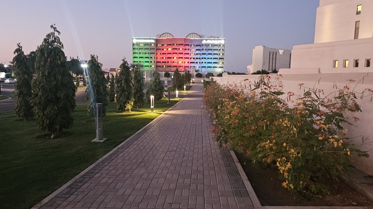 A zjišťujeme, že ceny jsou zde velmi příznivé, u mnoha položek výrazně nižší než u nás. A hlavně, narážíme tam na pult s teplým jídlem, kde si bereme něco na večeři z pestrého výběru, dle pálivosti (zřejmě) indické kuchyně. Kdy se najíme doslova za pár omarů. Po večeři si jdeme vyzkoušet vyhřátý střešní bazén, odkud je parádní výhled na noční město, kterému dominují vládní budovy nasvícené v barvách ománské vlajky. Jedna z nich vlaje i na vysokém stožáru pár set metrů od nás.